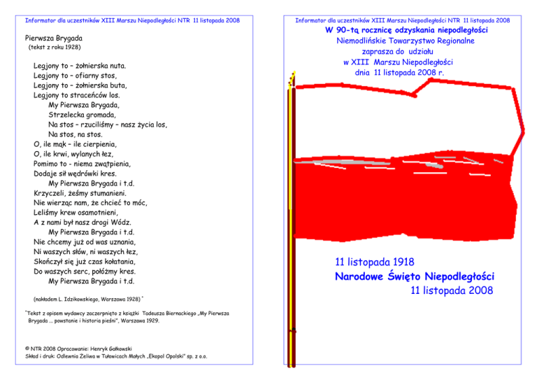 Informator dla uczestników XIII Marszu Niepodległości NTR 11 listopada 2008 Pierwsza Brygada (tekst z roku 1928) Legjony to – Ŝołnierska nuta. Legjony to – ofiarny stos, Legjony to – Ŝołnierska buta, Legjony to straceńców los. My Pierwsza Brygada, Strzelecka gromada, Na stos – rzuciliśmy – nasz Ŝycia los, Na stos, na stos. O, ile mąk – ile cierpienia, O, ile krwi, wylanych łez, Pomimo to - niema zwątpienia, Dodaje sił wędrówki kres. My Pierwsza Brygada i t.d. Krzyczeli, Ŝeśmy stumanieni. Nie wierząc nam, Ŝe chcieć to móc, Leliśmy krew osamotnieni, A z nami był nasz drogi Wódz. My Pierwsza Brygada i t.d. Nie chcemy juŜ od was uznania, Ni waszych słów, ni waszych łez, Skończył się juŜ czas kołatania, Do waszych serc, połóŜmy kres. My Pierwsza Brygada i t.d. (nakładem L. Idzikowskiego, Warszawa 1928) * * Tekst z opisem wydawcy zaczerpnięto z ksiąŜki Tadeusza Biernackiego „My Pierwsza Brygada ... powstanie i historia pieśni”, Warszawa 1929. © NTR 2008 Opracowanie: Henryk Gałkowski Skład i druk: Odlewnia śeliwa w Tułowicach Małych „Ekopol Opolski” sp. z o.o. Informator dla uczestników XIII Marszu Niepodległości NTR 11 listopada 2008 W 90-tą rocznicę odzyskania niepodległości Niemodlińskie Towarzystwo Regionalne zaprasza do udziału w XIII Marszu Niepodległości dnia 11 listopada 2008 r. 11 listopada 1918 Narodowe Święto Niepodległości 11 listopada 2008 Informator dla uczestników XIII Marszu Niepodległości NTR 11 listopada 2008 XIII Marsz Niepodległości 11 listopada 2008 roku (wtorek) * * * * * * * * Ramowy plan dnia: godz. 6.00 – zbiórka uczestników nad Stawem Kuźniczym w Tułowicach Małych; przemarsz grupy przez Lisią Górkę do Sadów i dalej do Niemodlina; godz. 7.15 - złoŜenie kwiatów pod tablicą pamiątkową, poświęconą ofiarom Powiatowego Urzędu Bezpieczeństwa w Niemodlinie; przemarsz grupy przez Niemodlin oraz złoŜenie kwiatów pod pomnikiem Obrońców PrzebraŜa, i dalej przez Lipno do Tułowic; godz. 11.00 - uczestnictwo we Mszy św. w intencji Ojczyzny w kościele p.w. św. Rocha w Tułowicach; godz. 12.15 - złoŜenie kwiatów pod tablicą pamiątkową poświęconą Pamięci Poległych na Frontach Wojen Światowych w Tułowicach i przemarsz grupy na polanę koło leśniczówki św. Huberta w Skarbiszowicach; godz. 14.30 - ognisko, przy ognisku w ramach wpisowego: kiełbasa, bułka, oranŜada; godz. 17.00 - zakończenie imprezy. NaleŜy zabrać ze sobą: * kurtkę z kapturem; * wygodne buty (marsz ok. 15 km); * prowiant na cały dzień. Wpisowe wynosi 5,00 zł. Imprezę organizuje Zarząd NTR Zapraszamy Informator dla uczestników XIII Marszu Niepodległości NTR 11 listopada 2008 „LeŜała pewna niewiasta w letargu, i wezwał syn lekarzy. Rzekli wszyscy lekarze: Wybierz jednego z nas, aby ją leczył. Rzekł jeden lekarz: Ja będę ją leczył podług nauki Browna; ale drudzy odpowiedzieli: Zła to jest nauka, niech lepiej w letargu leŜy i umrze, niŜ gdybyś miał ją leczyć podług Browna. Rzekł drugi: Ja będę ją leczył podług nauki Hanemana; odpowiedzieli drudzy: Zła to nauka, niech lepiej umrze, niŜ gdybyś ja miał leczyć podług nauki Hanemana. Tedy rzekł syn niewiasty: Leczcie jakkolwiek, bylebyście ją wyleczyli. Ale lekarze nie chcieli zgodzić się, jeden Ŝadnym sposobem nie chciał ustąpić drugiemu. Tedy syn z Ŝalem i rozpaczą zawołał: O! matko moja. A niewiasta na ten głos syna obudziła się, i wyzdrowiała. Lekarzów wypędzono. Są z Was niektórzy, którzy mówią: Niech lepiej Polska leŜy w niewoli, niŜ gdyby zbudzić się miała według arystokracji; a drudzy: Niech lepiej leŜy, niŜ gdyby zbudzić się miała według demokracji; a inni: Niech lepiej leŜy, niŜ gdyby miała granice takie, a inni owakie. Ci wszyscy są lekarzami, nie synami, i nie kochają matki Ojczyzny. Zaprawdę powiadam Wam: Nie badajcie jaki będzie rząd w Polsce, dosyć Wam wiedzieć, iŜ będzie lepszy, niŜ wszystkie o których wiecie, ani nie pytajcie o jej granicach, bo większe będą niŜ były kiedykolwiek. A kaŜdy z Was w duszy swej ma ziarno przyszłych praw i miarę przyszłych granic. O ile polepszycie i powiększycie duszę Waszą, o tyle polepszycie prawa Wasze i powiększycie granice Wasze.” * * A.Micliewicz,, Księgi narodu polskiego i pielgrzymstwa polskiego. XX 1-10, Warszawa 1983. Fragment noty edytorskiej Zygmunta Dokurno do Ksiąg narodu polskiego i pielgrzymstwa polskiego: „Księgi narodu i pielgrzymstwa polskiego powstały w ParyŜu w czasie od września do połowy listopada 1832 r. Autograf pierwszej redakcji Ksiąg nosi tytuł Katechizm Pielgrzymstwa Polskiego, znajduje się on w Muzeum Mickiewicza w ParyŜu.”