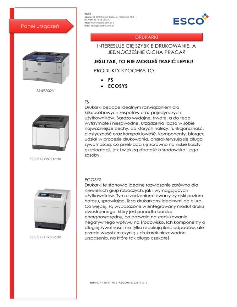 ESCO Panel urządzeń ESCO adres: 43-300 Bielsko-Biała, ul. Piekarska 163 | tel./fax: 33 / 815 00 21, http: www.escobb.com.pl | mail: [email protected] DRUKARKI INTERESUJE CIĘ SZYBKIE DRUKOWANIE, A JEDNOCZEŚNIE CICHA PRACA? JEŚLI TAK, TO NIE MOGŁEŚ TRAFIĆ LEPIEJ! PRODUKTY KYOCERA TO: FS-6970DN ECOSYS P6021cdn ECOSYS P7035cdn FS ECOSYS FS Drukarki będące idealnym rozwiązaniem dla kilkuosobowych zespołów oraz pojedynczych użytkowników. Bardzo wydajne, trwałe, a do tego wytrzymałe i niezawodne. Urządzenia łączą w sobie najważniejsze cechy, do których należy: funkcjonalność, elastyczność oraz kompaktowość. Komponenty, biorące udział w procesie drukowania, charakteryzują się długą żywotnością, co przekłada się zarówno na niskie koszty eksploatacji, jak i większą dbałość o środowisko i jego zasoby. ECOSYS Drukarki te stanowią idealne rozwiązanie zarówno dla niewielkich grup roboczych, jak i wymagających użytkowników. Tym urządzeniom towarzyszy niski poziom hałasu, sprawiając, iż są drukarkami idealnymi do biura. Co więcej, są wyposażone w zintegrowany moduł druku dwustronnego, który jest ponadto bardzo energooszczędny, co pozwala na zredukowanie negatywnego wpływu na środowisko. Ich komponenty o długiej żywotności nie tylko redukują ilość odpadów, ale przede wszystkim czynią z drukarek niezawodne urządzenia, na które tak długo czekałeś. NIP: 937-119-67-75 | REGON: 072317910 | ESCO Panel urządzeń ESCO adres: 43-300 Bielsko-Biała, ul. Piekarska 163 | tel./fax: 33 / 815 00 21, http: www.escobb.com.pl | mail: [email protected] FS TE NIEWIELKIE URZĄDZENIA ZOSTAŁY ZAPROJEKTOWANE Z MYŚLĄ O UŻYTKOWNIKACH CENIĄCYCH SOBIE SZYBKOSĆ WYDRUKU I CICHĄ PRACĘ. 6970DN SZYBKOŚĆ, FUNKCJONALNOŚĆ I KOMPAKTOWOŚĆ TO JEDNE Z WIELU ZALET TYCH PRODUKTÓW MODELE KYOCERA FS TO: C8600DN 1041 1061DN 6970DN 2100D 2100DN 9130DN 4100DN C8600DN 4200DN 9530DN C8650DN 4300DN SZYBKIE 1061DN Szybkość wydruku wynosi od 20 do 60 stron A4 na minutę FUNKCJONALNE Dodatkowe kasety na 500 arkuszy. Możliwość podłączenia przez kartę sieciową lub USB. 6 źródeł papieru, które zapewniają do 1350 stron. Automatyczne drukowanie dwustronne w standardzie. 2100D NIP: 937-119-67-75 | REGON: 072317910 | ESCO Panel urządzeń ESCO adres: 43-300 Bielsko-Biała, ul. Piekarska 163 | tel./fax: 33 / 815 00 21, http: www.escobb.com.pl | mail: [email protected] WYDAJNE Bardzo niskie koszty eksploatacji oraz komponenty o długiej żywotności powodują, że drukarki FS to idealne rozwiązania dla użytkowników, którzy wymagają od urządzenia długiej i oszczędnej pracy. 9130DN BEZPIECZNE Certyfikat SSL oraz moduł ochrony danych (Data Security Kit E) gwarantują wysokie bezpieczeństwo wydruku. EFEKTOWNE 4100DN Wyświetlacz LCD wraz z alfanumeryczną klawiaturą ułatwiają obsługę urządzenia oraz wpływają korzystnie na design drukarek. Do tego kompaktowy rozmiar sprawia, że drukarki FS świetnie pasują do wnętrza każdej firmy. EFEKTYWNE Duża pojemność wejściowa i wyjściowa papieru umożliwia nieprzerwaną pracę przy dużych nakładach dokumentów.* *dotyczy modelów C8600DN i C8650DN. 9530DN KOMPATYBILNE Urządzenia FS są w pełni kompatybilne z takimi systemami operacyjnymi jak: Windows, Macintosh 4300DN NIP: 937-119-67-75 | REGON: 072317910 | ESCO Panel urządzeń ESCO adres: 43-300 Bielsko-Biała, ul. Piekarska 163 | tel./fax: 33 / 815 00 21, http: www.escobb.com.pl | mail: [email protected] ECOSYS TE URZĄDZENIA TO DYSKRETNE, WYSOKOWYDAJNE I NIEZAWODNE ROZWIĄZANIE DLA TWOJEGO BIURA . OSZCZĘDNOŚĆ, WYDAJNOŚĆ I NIEZAWODNOŚĆ TO JEDNE Z WIELU ZALET TYCH PRODUKTÓW MODELE KYOCERA ECOSYS TO: P6021CDN P6021CDN P6026CDN P6030CDN P6130CDN P2035D P2135D P2135DN P7035CDN P6035CDN P4040DN SZYBKIE P6030CDN Szybkość wydruku wynosi od 21 do 40 stron A4 na minutę i 22 stron A3 na minutę w rozdzielczości 1200 dpi. FUNKCJONALNE P2135D Wykorzystanie zintegrowanego modułu druku dwustronnego w standardzie. Możliwość wyposażenia w 5 dodatkowych podajników papieru. Podajnik kasetowy na 500 arkuszy. NIP: 937-119-67-75 | REGON: 072317910 | ESCO Panel urządzeń ESCO adres: 43-300 Bielsko-Biała, ul. Piekarska 163 | tel./fax: 33 / 815 00 21, http: www.escobb.com.pl | mail: [email protected] WYDAJNE Wydajny procesor 1 GHz oraz 1 GB pamięci RAM gwarantują działanie drukarek na wysokim poziomie oraz sprostanie oczekiwaniom nawet najbardziej wymagającym użytkownikom. NOWOCZESNE P2135dn Wykorzystując nowoczesne technologie, takich jak: drukowanie mobilne, technologia Multibit, czy drukowanie dwustronne i typu „N-up” urządzenia ECOSYS gwarantują wysoką efektywność swoich działań. OSZCZĘDNE Wyjątkowo niskie koszty druku oraz niski poziom hałasu podczas drukowania to skuteczne rozwiązanie dla firm. P7035cdn BEZPIECZNE Produkty te zapewniają wysokie bezpieczeństwo poprzez wykorzystanie takich zastosowań jak: SSL, IPsec oraz Wydruk Prywatny. EFEKTOWNE P6035cdn Ładny wygląd oraz kompaktowy rozmiar bardzo dobrze wpływają na design drukarki, zarówno w firmie jak i w zaciszu domowym. NIP: 937-119-67-75 | REGON: 072317910 |
