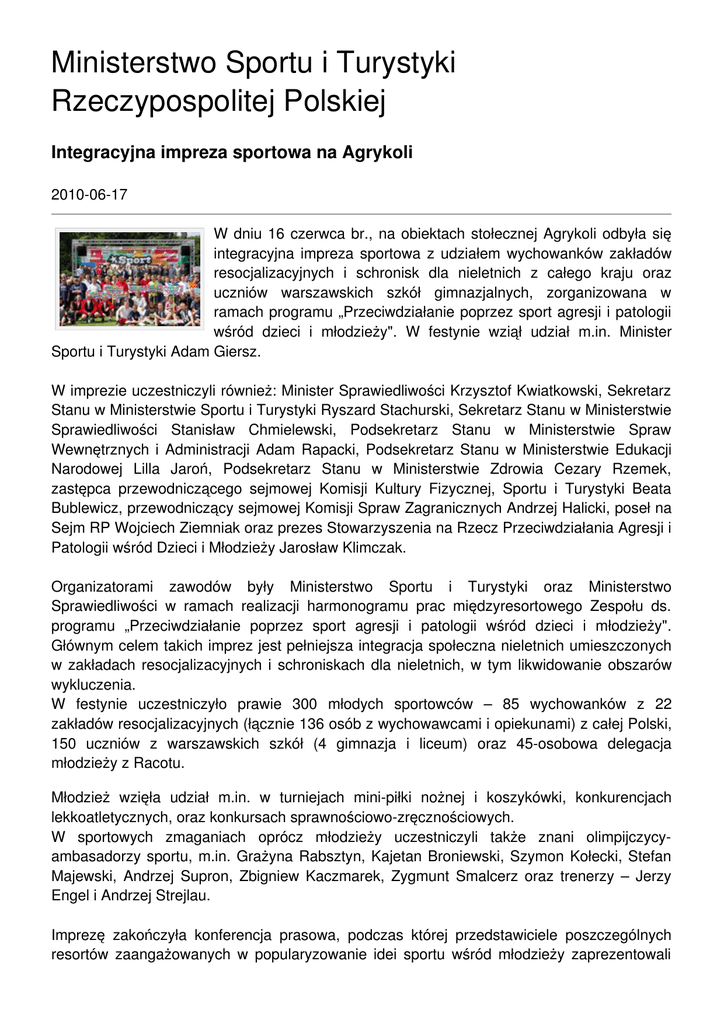 Ministerstwo Sportu i Turystyki Rzeczypospolitej Polskiej Integracyjna impreza sportowa na Agrykoli 2010-06-17 W dniu 16 czerwca br., na obiektach stołecznej Agrykoli odbyła się integracyjna impreza sportowa z udziałem wychowanków zakładów resocjalizacyjnych i schronisk dla nieletnich z całego kraju oraz uczniów warszawskich szkół gimnazjalnych, zorganizowana w ramach programu „Przeciwdziałanie poprzez sport agresji i patologii wśród dzieci i młodzieży". W festynie wziął udział m.in. Minister Sportu i Turystyki Adam Giersz. W imprezie uczestniczyli również: Minister Sprawiedliwości Krzysztof Kwiatkowski, Sekretarz Stanu w Ministerstwie Sportu i Turystyki Ryszard Stachurski, Sekretarz Stanu w Ministerstwie Sprawiedliwości Stanisław Chmielewski, Podsekretarz Stanu w Ministerstwie Spraw Wewnętrznych i Administracji Adam Rapacki, Podsekretarz Stanu w Ministerstwie Edukacji Narodowej Lilla Jaroń, Podsekretarz Stanu w Ministerstwie Zdrowia Cezary Rzemek, zastępca przewodniczącego sejmowej Komisji Kultury Fizycznej, Sportu i Turystyki Beata Bublewicz, przewodniczący sejmowej Komisji Spraw Zagranicznych Andrzej Halicki, poseł na Sejm RP Wojciech Ziemniak oraz prezes Stowarzyszenia na Rzecz Przeciwdziałania Agresji i Patologii wśród Dzieci i Młodzieży Jarosław Klimczak. Organizatorami zawodów były Ministerstwo Sportu i Turystyki oraz Ministerstwo Sprawiedliwości w ramach realizacji harmonogramu prac międzyresortowego Zespołu ds. programu „Przeciwdziałanie poprzez sport agresji i patologii wśród dzieci i młodzieży". Głównym celem takich imprez jest pełniejsza integracja społeczna nieletnich umieszczonych w zakładach resocjalizacyjnych i schroniskach dla nieletnich, w tym likwidowanie obszarów wykluczenia. W festynie uczestniczyło prawie 300 młodych sportowców – 85 wychowanków z 22 zakładów resocjalizacyjnych (łącznie 136 osób z wychowawcami i opiekunami) z całej Polski, 150 uczniów z warszawskich szkół (4 gimnazja i liceum) oraz 45-osobowa delegacja młodzieży z Racotu. Młodzież wzięła udział m.in. w turniejach mini-piłki nożnej i koszykówki, konkurencjach lekkoatletycznych, oraz konkursach sprawnościowo-zręcznościowych. W sportowych zmaganiach oprócz młodzieży uczestniczyli także znani olimpijczycyambasadorzy sportu, m.in. Grażyna Rabsztyn, Kajetan Broniewski, Szymon Kołecki, Stefan Majewski, Andrzej Supron, Zbigniew Kaczmarek, Zygmunt Smalcerz oraz trenerzy – Jerzy Engel i Andrzej Strejlau. Imprezę zakończyła konferencja prasowa, podczas której przedstawiciele poszczególnych resortów zaangażowanych w popularyzowanie idei sportu wśród młodzieży zaprezentowali swój wkład w rozwój programu. – Sport to nie tylko rywalizacja o medale i punkty – stwierdził Minister Sportu i Turystyki Adam Giersz. – Niezwykle istotne są aspekty edukacyjne i walory społeczne. Sport odgrywa ważną rolę w działaniach naszego rządu. Ministerstwo Sportu i Turystyki składa podziękowania: Polskiemu Związkowi Piłki Siatkowej, Polskiemu Związkowi Piłki Nożnej, Polskiemu Związkowi Koszykówki, Związkowi Piłki Ręcznej w Polsce, Polskiemu Związkowi Towarzystw Wioślarskich, Polskiemu Związkowi Narciarskiemu, Polskiemu Komitetowi Olimpijskiemu oraz Polskiej Organizacji Turystycznej, za przekazanie upominków sportowych dla uczestników imprezy na Agrykoli.
