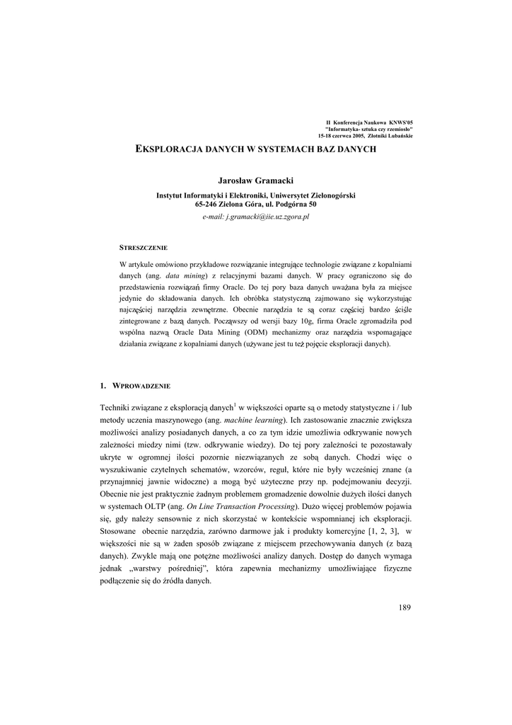 II Konferencja Naukowa KNWS'05 "Informatyka- sztuka czy rzemiosáo" 15-18 czerwca 2005, Záotniki LubaĔskie EKSPLORACJA DANYCH W SYSTEMACH BAZ DANYCH Jarosław Gramacki Instytut Informatyki i Elektroniki, Uniwersytet Zielonogórski 65-246 Zielona Góra, ul. Podgórna 50 e-mail: [email protected] STRESZCZENIE W artykule omówiono przykładowe rozwi zanie integruj ce technologie zwi zane z kopalniami danych (ang. data mining) z relacyjnymi bazami danych. W pracy ograniczono si do przedstawienia rozwi za firmy Oracle. Do tej pory baza danych uwa ana była za miejsce jedynie do składowania danych. Ich obróbka statystyczn zajmowano si wykorzystuj c najcz ciej narz dzia zewn trzne. Obecnie narz dzia te s coraz cz ciej bardzo ci le zintegrowane z baz danych. Pocz wszy od wersji bazy 10g, firma Oracle zgromadziła pod wspólna nazw Oracle Data Mining (ODM) mechanizmy oraz narz dzia wspomagaj ce działania zwi zane z kopalniami danych (u ywane jest tu te poj cie eksploracji danych). 1. WPROWADZENIE Techniki związane z eksploracją danych1 w większości oparte są o metody statystyczne i / lub metody uczenia maszynowego (ang. machine learning). Ich zastosowanie znacznie zwiększa możliwości analizy posiadanych danych, a co za tym idzie umożliwia odkrywanie nowych zależności miedzy nimi (tzw. odkrywanie wiedzy). Do tej pory zależności te pozostawały ukryte w ogromnej ilości pozornie niezwiązanych ze sobą danych. Chodzi więc o wyszukiwanie czytelnych schematów, wzorców, reguł, które nie były wcześniej znane (a przynajmniej jawnie widoczne) a mogą być użyteczne przy np. podejmowaniu decyzji. Obecnie nie jest praktycznie żadnym problemem gromadzenie dowolnie dużych ilości danych w systemach OLTP (ang. On Line Transaction Processing). Dużo więcej problemów pojawia się, gdy należy sensownie z nich skorzystać w kontekście wspomnianej ich eksploracji. Stosowane obecnie narzędzia, zarówno darmowe jak i produkty komercyjne [1, 2, 3], w większości nie są w żaden sposób związane z miejscem przechowywania danych (z bazą danych). Zwykle mają one potężne możliwości analizy danych. Dostęp do danych wymaga jednak „warstwy pośredniej”, która zapewnia mechanizmy umożliwiające fizyczne podłączenie się do źródła danych. 189 Dużo lepszym rozwiązaniem jest implementacja algorytmów eksploracji danych bezpośrednio w bazie danych (czyli maksymalnie blisko miejsca przechowywania danych). Rozwiązanie takie bardzo ułatwia realizowanie zadań typowych dla data mining w ogólnie pojętych aplikacjach bazodanowych. Przykładem rozwiązania implementującego algorytmy eksploracyjne bezpośrednio w bazie danych jest Oracle Data Mining (ODM) [4, 5]. Korzystając z ODM wszystkie etapy procesu ekspolarcji danych mają miejsce w bazie danych i wykonywane są tymi samymi narzędziami, które wykorzystywane są do obsługi baz relacyjnych. Przykładowo pisząc aplikację bazodanową w języku PL/SQL (uznany standard firmy Oracle) istnieje możliwość wywoływania w niej odpowiednich funkcji, również PL/SQL-owych, które implementują wybrany algorytm eksploracyjny. Wyniki tak przeprowadzanych analiz przechowywane są dalej w zwykły dla bazy danych sposób czyli w postaci tabel relacyjnych. Stamtąd też mogą być łatwo pobierane do dalszej analizy i / lub prezentacji wyników. 2. MODELE EKSPLORACYJNE W BAZIE DANYCH Nadrzędnym celem osadzenia algorytmów eksploracyjnych wprost w bazie danych jest umożliwienie aplikacji bazodanowej budowanie modelu eksploracyjnego (ang. data mining model) bezpośrednio z danych źródłowych pobieranych z tejże bazy. Poniżej wymieniono dostępne w ODM modele wraz z krótką ich charakterystyką oraz stosowanymi algorytmami. Z uwagi na powszechnie używaną terminologię angielską, postanowiono pozostać przy oryginalnym nazewnictwie. Dostępne w ODM algorytmy podzielono na dwie grupy: algorytmy uczenia z nadzorem (ang. supervised learning algorithms) i algorytmy uczenia bez nadzoru (ang. unsupervised learning algorithms). Odpowiadające tym dwóm grupom algorytmów modele eksploracyjne nazywane są odpowiednio modelami predykcyjnymi (ang. Predictive Data Mining Models) i modelami opisowymi (ang. Descriptive Data Mining Models). Tab. 1. Metody i algorytmy eksploracyjne dost pne w ODM Funkcja Classification Regression 1 190 Algorytmy uczenia z nadzorem, modele predykcyjne Algorytm(y) Krótki opis Naive Bayes (NB) Budowa modelu (np. drzewo decyzyjne, reguła logiczna) na Adaptive Bayes Network (ABN) bazie danych historycznych (tzw. dane treningowe). Support Vector Machine (SVM) Utworzony model wykorzystywany jest nast pnie do klasyfikacji nowych napływaj cych danych według zało onych reguł lub do gł bszego rozumienia istniej cych w nim zale no ci. Przykład reguły logicznej: IF WIEK>30 AND DOCHOD = Wysoki THEN 90% Pewno ci, e ... Support Vector Machine (SVM) Model podobny do klasyfikatora. Operuje na danych o atrybutach numerycznych i ci głych (klasyfikacja wymaga atrybutów o warto ciach zkategoryzowanych i dyskretnych). Najcz ciej u ywana jest regresja liniowa, w której wyliczany jest odcinek prosty, który mo liwie najlepiej (w W literaturze cz sto poj cia kopalnie danych oraz eksploracja danych stosowane s zamiennie. Attribute Importance Clustering Association Feature Extraction Text Mining ustalonym sensie) dopasowuje si do danych. Szukanie w ród dost pnych danych tzw. atrybutów predykcyjnych, które posiadaj najwi kszy wpływ na analizowany atrybut celowy (ang. target attribute). Na przykład jakie dane osobowe klienta (atrybuty predykcyjne) najbardziej wpływaj na decyzj klienta o zakupie samochodu marki VW (atrybut celowy: kupił / nie kupił). Algorytmy uczenia bez nadzoru, modele opisowe Enhanced k-means Szukanie naturalnych grup w ród posiadanego zbioru Orthogonal Clustering danych. Na przykład grupowanie klientów banku jako (O-Cluster)2 potencjalnych zainteresowanych danymi usługami. Apriori Algorithm 