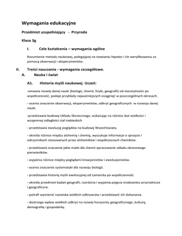 Wymagania edukacyjne Przedmiot uzupełniający - Przyroda Klasa 3g I. Cele kształcenia – wymagania ogólne Rozumienie metody naukowej, polegającej na stawianiu hipotez i ich weryfikowaniu za pomocą obserwacji i eksperymentów. II. Treści nauczania - wymagania szczegółowe. A. Nauka i świat A1. Historia myśli naukowej. Uczeń: -omawia rozwój danej nauki (biologii, chemii, fizyki, geografii) od starożytności po współczesność, podaje przykłady najważniejszych osiągnięć w poszczególnych okresach. - ocenia znaczenie obserwacji, eksperymentów, odkryć geograficznych w rozwoju danej nauki. -przedstawia budowę Układu Słonecznego, wskazując na różnice skal wielkości i wzajemnej odległości ciał niebieskich - przedstawia ewolucję poglądów na budowę Wszechświata. - określa różnice między alchemią i chemią, wyszukuje informacje o sprzęcie i odczynnikach stosowanych przez alchemików i współczesnych chemików. - przedstawia znaczenie jakie miało dla chemii opracowanie układu okresowego pierwiastków. - wyjaśnia różnice między poglądami kreacjonistów i ewolucjonistów. - ocenia znaczenie systematyki dla rozwoju biologii. - przedstawia historię myśli ewolucyjnej od Lamarcka po współczesność. - określa przedmiot badań geografii, rozróżnia i wyjaśnia pojęcia środowisko przyrodnicze i geograficzne. - potrafi wymienić nazwiska wielkich odkrywców i przedstawić ich dokonania. - dostrzega wpływ wielkich odkryć na rozwój horyzontu geograficznego ,kulturę, demografię i gospodarkę. B. Nauka wokół nas. B1. Cykle, rytmy, czas. Uczeń: - wymienia zjawiska okresowe w przyrodzie będące podstawą kalendarza i standardu czasu - wyjaśnia związek między ruchem obiegowym Ziemi a istnieniem stref oświetlenia Ziemi i pór roku. - rozróżnia pory roku astronomiczne, kalendarzowe, klimatyczne. - wyjaśnia związek między ruchem wirowym Ziemi a występowaniem zjawiska dnia i nocy oraz różnic czasu na Ziemi. - rozróżnia i wyjaśnia pojęcia czasu słonecznego, strefowego, urzędowego, linii zmiany daty. - potrafi obliczyć różnicę czasu miejscowego między miastami leżącymi na różnych południkach. - przedstawia różnice między kalendarzem juliańskim i gregoriańskim. - omawia dobowy rytm aktywności człowieka i analizuje wpływ sytuacji zaburzających działanie zegara biologicznego. - wyjaśnia na czym polega sezonowa aktywność zwierząt i fotoperiodyzm roślin. B2. Zdrowie. Uczeń: -zna budowę kręgosłupa i potrafi wyjaśnić przy pomocy praw fizyki jak dochodzi do urazów i jak im zapobiegać. -wymienia mechanizmy utraty ciepła przez organizm. Wyjaśnia rolę ubioru w wymianie ciepła między ciałem ludzkim a otoczeniem. - zna chemiczne składniki podstawowych produktów roślinnych i zwierzęcych oraz ich wpływ na zdrowie. - potrafi wyjaśnić na czym polegają przemiany metaboliczne w organizmie człowieka i wie jakich produktów unikać aby obniżyć poziom cholesterolu LDL -wyszukuje informacje na temat rodzajów narkotyków ich składu chemicznego, pochodzenia i działania na organizm. - wyszukuje informacje na temat dopalaczy, ich składu chemicznego i działania na organizm. -analizuje ulotkę leku i omawia podane w niej informacje. - analizuje wpływ czynników wewnętrznych i zewnętrznych na zdrowie. - rozróżnia choroby społeczne, cywilizacyjne, tropikalne. -potrafi podać czynniki sprzyjające zachorowaniom na niektóre choroby oraz sposoby zapobiegania im. B3. Piękno i uroda . Uczeń: - podaje przykłady ponadkulturowych wzorców piękna(proporcje ciała, symetria twarzy itp.) - przedstawia kulturowe i cywilizacyjne uwarunkowania i przemiany kanonów piękna - przedstawia wykorzystanie produktów pochodzenia roślinnego i zwierzęcego w pielęgnacji urody. - omawia typy substancji chemicznych stosowanych w kosmetykach. - rozróżnia typy krajobrazu (pierwotny, naturalny, kulturowy) - analizuje piękno krajobrazu i rolę człowieka w jego kształtowaniu. - Podaje przykłady obszarów o szczególnych walorach krajobrazowych na świecie i w Polsce.