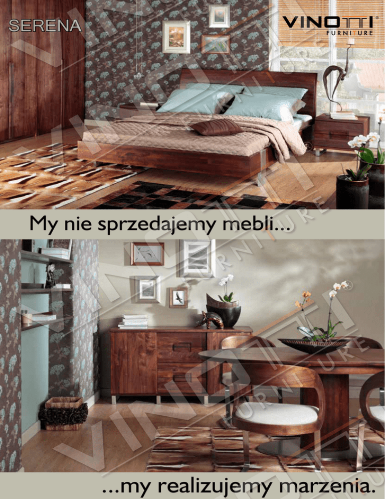 SERENA My nie sprzedajemy mebli... ...my realizujemy marzenia. SERENA SRN 02 stolik nocny / night stand s/w 500; g/d 395; w/h 477 mm SRN 01 łóżko 160x200 / bed 160x200 d/l 2185; s/w 1680; w/h 1000 mm SRN 13 bufet / buffet s/w 1096; g/d 390; w/h 1394 mm SRN 01A łóżko 180x200 / bed 180x200 d/l 2185; s/w 1880; w/h 1000 mm SRN 04 lustro / mirror s/w 970; g/d 20; w/h 690 mm SRN 12 witryna / cabinet s/w 905; g/d 385; w/h 1950 mm SRN 05 lustro / mirror s/w 725; g/d 35; w/h 932 mm SRN 07 stół rozkładany / extending dining table d/l 1600/2000; s/w 936; w/h 766 mm SRN 11 komoda / chest s/w 1502; g/d 450; w/h 864 mm SRN 10 krzesło / chair s/w 585; g/d 565; w/h 875 mm SRN 03 komoda / chest s/w 1080; g/d 450; w/h 880 mm SRN 08 stół rozkładany / extending dining table d/l 1496/1896; s/w 958; w/h 771 mm SRN 09 krzesło / chair s/w 530; g/d 560; w/h 910 mm SRN 15 komoda TV / TV unit s/w 1680; g/d 450; w/h 500 mm SRN 17 stolik / coffee table d/l 1190; s/w 590; w/h 400 mm SRN 14 komoda TV / TV unit s/w 1680; g/d 490; w/h 300 mm SRN 16 stolik / coffee table d/l 1400; s/w 700; w/h 450 mm Wejdź na stronę www.vinotti.eu - w planerze 3D szybko zaaranżujesz pokój idealnie dopasowany do Twoich potrzeb. SRN 06 szafa 3-drzwiowa / 3 door wardrobe s/w 1356; g/d 600; w/h 2100 mm Vinotti Sp. z o.o. S.K.A., ul. Zawiła 65e, 30-390 Kraków tel. +48 12 260 95 30, fax +48 12 262 02 84 e-mail: [email protected], www.vinotti.eu Właścicielem znaku towarowego Vinotti Furniture jest Firma Vinotti Sp. z o.o. S.K.A. Firma Vinotti zastrzega sobie prawo do błędów edytorskich. Zdjęcia produktów mogą nieznacznie odbiegać od rzeczywistości. Podane wymiary są wartościami zewnętrznymi. Niniejszy katalog nie stanowi oferty w rozumieniu prawnym i jest publikowany jedynie w celach informacyjnych.