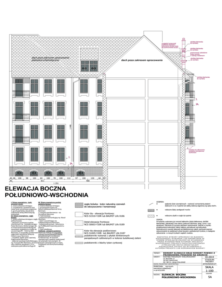 obróbka blacharska do wymiany uwzględnić konieczność przełożenia dachówki i odtworzenia obróbek kosza dla przemurowania szczytu obróbka blacharska do wymiany przemurować uszkodzone ściany szczytu o wykroju wolutowym dach poza zakresem opracowania pokazano schematycznie obróbka blacharska do wymiany dach poza zakresem opracowania O-3 O-3 obróbka blacharska do wymiany I. 1 446 IA. kroksztyn do odtworzeniasztukateria styropianowa otynkowana I. IA. O-4 40 48 40 100 O-4 98 100 O-4 84 811 100 O-4 70 100 O-4 112 97 100 130 60 13 400 1 251 ELEWACJA BOCZNA POŁUDNIOWO-WSCHODNIA ELEWACJA FRONTOWA - UL. BOCZNA 11 I. Ściana zewnętrzna - tynk: IB. Ściana zewnętrzna poniżej II. Ściana wewnętrzna piwnic powyżej cokołu poziomu terenu: 1. ściana właściwa istniejąca cegła licówka - kolor naturalna czerwień 1. ściana właściwa istniejąca 1. ściana właściwa istniejąca 2. obrzutka np. Vorspritzmortel do odczyszczenia i konserwacji 2. uzupełnienia i przetarcia oraz 2. gruntowanie ściany np. Remmers nowe tynki cementowo-wapienne Kiesol+Sulfatexschlamme firmy 3 podkład tynkarski np. Grundputz 3. grunt pod farbę i dwukrotne Rammers Remmers malowanie farbą silikonową wg 3. warstwa wyrównawcza - np. 4. Tynk renowacyjny np. Sanierputz Kolor tła - elewacja frontowa: kolorystyki GrundPutz Rammres Remmers IA. Ściana zewnętrzna - cegła 4. Hydroizolacja: 4. grunt pod farbę i dwukrotne NCS S1510-Y20R lub BAUMIT Life 0186 licowa: - preparat krzemionkujący np. Kiesol malowanie farbą silikonową lub 1. ściana właściwa istniejąca z cegły Rammers akrylową wg kolorystyki pełnej licowej: - szlam uszczelniający np. IIa. Ściana wewnętrzna piwnic przy Detal-elewacja frontowa: - odczyścić za pomocą czyściw Sulfatexschlamme Rammers ścianie z sąsiadem chemicznych np. Fassadenreiniger- - izolacja polimerowo - bitumiczna 1. ściana właściwa istniejąca NCS S0603-Y20R lub BAUMIT Life 0189 Paste Remmers, Klinkerreiniger AC, np ProfiBaudicht (poniżej poziomu 2. gruntowanie ściany np. w miejscachzamalowańlub grafi terenu) Kiesol+Sulfatexschlamme firmy zasosować niealkaliczny środek do 5. folia kubełkowa Rammers usuwaniagraffi i farb np AGE Iniekacja - przepona pozioma 3. warstwa wyrównawczaKolor - np. tła elewacje podówrzowe: Remmers, w przypadku przebarwień Wykonać iniekcję we wszystkich GrundPutz Rammres NCS S1005-Y20R lub BAUMIT Life 0187 cegły kolor wyrównać farbą np. ścianach konstrukcyjnych piwnic 4. Hydroizolacja: podokienniki wykonać z płytek klinkierowych Historic Lasur Remmers (posadowionych na własnym - preparat krzemionkujący np. Kiesol - uzupełnić ubytki spoin zaprawą fundamencie). W ścianach Rammers parepetowych szkliwionych w kolorze butelkowej zieleni Fugenmörtel Remmers zewnętrznych nawierty wykonywać - szlam uszczelniający np. - wykonać warstwę hydrofobizującą od wewnątrz lub zewnątrz. W Sulfatexschlamme Rammers np. Funcosil SNL Remmers, od stronyścianach wewnętrznych w miarę 5. obrzutka np. Vorspritzmortel podokienniki z blachy tytan cynkowej ulicy cokół do wysokości 2, 0 m możliwości od strony komunikacji Remmers zabezpieczyćśrodkiemantygrafi ogólnej. 6 podkład tynkarski np. Grundputz Remmers 7. Tynk renowacyjny np. Sanierputz Remmers 8. grunt pod farbę i dwukrotne malowanie farbą silikonową lub akrylową wg kolorystyki LEGENDA: ● spękania ścian zewnętrznych - wykonać wzmocnienia prętami stalowymi w co 3 spoinie lub siatką stalową ciągnioną wg opisu techn. ● widoczne ślady zawilgoceń murów ● widoczne ubytki w cegle lub spoinie UWAGA: W budynku wykonano już remont balkonów (płyta balkonowa, obróbki blacharskie, balustrady) oraz dachu (pokrycie dachowe, okap, rynny i rury spustowe). Elementy te są poza zakresem opracowania. Jedynie w wyniku projektowanej kolorystyki należy balkony pomalować wg kolorystyki. Geometryczny rysunek dekoracji architektonicznej należy zachować poprzez odwzorowanie na szablonach przed skuciem uszkodzonych tynków, a następnie odtworzenie w nowych tynkach wąskich rowków. WSZYSTKIE WYMIARY SPRAWDZIĆ NA BUDOWIE! NIEZGODNOŚCI WYMIARÓW LUB PARAMETRÓW ZE STANEM ISTNIEJĄCYM ZGŁOSIĆ DO WYJAŚNIENIA PRZED WYKONASTWEM AUTOROWI PROJEKTU! NIEZGODNOŚCI PROJEKTU ARCHITEKTONICZNEGO Z PROJEKTAMI INNYCH BRANŻ NALEŻY NIEZWŁOCZNIE ZGŁOSIĆ DO WYJAŚNIENIA Z AUTOREM PROJEKTU LUB KIEROWNIKIEM BUDOWY! TEMAT: OBIEKT: REMONT ELEWACJI ORAZ REMONT PIWNIC Z PRZEBUDOWĄ POSADZKI NA GRUNCIE BUDYNEK MIESZKALNY WIELORODZINNY UL.BOCZNA 11 50-502 WROCŁAW DZ. NR 51, obręb POŁUDNIE ZESPÓŁ PROJEKTOWY ARCHITEKTURA: PROJEKTOWAŁ: mgr inż.arch. MAŁGORZATA BINKIEWICZ nr upr.W/22/2005 NAZWA: ELEWACJA BOCZNA POŁUDNIOWO-WSCHODNIA 10-2014 STADIUM: PROJEKT WYKONAWCZY SKALA 1:100 rysunek 5A