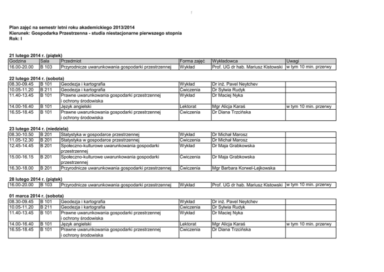 1 Plan zajęć na semestr letni roku akademickiego 2013/2014 Kierunek: Gospodarka Przestrzenna - studia niestacjonarne pierwszego stopnia Rok: I 21 lutego 2014 r. (piątek) Godzina Sala Przedmiot 16.00-20.00 B 103 Przyrodnicze uwarunkowania gospodarki przestrzennej 22 lutego 2014 r. (sobota) 08.30-09.45 B 101 Geodezja i kartografia 10.05-11.20 B 211 Geodezja i kartografia 11.40-13.45 B 101 Prawne uwarunkowania gospodarki przestrzennej i ochrony środowiska 14.00-16.40 B 101 Język angielski 16.55-18.45 B 101 Prawne uwarunkowania gospodarki przestrzennej i ochrony środowiska 23 lutego 2014 r. (niedziela) 08.30-10.50 B 201 Statystyka w gospodarce przestrzennej 11.05-12.30 B 201 Statystyka w gospodarce przestrzennej 12.45-14.45 B 201 Społeczno-kulturowe uwarunkowania gospodarki przestrzennej 15.00-16.15 B 201 Społeczno-kulturowe uwarunkowania gospodarki przestrzennej 16.30-18.00 B 201 Przyrodnicze uwarunkowania gospodarki przestrzennej 28 lutego 2014 r. (piątek) 16.00-20.00 B 103 Przyrodnicze uwarunkowania gospodarki przestrzennej 01 marca 2014 r. (sobota) 08.30-09.45 B 101 Geodezja i kartografia 10.05-11.20 B 211 Geodezja i kartografia 11.40-13.45 B 101 Prawne uwarunkowania gospodarki przestrzennej i ochrony środowiska 14.00-16.40 B 101 Język angielski 16.55-18.45 B 101 Prawne uwarunkowania gospodarki przestrzennej i ochrony środowiska Forma zajęć Wykład Wykładowca Uwagi Prof. UG dr hab. Mariusz Kistowski w tym 10 min. przerwy Wykład Ćwiczenia Wykład Dr inż. Pavel Neytchev Dr Sylwia Rudyk Dr Maciej Nyka Lektorat Ćwiczenia Mgr Alicja Karaś Dr Diana Trzcińska Wykład Ćwiczenia Wykład Dr Michał Marosz Dr Michał Marosz Dr Maja Grabkowska Ćwiczenia Dr Maja Grabkowska Ćwiczenia Mgr Barbara Korwel-Lejkowska Wykład Prof. UG dr hab. Mariusz Kistowski w tym 10 min. przerwy Wykład Ćwiczenia Wykład Dr inż. Pavel Neytchev Dr Sylwia Rudyk Dr Maciej Nyka Lektorat Ćwiczenia Mgr Alicja Karaś Dr Diana Trzcińska w tym 10 min. przerwy w tym 10 min. przerwy 2 02 marca 2014 r. (niedziela) 08.30-10.50 B 201 Statystyka w gospodarce przestrzennej 11.05-12.30 B 201 Statystyka w gospodarce przestrzennej 12.45-14.45 B 201 Społeczno-kulturowe uwarunkowania gospodarki przestrzennej 15.00-16.15 B 201 Społeczno-kulturowe uwarunkowania gospodarki przestrzennej Wykład Ćwiczenia Wykład Dr Michał Marosz Dr Michał Marosz Dr Maja Grabkowska Ćwiczenia Dr Maja Grabkowska Wykład Prof. UG dr hab. Mariusz Kistowski w tym 10 min. przerwy Wykład Ćwiczenia Wykład Dr inż. Pavel Neytchev Dr Sylwia Rudyk Dr Maciej Nyka Lektorat Ćwiczenia Mgr Alicja Karaś Dr Diana Trzcińska Wykład Ćwiczenia Wykład Dr Michał Marosz Dr Michał Marosz Dr Maja Grabkowska Ćwiczenia Dr Maja Grabkowska 15 marca 2014 r. (sobota) 09.00-12.45 Kulturoznawstwo E-learning 13.15-15.45 E-learning Prof. UG dr hab. Mariusz Czepczyński Mgr Barbara Korwel-Lejkowska 07 marca 2014 r. (piątek) 16.00-20.00 B 103 Przyrodnicze uwarunkowania gospodarki przestrzennej 08 marca 2014 r. (sobota) 08.30-09.45 B 101 Geodezja i kartografia 10.05-11.20 B 211 Geodezja i kartografia 11.40-13.45 B 101 Prawne uwarunkowania gospodarki przestrzennej i ochrony środowiska 14.00-16.40 B 101 Język angielski 16.55-18.45 B 101 Prawne uwarunkowania gospodarki przestrzennej i ochrony środowiska 09 marca 2014 r. (niedziela) 08.30-10.50 B 201 Statystyka w gospodarce przestrzennej 11.05-12.30 B 201 Statystyka w gospodarce przestrzennej 12.45-14.45 B 201 Społeczno-kulturowe uwarunkowania gospodarki przestrzennej 15.00-16.15 B 201 Społeczno-kulturowe uwarunkowania gospodarki przestrzennej Przyrodnicze uwarunkowania gospodarki przestrzennej 16 marca 2014 r. (niedziela) 09.00-12.45 Kulturoznawstwo E-learning 13.15-16.35 E-learning Społeczno-kulturowe uwarunkowania gospodarki przestrzennej Prof. UG dr hab. Mariusz Czepczyński Dr Maja Grabkowska w tym 10 min. przerwy 3 21 marca 2014 r. (piątek) 16.00-20.00 B 103 Przyrodnicze uwarunkowania gospodarki przestrzennej 22 marca 2014 r. (sobota) 08.30-09.45 B 101 Geodezja i kartografia 10.05-11.20 B 211 Geodezja i kartografia 11.40-13.45 B 101 Prawne uwarunkowania gospodarki przestrzennej i ochrony środowiska 14.00-16.40 B 101 Język angielski 16.55-18.45 B 101 Prawne uwarunkowania gospodarki przestrzennej i ochrony środowiska 23 marca 2014 r. (niedziela) 08.30-10.50 B 201 Statystyka w gospodarce przestrzennej 11.05-12.30 B 201 Statystyka w gospodarce przestrzennej 12.45-14.45 B 201 Społeczno-kulturowe uwarunkowania gospodarki przestrzennej 15.00-16.15 B 201 Społeczno-kulturowe uwarunkowania gospodarki przestrzennej 28 marca 2014 r. (piątek) 16.00-20.00 B 103 Przyrodnicze uwarunkowania gospodarki przestrzennej 29 marca 2014 r. (sobota) 08.30-09.45 B 101 Geodezja i kartografia 10.05-11.20 B 211 Geodezja i kartografia 11.40-13.45 B 101 Prawne uwarunkowania gospodarki przestrzennej i ochrony środowiska 14.00-16.40 B 101 Język angielski 16.55-18.45 B 101 Prawne uwarunkowania gospodarki przestrzennej i ochrony środowiska 30 marca 2014 r. (niedziela) 08.30-10.50 B 201 Statystyka w gospodarce przestrzennej 11.05-12.30 B 201 Statystyka w gospodarce przestrzennej 12.45-14.45 B 201 Społeczno-kulturowe uwarunkowania gospodarki przestrzennej 15.00-16.15 B 201 Społeczno-kulturowe uwarunkowania gospodarki przestrzennej Wykład Prof. UG dr hab. Mariusz Kistowski w tym 10 min. przerwy Wykład Ćwiczenia Wykład Dr inż. Pavel Neytchev Dr Sylwia Rudyk Dr Maciej Nyka Lektorat Ćwiczenia Mgr Alicja Karaś Dr Diana Trzcińska Wykład Ćwiczenia Wykład Dr Michał Marosz Dr Michał Marosz Dr Maja Grabkowska Ćwiczenia Dr Maja Grabkowska Wykład Prof. UG dr hab. Mariusz Kistowski w tym 10 min. przerwy Wykład Ćwiczenia Wykład Dr inż. Pavel Neytchev Dr Sylwia Rudyk Dr Maciej Nyka Lektorat Ćwiczenia Mgr Alicja Karaś Dr Diana Trzcińska Wykład Ćwiczenia Wykład Dr Michał Marosz Dr Michał Marosz Dr Maja Grabkowska Ćwiczenia Dr Maja Grabkowska w tym 10 min. przerwy w tym 10 min. przerwy 4 04 kwietnia 2014 r. (pią