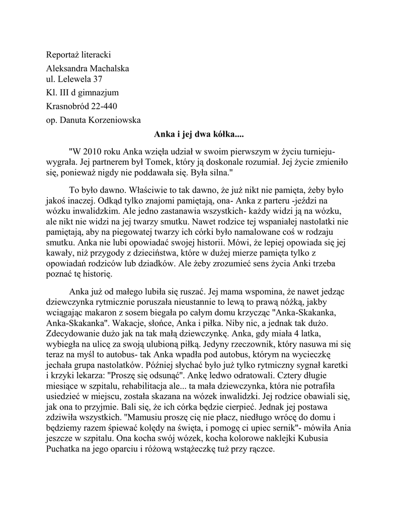 Reportaż literacki Aleksandra Machalska ul. Lelewela 37 Kl. III d gimnazjum Krasnobród 22-440 op. Danuta Korzeniowska Anka i jej dwa kółka.... ''W 2010 roku Anka wzięła udział w swoim pierwszym w życiu turniejuwygrała. Jej partnerem był Tomek, który ją doskonale rozumiał. Jej życie zmieniło się, ponieważ nigdy nie poddawała się. Była silna.'' To było dawno. Właściwie to tak dawno, że już nikt nie pamięta, żeby było jakoś inaczej. Odkąd tylko znajomi pamiętają, ona- Anka z parteru -jeździ na wózku inwalidzkim. Ale jedno zastanawia wszystkich- każdy widzi ją na wózku, ale nikt nie widzi na jej twarzy smutku. Nawet rodzice tej wspaniałej nastolatki nie pamiętają, aby na piegowatej twarzy ich córki było namalowane coś w rodzaju smutku. Anka nie lubi opowiadać swojej historii. Mówi, że lepiej opowiada się jej kawały, niż przygody z dzieciństwa, które w dużej mierze pamięta tylko z opowiadań rodziców lub dziadków. Ale żeby zrozumieć sens życia Anki trzeba poznać tę historię. Anka już od małego lubiła się ruszać. Jej mama wspomina, że nawet jedząc dziewczynka rytmicznie poruszała nieustannie to lewą to prawą nóżką, jakby wciągając makaron z sosem biegała po całym domu krzycząc ''Anka-Skakanka, Anka-Skakanka''. Wakacje, słońce, Anka i piłka. Niby nic, a jednak tak dużo. Zdecydowanie dużo jak na tak małą dziewczynkę. Anka, gdy miała 4 latka, wybiegła na ulicę za swoją ulubioną piłką. Jedyny rzeczownik, który nasuwa mi się teraz na myśl to autobus- tak Anka wpadła pod autobus, którym na wycieczkę jechała grupa nastolatków. Później słychać było już tylko rytmiczny sygnał karetki i krzyki lekarza: ''Proszę się odsunąć''. Ankę ledwo odratowali. Cztery długie miesiące w szpitalu, rehabilitacja ale... ta mała dziewczynka, która nie potrafiła usiedzieć w miejscu, została skazana na wózek inwalidzki. Jej rodzice obawiali się, jak ona to przyjmie. Bali się, że ich córka będzie cierpieć. Jednak jej postawa zdziwiła wszystkich. ''Mamusiu proszę cię nie płacz, niedługo wrócę do domu i będziemy razem śpiewać kolędy na święta, i pomogę ci upiec sernik''- mówiła Ania jeszcze w szpitalu. Ona kocha swój wózek, kocha kolorowe naklejki Kubusia Puchatka na jego oparciu i różową wstążeczkę tuż przy rączce. Teraz Anka ma 17 lat i mimo to, że wózek zdążył się zmienić, nie zmieniło się jej usposobienie. Każdy wierzył w to, że ta piegowata nastolatka znajdzie dla siebie jakąś pasje. Przed wypadkiem kochała grać w piłkę, teraz było to niemożliwe. Wszystko zmieniło się, gdy ktoś zauważył Ankę na facebook'u. Dziewczyna nie bała się swojego kalectwa i śmiało dodawała zdjęcia, na których widać wózek. ''Cześć. Mam na imię Tomek. Nie chce się narzucać, ale mam do ciebie prośbę. Szukam osoby na wózku inwalidzki, która chce tańczyć. Odezwij się szybko, bo szukam partnerki na najbliższy turniej''. Ta wiadomość zmieniła życie dziewczyny. Anka wspomina, jak bardzo wstydziła się na pierwszym spotkaniu z grupą. Później było już coraz lepiej. W 2010 roku Anka wzięła udział w swoim pierwszym w życiu turnieju- wygrała. Jej partnerem był Tomek, który ją doskonale rozumiał. Jej życie zmieniło się, ponieważ nigdy nie poddawała się. Była silna. Teraz Anka przygotowuje się do kolejnego turnieju. Tomek nie jest już tylko jej partnerem w tańcu, ale i w życiu. Pomaga jej nadrabiać zaległości w szkole spowodowane wizytami u lekarza. Dzięki wygranym konkursom Anka zbiera pieniądze dla niepełnosprawnych dzieci. Twierdzi, że dla niej jest już za późno, ale te dzieciaki potrzebują pomocy. Dziewczyna po szkole często jeździ do szpitala, żeby porozmawiać z chorymi dziećmi. Tomek też zaangażował się jako wolontariusz. Anka cieszy się, że tyle w życiu osiągnęła.
