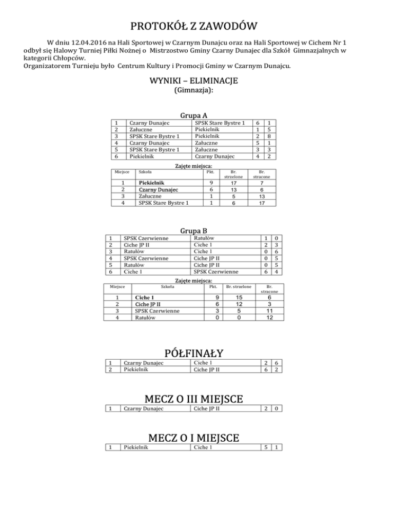 PROTOKÓŁ Z ZAWODÓW W dniu 12.04.2016 na Hali Sportowej w Czarnym Dunajcu oraz na Hali Sportowej w Cichem Nr 1 odbył się Halowy Turniej Piłki Nożnej o Mistrzostwo Gminy Czarny Dunajec dla Szkół Gimnazjalnych w kategorii Chłopców. Organizatorem Turnieju było Centrum Kultury i Promocji Gminy w Czarnym Dunajcu. WYNIKI – ELIMINACJE (Gimnazja): Grupa A 1 2 3 4 5 6 Czarny Dunajec Załuczne SPSK Stare Bystre 1 Czarny Dunajec SPSK Stare Bystre 1 Piekielnik SPSK Stare Bystre 1 Piekielnik Piekielnik Załuczne Załuczne Czarny Dunajec 6 1 2 5 3 4 1 5 8 1 3 2 Zajęte miejsca: Miejsce 1 2 3 4 Szkoła Pkt. Br. strzelone Br. stracone 9 6 1 1 17 13 5 6 7 6 13 17 Piekielnik Czarny Dunajec Załuczne SPSK Stare Bystre 1 Grupa B 1 2 3 4 5 6 SPSK Czerwienne Ciche JP II Ratułów SPSK Czerwienne Ratułów Ciche 1 Ratułów Ciche 1 Ciche 1 Ciche JP II Ciche JP II SPSK Czerwienne 1 2 0 0 0 6 0 3 6 5 5 4 Zajęte miejsca: Miejsce 1 2 3 4 Szkoła Pkt. 9 6 3 0 Ciche 1 Ciche JP II SPSK Czerwienne Ratułów Br. strzelone Br. stracone 15 12 5 0 6 3 11 12 PÓŁFINAŁY 1 2 Czarny Dunajec Piekielnik 1 Czarny Dunajec 1 Piekielnik Ciche 1 Ciche JP II 2 6 6 2 2 0 5 1 MECZ O III MIEJSCE Ciche JP II MECZ O I MIEJSCE Ciche 1 Klasyfikacja końcowa: Miejsce Szkoła Piekielnik 1 2 Ciche 1 3 Czarny Dunajec 4 Ciche JP II 5 7 Załuczne, SPSK Czerwienne SPSK Stare Bystre 1, Ratułów Zwycięska drużyna z Zespołu Szkół Podstawowej i Gimnazjum w Piekielniku wystąpiła w składzie: Dawid Federak, Adrian Kąś, Kamil Starostowicz, Hubert Konieczny, Łukasz Rapacz, Marcin Jędraszczak, Maciej Zborek Opiekun drużyny: mgr Damian Czyszczoń Królem strzelców został Dawid Federak (Gim. Piekielnik) oraz Patryk Skóbel (Gim. Ciche Nr 1) Zwycięskie zespoły do III miejsca otrzymały Puchar. Wszystkie drużyny za zajęcie poszczególnych miejsc otrzymały pamiątkowe dyplomy, posiłek i napoje. ze sportowym pozdrowieniem Koordynator sportu w Gminie Mgr Marek Szuba