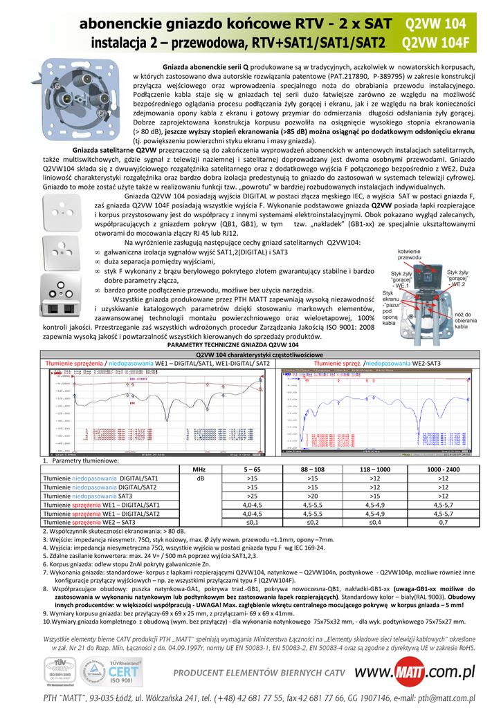 abonenckie gniazdo końcowe RTV - 2 x SAT Q2VW 104 instalacja 2 – przewodowa, RTV+SAT1/SAT1/SAT2 Q2VW 104F Gniazda abonenckie serii Q produkowane są w tradycyjnych, aczkolwiek w nowatorskich korpusach, w których zastosowano dwa autorskie rozwiązania patentowe (PAT.217890, P-389795) w zakresie konstrukcji przyłącza wejściowego oraz wprowadzenia specjalnego noża do obrabiania przewodu instalacyjnego. Podłączenie kabla staje się w gniazdach tej serii dużo łatwiejsze zarówno ze względu na możliwość bezpośredniego oglądania procesu podłączania żyły gorącej i ekranu, jak i ze względu na brak konieczności zdejmowania opony kabla z ekranu i gotowy przymiar do odmierzania długości odsłaniania żyły gorącej. Dobrze zaprojektowana konstrukcja korpusu pozwoliła na osiągnięcie wysokiego stopnia ekranowania (> 80 dB), jeszcze wyższy stopień ekranowania (>85 dB) można osiągnąć po dodatkowym odsłonięciu ekranu (tj. powiększeniu powierzchni styku ekranu i masy gniazda). Gniazda satelitarne Q2VW przeznaczone są do zakończenia wyprowadzeń abonenckich w antenowych instalacjach satelitarnych, także multiswitchowych, gdzie sygnał z telewizji naziemnej i satelitarnej doprowadzany jest dwoma osobnymi przewodami. Gniazdo Q2VW104 składa się z dwuwyjściowego rozgałęźnika satelitarnego oraz z dodatkowego wyjścia F połączonego bezpośrednio z WE2. Duża liniowość charakterystyki rozgałęźnika oraz bardzo dobra izolacja predestynują to gniazdo do zastosowań w systemach telewizji cyfrowej. Gniazdo to może zostać użyte także w realizowaniu funkcji tzw. „powrotu” w bardziej rozbudowanych instalacjach indywidualnych. Gniazda Q2VW 104 posiadają wyjścia DIGITAL w postaci złącza męskiego IEC, a wyjścia SAT w postaci gniazda F, zaś gniazda Q2VW 104F posiadają wszystkie wyjścia F. Wykonanie podstawowe gniazda Q2VW posiada łapki rozpierające i korpus przystosowany jest do współpracy z innymi systemami elektroinstalacyjnymi. Obok pokazano wygląd zalecanych, współpracujących z gniazdem pokryw (QB1, GB1), w tym tzw. „nakładek” (GB1-xx) ze specjalnie ukształtowanymi otworami do mocowania złączy RJ 45 lub RJ12. Na wyróżnienie zasługują następujące cechy gniazd satelitarnych Q2VW104: • galwaniczna izolacja sygnałów wyjść SAT1,2(DIGITAL) i SAT3 • duża separacja pomiędzy wyjściami, • styk F wykonany z brązu berylowego pokrytego złotem gwarantujący stabilne i bardzo dobre parametry złącza, • bardzo proste podłączenie przewodu, możliwe bez użycia narzędzia. Wszystkie gniazda produkowane przez PTH MATT zapewniają wysoką niezawodność i uzyskiwanie katalogowych parametrów dzięki stosowaniu markowych elementów, zaawansowanej technologii montażu powierzchniowego oraz wieloetapowej, 100% kontroli jakości. Przestrzeganie zaś wszystkich wdrożonych procedur Zarządzania Jakością ISO 9001: 2008 zapewnia wysoką jakość i powtarzalność wszystkich kierowanych do sprzedaży produktów. PARAMETRY TECHNICZNE GNIAZDA Q2VW 104 Q2VW 104 charakterystyki częstotliwościowe Tłumienie sprzężenia / niedopasowania WE1 – DIGITAL/SAT1, WE1-DIGITAL/ SAT2 Tłumienie sprzęż. /niedopasowania WE2-SAT3 1. Parametry tłumieniowe: MHz 5 – 65 88 – 108 118 – 1000 1000 - 2400 Tłumienie niedopasowania DIGITAL/SAT1 dB >15 >15 >12 >12 Tłumienie niedopasowania DIGITAL/SAT2 >15 >15 >12 >12 Tłumienie niedopasowania SAT3 >25 >20 >15 >12 Tłumienie sprzężenia WE1 – DIGITAL/SAT1 4,0-4,5 4,5-5,5 4,5-4,9 4,5-5,7 Tłumienie sprzężenia WE1 – DIGITAL/SAT2 4,0-4,5 4,5-5,5 4,5-4,9 4,5-5,7 Tłumienie sprzężenia WE2 – SAT3 ≤0,1 ≤0,2 ≤0,4 0,7 2. Współczynnik skuteczności ekranowania: > 80 dB. 3. Wejście: impedancja niesymetr. 75Ω, styk nożowy, max. Ø żyły wewn. przewodu –1.1mm, opony –7mm. 4. Wyjścia: impedancja niesymetryczna 75Ω, wszystkie wyjścia w postaci gniazda typu F wg IEC 169-24. 5. Zdalne zasilanie konwertera: max. 24 V= / 500 mA poprzez wyjścia SAT1,2,3. 6. Korpus gniazda: odlew stopu ZnAl pokryty galwanicznie Zn. 7. Wykonania gniazda: standardowe- korpus z łapkami rozpierającymi Q2VW104, natynkowe – Q2VW104n, podtynkowe - Q2VW104p, możliwe również inne konfiguracje przyłączy wyjściowych – np. ze wszystkimi przyłączami typu F (Q2VW104F). 8. Współpracujące obudowy: puszka natynkowa-GA1, pokrywa trad.-GB1, pokrywa nowoczesna-QB1, nakładki-GB1-xx (uwaga-GB1-xx możliwe do zastosowania w wykonaniu natynkowym lub podtynkowym bez zastosowania łapek rozpierających). Standardowy kolor – biały(RAL 9003). Obudowy innych producentów: w większości współpracują - UWAGA! Max. zagłębienie wkrętu centralnego mocującego pokrywę w korpus gniazda – 5 mm! 9. Wymiary korpusu gniazda: bez przyłączy-69 x 69 x 25 mm, z przyłączami- 69 x 69 x 41mm. 10.Wymiary gniazda kompletnego z obudową (wym. bez przyłączy) - dla wykonania natynkowego 75x75x32 mm, - dla wyk. podtynkowego 75x75x27 mm.