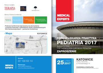 Patroni medialni: Główny Partner Konferencji: › Podczas konferencji zapraszamy do skorzystania z przerwy kawowej i odwiedzenia stoisk wystawienniczych firm farmaceutycznych – partnerów konferencji › Mapa KATOWICE FORUM LEKARZA PRAKTYKA PEDIATRIA 2017 Hotel Novotel al. Roździeńskiego 16 Kontakt: 22 100 63 14 Rejestracja: www.medical-experts.pl www.forumlekarzapraktyka.pl ALERGOLOGIA, PNEUMONOLOGIA DZIECIĘCA, PEDIATRIA ZAPROSZENIE 25 2017 LUTEGO KATOWICE HOTEL NOVOTEL al. Roździeńskiego 16 KONFERENCJA BEZPŁATNA UCZESTNICY OTRZYMUJĄ 6 PUNKTÓW EDUKACYJNYCH › Patronat merytoryczny: › SOBOTA 25 lutego 2017 8.30 – 9.00 REJESTRACJA UCZESTNIKÓW 8.50 – 9.00 Otwarcie spotkania, powitanie uczestników – dr hab. n. med. prof. nadzw. Zbigniew Doniec (Rabka-Zdrój) 9.00 – 10.00 9.00 – 9.25 SESJA I: VADEMECUM PRAKTYKA Interpretacja badań hematologicznych u dzieci w zależności od wieku dziecka – prof. dr hab. n. med. Jarosław Peregud-Pogorzelski (Szczecin) Od objawu do rozpoznania – najczęstsze problemy kardiologiczne w pediatrii – dr Rafał Duda (Wrocław) Dyskusja 9.25 – 9.50 9.50 – 10.00 10.00 – 11.30 10.00 – 10.30 Partner Konferencji: › Kierownik Naukowy Konferencji: 10.30 – 10.55 10.55 – 11.20 11.20 – 11.30 SESJA II: ASTMA I ALERGIE U DZIECI Astma wczesnodziecięca – pułapki diagnozy i terapii dr hab. n. med. prof. nadzw. Zbigniew Doniec (Rabka-Zdrój) Nieżyt nosa to nie zawsze alergia... – dr n. med. Mamert Milewski (Kraków) Zakażenie czy alergia? – dr hab. n. med. prof. nadzw. Zbigniew Doniec (Rabka-Zdrój) Dyskusja 11.30 – 11.50 Przerwa kawowa 11.50 – 13.00 11.50 – 12.20 SESJA III: ZAKAŻENIA U DZIECI Antybiotykoterapia zakażeń dróg oddechowych – co nowego A.D. 2017? – dr hab. n. med. Adam Sybilski (Warszawa) Zakażenia układu moczowego w przypadkach – prof. dr hab. n. med. Katarzyna Kiliś-Pstrusińska (Wrocław) Dyskusja 12.20 – 12.50 dr hab. n. med. prof. nadzw. Zbigniew Doniec 12.50 – 13.00 13.00 – 13.45 13.00 – 13.40 › Wykładowcy: prof. dr hab. n. med. Jarosław Peregud-Pogorzelski prof. dr hab. n. med. Katarzyna Kiliś-Pstrusińska dr hab. n. med. prof. nadzw. Zbigniew Doniec dr hab. n. med. Adam Sybilski dr n. med. Ilona Małecka dr n. med. Joanna Stryczyńska-Kazubska dr n. med. Mamert Milewski dr n. tech. Jakub Radliński dr Mariusz Woźniak dr Liwia Starczewska-Dymek dr Rafał Duda 13.40 – 13.45 SESJA IV: HOT TOPIC Rekomendacje postępowania w kaszlu u dzieci – dr hab. n. med. prof. nadzw. Zbigniew Doniec (Rabka-Zdrój) Dyskusja 13.45 – 14.15 Poczęstunek 14.15 – 15.20 14.15 – 15.15 SESJA V: SZCZEPIENIA W PYTANIACH I ODPOWIEDZIACH Szczepienia ochronne w grupach ryzyka, czyli skuteczna ochrona dla najbardziej potrzebujących – dr n. med. Ilona Małecka, dr n. med. Joanna Stryczyńska-Kazubska (Poznań) Dyskusja 15.15 – 15.20 15.20 – 15.30 Podsumowanie i zakończenie konferencji – dr hab. n. med. prof. nadzw. Zbigniew Doniec (Rabka-Zdrój) 15.30 – 17.00 15.30 – 16.05 16.05 – 16.20 WARSZTATY PRAKTYCZNE Spirometria, oscylometria impulsowa – dr n. tech. Jakub Radliński (Rabka-Zdrój) Nowe możliwości oceny i kontroli techniki inhalacji – dr Liwia Starczewska-Dymek (Strzelce Opolskie) Ultrasonografia płuc – dr Mariusz Woźniak (Rabka-Zdrój) 16.20 – 17.00 Rejestracja poprzez stronę www.forumlekarzapraktyka.pl lub na miejscu 30 minut przed rozpoczęciem konferencji
