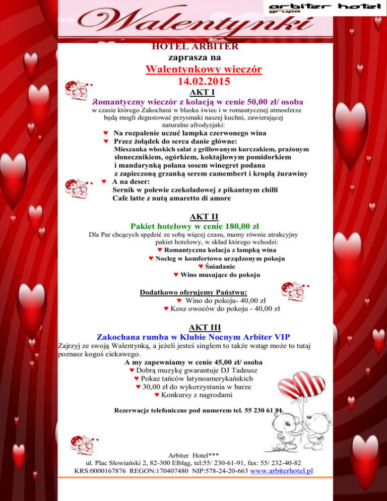 HOTEL ARBITER zaprasza na Walentynkowy wieczór 14.02.2015 AKT I Romantyczny wieczór z kolacją w cenie 50,00 zł/ osoba w czasie którego Zakochani w blasku świec i w romantycznej atmosferze będą mogli degustować przysmaki naszej kuchni, zawierającej naturalne afrodyzjaki: ♥ Na rozpalenie uczuć lampka czerwonego wina ♥ Przez żołądek do serca danie główne: Mieszanka włoskich sałat z grillowanym kurczakiem, prażonym słonecznikiem, ogórkiem, koktajlowym pomidorkiem i mandarynką polana sosem winegret podana z zapieczoną grzanką serem camembert i kroplą żurawiny ♥ A na deser: Sernik w polewie czekoladowej z pikantnym chilli Cafe latte z nutą amaretto di amore AKT II Pakiet hotelowy w cenie 180,00 zł Dla Par chcących spędzić ze sobą więcej czasu, mamy równie atrakcyjny pakiet hotelowy, w skład którego wchodzi: ♥ Romantyczna kolacja z lampką wina ♥ Nocleg w komfortowo urządzonym pokoju ♥ Śniadanie ♥ Wino musujące do pokoju Dodatkowo oferujemy Państwu: ♥ Wino do pokoju- 40,00 zł ♥ Kosz owoców do pokoju - 40,00 zł AKT III Zakochana rumba w Klubie Nocnym Arbiter VIP Zajrzyj ze swoją Walentynką, a jeżeli jesteś singlem to także wstąp może to tutaj poznasz kogoś ciekawego. A my zapewniamy w cenie 45,00 zł/ osoba ♥ Dobrą muzykę gwarantuje DJ Tadeusz ♥ Pokaz tańców latynoamerykańskich ♥ 30,00 zł do wykorzystania w barze ♥ Konkursy z nagrodami Rezerwacje telefoniczne pod numerem tel. 55 230 61 91 Arbiter Hotel*** ul. Plac Słowiański 2, 82-300 Elbląg, tel:55/ 230-61-91, fax: 55/ 232-40-82 KRS:0000167876 REGON:170407480 NIP:578-24-20-663 www.arbiterhotel.pl