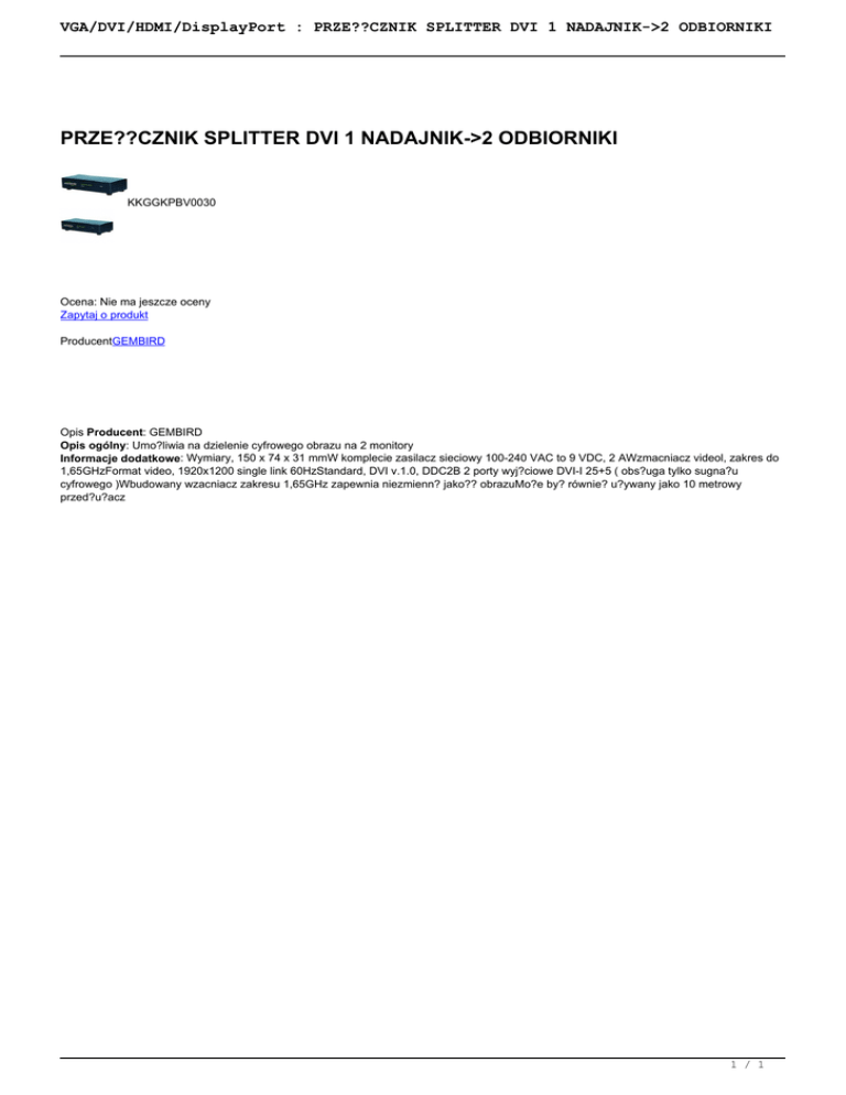 VGA/DVI/HDMI/DisplayPort : PRZE??CZNIK SPLITTER DVI 1 NADAJNIK->2 ODBIORNIKI PRZE??CZNIK SPLITTER DVI 1 NADAJNIK->2 ODBIORNIKI KKGGKPBV0030 Ocena: Nie ma jeszcze oceny Zapytaj o produkt ProducentGEMBIRD Opis Producent: GEMBIRD Opis ogólny: Umo?liwia na dzielenie cyfrowego obrazu na 2 monitory Informacje dodatkowe: Wymiary, 150 x 74 x 31 mmW komplecie zasilacz sieciowy 100-240 VAC to 9 VDC, 2 AWzmacniacz videol, zakres do 1,65GHzFormat video, 1920x1200 single link 60HzStandard, DVI v.1.0, DDC2B 2 porty wyj?ciowe DVI-I 25+5 ( obs?uga tylko sugna?u cyfrowego )Wbudowany wzacniacz zakresu 1,65GHz zapewnia niezmienn? jako?? obrazuMo?e by? równie? u?ywany jako 10 metrowy przed?u?acz 1 / 1 Powered by TCPDF (www.tcpdf.org)