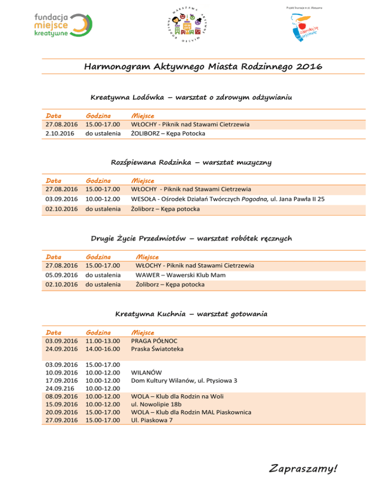Harmonogram Aktywnego Miasta Rodzinnego 2016 Kreatywna Lodówka – warsztat o zdrowym odżywianiu Data 27.08.2016 2.10.2016 Godzina 15.00-17.00 do ustalenia Miejsce WŁOCHY - Piknik nad Stawami Cietrzewia ŻOLIBORZ – Kępa Potocka Rozśpiewana Rodzinka – warsztat muzyczny Data 27.08.2016 Godzina 15.00-17.00 Miejsce WŁOCHY - Piknik nad Stawami Cietrzewia 03.09.2016 10.00-12.00 WESOŁA - Ośrodek Działań Twórczych Pogodna, ul. Jana Pawła II 25 02.10.2016 do ustalenia Żoliborz – Kępa potocka Drugie Życie Przedmiotów – warsztat robótek ręcznych Data 27.08.2016 05.09.2016 02.10.2016 Godzina 15.00-17.00 do ustalenia do ustalenia Miejsce WŁOCHY - Piknik nad Stawami Cietrzewia WAWER – Wawerski Klub Mam Żoliborz – Kępa potocka Kreatywna Kuchnia – warsztat gotowania Data 03.09.2016 24.09.2016 Godzina 11.00-13.00 14.00-16.00 03.09.2016 10.09.2016 17.09.2016 24.09.216 08.09.2016 15.09.2016 20.09.2016 27.09.2016 15.00-17.00 10.00-12.00 10.00-12.00 10.00-12.00 10.00-12.00 10.00-12.00 15.00-17.00 15.00-17.00 Miejsce PRAGA PÓŁNOC Praska Światoteka WILANÓW Dom Kultury Wilanów, ul. Ptysiowa 3 WOLA – Klub dla Rodzin na Woli ul. Nowolipie 18b WOLA – Klub dla Rodzin MAL Piaskownica Ul. Piaskowa 7 Zapraszamy! Patrz! To Warszawa! – spacer fotograficzny Data 23.08.2016 Godzina 17.00-19.00 Miejsce WŁOCHY - Przystanek Zajezdnia Kleszczowa „Roztańczona Warszawa Rodzinna - jak na przedwojennym dancingu” – wieczorki taneczne Data 31.08.2016 Godzina 18.00-20.00 Miejsce POMOST 511, bulwar Flotylli Wiślanej Zapraszamy!