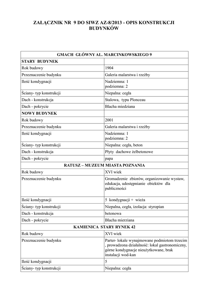 ZAŁĄCZNIK NR 9 DO SIWZ AZ-8/2013 - OPIS KONSTRUKCJI BUDYNKÓW GMACH GŁÓWNY AL. MARCINKOWSKIEGO 9 STARY BUDYNEK Rok budowy 1904 Przeznaczenie budynku Galeria malarstwa i rzeźby Ilość kondygnacji Nadziemna: 1 podziemna: 2 Ściany- typ konstrukcji Niepalna: cegła Dach - konstrukcja Stalowa, typu Plonceau Dach - pokrycie Blacha miedziana NOWY BUDYNEK Rok budowy 2001 Przeznaczenie budynku Galeria malarstwa i rzeźby Ilość kondygnacji Nadziemna: 1 podziemna: 2 Ściany- typ konstrukcji Niepalna: cegła, beton Dach - konstrukcja Płyty dachowe żelbetonowe Dach - pokrycie papa RATUSZ – MUZEUM MIASTA POZNANIA Rok budowy XVI wiek Przeznaczenie budynku Gromadzenie zbiorów, organizowanie wystaw, edukacja, udostępnianie obiektów dla publiczności Ilość kondygnacji 5 kondygnacji + wieża Ściany- typ konstrukcji Niepalna, cegła, izolacja: styropian Dach - konstrukcja betonowa Dach - pokrycie Blacha mierziana KAMIENICA STARY RYNEK 42 Rok budowy XVI wiek Przeznaczenie budynku Parter- lokale wynajmowane podmiotom trzecim , prowadzona działalność: lokal gastronomiczny, górne kondygnacje nieużytkowane, brak instalacji wod-kan Ilość kondygnacji 5 Ściany- typ konstrukcji Niepalna: cegła Dach - konstrukcja Drewniana ( w 2010 przeprowadzono impregnacje więźby dachowej Dach - pokrycie dachówka KAMIENICA STARY RYNEK 43 Rok budowy XVI wiek Przeznaczenie budynku Parter- lokale wynajmowane podmiotom trzecim , prowadzona działalność: apteka i sklep z antykami, górne kondygnacje nieużytkowane Ilość kondygnacji 5 Ściany- typ konstrukcji Niepalna: cegła Dach - konstrukcja drewniana Dach - pokrycie Dachówka ( w 2010 przeprowadzono impregnacje więźby dachowej KAMIENICA, UL. KLASZTORNA 22/33 Rok budowy XVI wiek Przeznaczenie budynku Budynek wyłączony z eksploatacji, zabudowa zwarta z innymi kamienicami Ilość kondygnacji 3 Ściany- typ konstrukcji Niepalna, cegła Dach - konstrukcja drewniana Dach - pokrycie papa MUZEUM SZTUK UZYTKOWYCH, GÓRA PRZEMYSŁA 1 Przeznaczenie budynku/ planowane inwestycje Muzeum Sztuk Użytkowych Nowe skrzydło Zamku Królewskiego z wieżą – planowane odbiory techniczne na listopad 2013 planowana modernizacja Budynku Raczyńskiego - druga połowa 2013 KUCHNIA KRÓLEWSKA – BUDYNEK ADMINISTRACYJNY Rok budowy Przełom XVIII i XIX w Ilość kondygnacji 4 Ściany- typ konstrukcji Niepalna, cegła Dach - konstrukcja Drewniana + stropy żelbetonowe Dach - pokrycie dachówka ZAMEK KRÓLEWSKI – BUDYNEK RACZYŃSKIEGO Rok budowy 1952-1960 Ilość kondygnacji 4 Ściany- typ konstrukcji Niepalna, cegła Dach - konstrukcja Drewniana + stropy żelbetonowe dachówka Dach - pokrycie ZAMEK KRÓLEWSKI Z WIEŻĄ Rok budowy Odbiór nowego zamku – przewidziany na koniec roku 2013, inwestycja w trakcie realizcji Ściany- typ konstrukcji Niepalna, cegła Dach - konstrukcja Drewniana + stropy żelbetonowe Dach - pokrycie dachówka WIELKOPOLSKIE MUZEUM WOJSKOWE Rok budowy Połowa XIX wieku Przeznaczenie budynku Gromadzenie zbiorów, ekspozycja, edukacja Ilość kondygnacji 2+1 Ściany- typ konstrukcji Niepalna, cegła Dach - konstrukcja Stropodach pełny Dach - pokrycie papa MUZEUM INSTRUMENTÓW MUZYCZNYCH, STARY RYNEK 45 Rok budowy Pierwsza połowa XX wieku Przeznaczenie budynku Działalność wystawiennicza Ilość kondygnacji 1 podziemna, 3 nadziemne Ściany- typ konstrukcji Niepalna, cegła Dach - konstrukcja Stromy, dwuspadowy, wiązary metalowe i drewniane Dach - pokrycie Dachówka ceramiczna MUZEUM ETNOGRAFICZNE, UL. GROBLA 25 BUDYNEK MUZEUM Rok budowy 1986 Przeznaczenie budynku wystawiennictwo Ilość kondygnacji 3 Ściany- typ konstrukcji Niepalna, cegła Dach - konstrukcja Więźba dachowa, wiązary Poloncea Dach - pokrycie Dachówka ceramiczna, stal,papa BUDYNEK BIUROWO-MAGAZYNOWY Przeznaczenie budynku Magazyny, konserwacja Ilość kondygnacji naziemna: 1, podziemna: 1 Ściany- typ konstrukcji Niepalna, cegła Dach - konstrukcja Płyty dachowe, korytkowe Dach - pokrycie papa OFICYNA- MAGAZYN Przeznaczenie budynku magazyn Ściany- typ konstrukcji Niepalna, cegła Dach - konstrukcja drewniana Dach - pokrycie papa ZESPÓŁ PAŁACOWY ROGALIN Rok budowy XVIII wiek Podstawowe obiekty Pałac ( korpus główny+ 2 oficyny+2 łączniki), galeria malarstwa, powozownia, stajnia, zespół garażowy, czworaki mieszkalne, budynek socjalno-gospodarczy, ujeżdżalnia ( magazyn), hydroforownia Prowadzona działalność Muzeum w Rogalinie jest zamknięte dla zwiedzających do 31.12.2014 MNP wynajmuje część budynków zewnętrznym podmiotom na : restauracja, toalety publiczne, przychodnia lekarska, mieszkania dla pracowników PAŁAC- korpus główny + 2 oficyny+2 łączniki Przeznaczenie Muzeum, biura, pokoje gościnne Ilość kondygnacji Podziemna:1, nadziemna; 3 Ściany- typ konstrukcji Niepalna: cegła Dach - konstrukcja Drewniana, w skjrzydle płd- stalowa Dach - pokrycie Dachówka ceramiczna, blacha miedziana GALERIA MALARSTWA Przeznaczenie galeria Ilość kondygnacji Podziemna:1, nadziemna:1 Ściany- typ konstrukcji Niepalna: cegła Dach - konstrukcja Żelbetowa ze świetlikami Dach - pokrycie Mieszane: szkło,papa, dachówka ceramiczna POWOZOWNIA Przeznaczenie Muzeum, restauracja Ilość kondygnacji Podziemna: ¾, nadziemna: 1 Ściany- typ konstrukcji Niepalna: cegła Dach - konstrukcja Więźba drewniana wzmocniona elementami stalowymi Dach - pokrycie Dachówka ceramiczna STAJNIA Przeznaczenie Magazyn, toalety publiczne, mieszkania Ilość kondygnacji 1 Ściany- typ konstrukcji Niepalna; cegła, wełna mineralna na stropie Dach - konstrukcja drewniana Dach - pokrycie Dachówka ceramiczna UJEŻDZALNIA Przeznaczenie magazyn Ilość kondygnacji 1 Ściany- typ konstrukcji Niepalna: cegła Dach - konstrukcja Żelbetowa, na konstrukcji z wiązarów stalowych Dach - pokrycie papa CZWORAK A Przeznaczenie Pokoje goscinne, nieużytkowane Ilość kondygnacji Nadziemna; 1, podziemna: 1/2 Ściany- typ konstrukcji Niepalna: cegła Dach - konstrukcja drewniana Dach - pokrycie Dach
