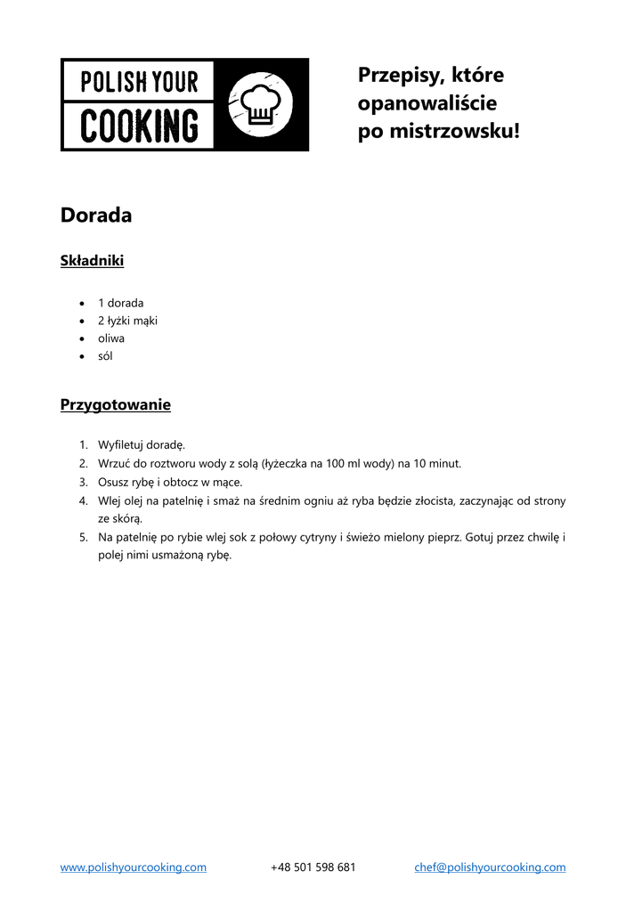 Przepisy, które opanowaliście po mistrzowsku! Dorada Składniki 1 dorada 2 łyżki mąki oliwa sól Przygotowanie 1. Wyfiletuj doradę. 2. Wrzuć do roztworu wody z solą (łyżeczka na 100 ml wody) na 10 minut. 3. Osusz rybę i obtocz w mące. 4. Wlej olej na patelnię i smaż na średnim ogniu aż ryba będzie złocista, zaczynając od strony ze skórą. 5. Na patelnię po rybie wlej sok z połowy cytryny i świeżo mielony pieprz. Gotuj przez chwilę i polej nimi usmażoną rybę. www.polishyourcooking.com +48 501 598 681 [email protected] Blitwa Składniki 500g blitwy (lub szpinaku) 400g ziemniaków 100ml oliwy 4 ząbki czosnku sól pieprz Wskazówki gdzie kupić blitwę: Hala Mirowska. Przygotowanie 1. Wlej oliwę na dużą patelnie lub garnek, podsmaż na nim zgnieciony czosnek, aż będzie brązowy i zdejmij z ognia. 2. Grubo pociętą blitwę wrzuć na pozostałą oliwę i smaż przez 2-3 minuty. 3. Dorzuć ugotowane ziemniaki, podsmażony czosnek, sól i pieprz. 4. Wymieszaj i podaj z rybą. Dobar tek! Kuchnia CHORWACKA www.polishyourcooking.com +48 501 598 681 [email protected]