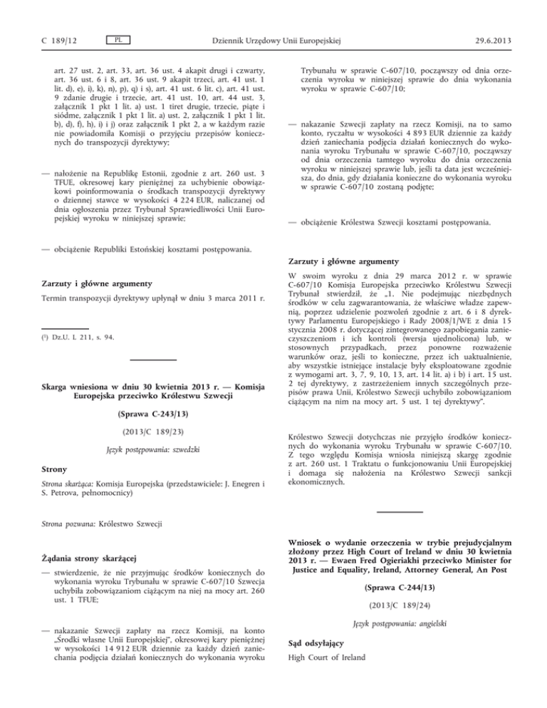 PL C 189/12 Dziennik Urzędowy Unii Europejskiej art. 27 ust. 2, art. 33, art. 36 ust. 4 akapit drugi i czwarty, art. 36 ust. 6 i 8, art. 36 ust. 9 akapit trzeci, art. 41 ust. 1 lit. d), e), i), k), n), p), q) i s), art. 41 ust. 6 lit. c), art. 41 ust. 9 zdanie drugie i trzecie, art. 41 ust. 10, art. 44 ust. 3, załącznik 1 pkt 1 lit. a) ust. 1 tiret drugie, trzecie, piąte i siódme, załącznik 1 pkt 1 lit. a) ust. 2, załącznik 1 pkt 1 lit. b), d), f), h), i) i j) oraz załącznik 1 pkt 2, a w każdym razie nie powiadomiła Komisji o przyjęciu przepisów koniecz nych do transpozycji dyrektywy; — nałożenie na Republikę Estonii, zgodnie z art. 260 ust. 3 TFUE, okresowej kary pieniężnej za uchybienie obowiąz kowi poinformowania o środkach transpozycji dyrektywy o dziennej stawce w wysokości 4 224 EUR, naliczanej od dnia ogłoszenia przez Trybunał Sprawiedliwości Unii Euro pejskiej wyroku w niniejszej sprawie; 29.6.2013 Trybunału w sprawie C-607/10, począwszy od dnia orze czenia wyroku w niniejszej sprawie do dnia wykonania wyroku w sprawie C-607/10; — nakazanie Szwecji zapłaty na rzecz Komisji, na to samo konto, ryczałtu w wysokości 4 893 EUR dziennie za każdy dzień zaniechania podjęcia działań koniecznych do wyko nania wyroku Trybunału w sprawie C-607/10, począwszy od dnia orzeczenia tamtego wyroku do dnia orzeczenia wyroku w niniejszej sprawie lub, jeśli ta data jest wcześniej sza, do dnia, gdy działania konieczne do wykonania wyroku w sprawie C-607/10 zostaną podjęte; — obciążenie Królestwa Szwecji kosztami postępowania. — obciążenie Republiki Estońskiej kosztami postępowania. Zarzuty i główne argumenty Zarzuty i główne argumenty Termin transpozycji dyrektywy upłynął w dniu 3 marca 2011 r. (1) Dz.U. L 211, s. 94. Skarga wniesiona w dniu 30 kwietnia 2013 r. — Komisja Europejska przeciwko Królestwu Szwecji W swoim wyroku z dnia 29 marca 2012 r. w sprawie C-607/10 Komisja Europejska przeciwko Królestwu Szwecji Trybunał stwierdził, że „1. Nie podejmując niezbędnych środków w celu zagwarantowania, że właściwe władze zapew nią, poprzez udzielenie pozwoleń zgodnie z art. 6 i 8 dyrek tywy Parlamentu Europejskiego i Rady 2008/1/WE z dnia 15 stycznia 2008 r. dotyczącej zintegrowanego zapobiegania zanie czyszczeniom i ich kontroli (wersja ujednolicona) lub, w stosownych przypadkach, przez ponowne rozważenie warunków oraz, jeśli to konieczne, przez ich uaktualnienie, aby wszystkie istniejące instalacje były eksploatowane zgodnie z wymogami art. 3, 7, 9, 10, 13, art. 14 lit. a) i b) i art. 15 ust. 2 tej dyrektywy, z zastrzeżeniem innych szczególnych prze pisów prawa Unii, Królestwo Szwecji uchybiło zobowiązaniom ciążącym na nim na mocy art. 5 ust. 1 tej dyrektywy”. (Sprawa C-243/13) (2013/C 189/23) Język postępowania: szwedzki Strony Strona skarżąca: Komisja Europejska (przedstawiciele: J. Enegren i S. Petrova, pełnomocnicy) Królestwo Szwecji dotychczas nie przyjęło środków koniecz nych do wykonania wyroku Trybunału w sprawie C-607/10. Z tego względu Komisja wniosła niniejszą skargę zgodnie z art. 260 ust. 1 Traktatu o funkcjonowaniu Unii Europejskiej i domaga się nałożenia na Królestwo Szwecji sankcji ekonomicznych. Strona pozwana: Królestwo Szwecji Żądania strony skarżącej — stwierdzenie, że nie przyjmując środków koniecznych do wykonania wyroku Trybunału w sprawie C-607/10 Szwecja uchybiła zobowiązaniom ciążącym na niej na mocy art. 260 ust. 1 TFUE; — nakazanie Szwecji zapłaty na rzecz Komisji, na konto „Środki własne Unii Europejskiej”, okresowej kary pieniężnej w wysokości 14 912 EUR dziennie za każdy dzień zanie chania podjęcia działań koniecznych do wykonania wyroku Wniosek o wydanie orzeczenia w trybie prejudycjalnym złożony przez High Court of Ireland w dniu 30 kwietnia 2013 r. — Ewaen Fred Ogieriakhi przeciwko Minister for Justice and Equality, Ireland, Attorney General, An Post (Sprawa C-244/13) (2013/C 189/24) Język postępowania: angielski Sąd odsyłający High Court of Ireland