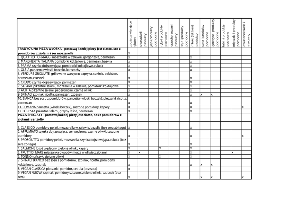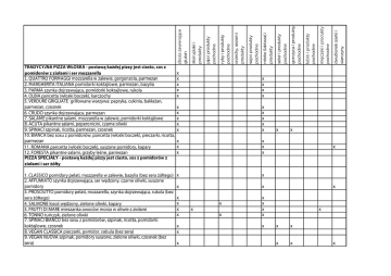 parmezan, czosnek 7. SALAME pikantne salami, mozzarella w zalewie, pomidorki koktajlowe 8. ACUTA pikantne salami, peperonicini, czarne oliwki 9. SPINACI szpinak, ricotta, parmezan, czosnek parmezan pomidory x x x x x x x x x x x x x x x x x x x x x x x x x x x x x x x dwutlenek siarki i siarczyny pochodne x x x x x x x x pochodne gorczyca i produkty pochodne pochodne mleko (laktoza) i produkty pochodne seler i produkty pochodne orzechy, sezam i produkty pochodne soja i produkty ryby i produkty pochodne pochodne x x x x x x x x x 7. SPINACI BIANCO bez sosu z pomidorów, szpinak, ricotta, pomidorki koktajlowe, czosnek 8. VEGAN CLASSICA pieczarki, pomidor, cebula (bez sera) 9. VEGAN NUOVA szpinak, pomidory suszone, zielone oliwki, czosnek (bez sera) skorupiaki i produkty pochodne jaja i produkty gluten 1. QUATTRO FORMAGGI mozzarella w zalewie, gorgonzola, parmezan 2. MARGHERITA ITALIANA pomidorki koktajlowe, parmezan, bazylia x x x x x x PIZZA FIERO! 2. CAPRICCIOSA szynka, pieczarki 3. STROMBOLI bekon, kabanosy, papryka konserwowa, oliwki zielone 4. QUATTRO szynka, bekon, salami, kabanosy 5. ARROSTO podwójna shoarma wieprzowa, ogórek konserwowy, cebula 6. KEBAB podwójny kebab drobiowy, gorgonzola 7. VITO salami, kebab drobiowy, suszone pomidory 8. PIACERE salami, bekon, czerwona cebula, kukurydza 11. PANCETTA bekon, cebula 12. CARPE DIEM bekon, cebula, pomidor 13. KORSICA boczek, pomidor, jajko sadzone 15. POPOLARE bekon, pieczarki, czerwona cebula, pomidor, czosnek rukola 18. FUNGHI pieczarki 19. VERDE gorgonzola, pomidorki koktajlowe, rukola 20. FORMAGGIO gorgonzola, ser typu greckiego, czarne oliwki, pomidor (po piecu) 21. NAPOLI salami, papryczka jalapeno, zielone oliwki, Tabasco® 22. CZTERY SERY mozzarella w zalewie, gorgonzola, ser typu greckiego, ser x x x x x x x x x x x x x x x x x x x x x x x x x x x x x x x x x x x x x 30. MONDO podwójny kebab drobiowy, ogórek konserwowy 31. INFERNO salami, papryczka jalapeno, Tabasco®, papryczka piri-piri, chilli suszone x x x x x x x x x x x x x x x x x x x x x x x x x x x x x x bazylia 24. PRIMAVERA szynka, jajko gotowane, ogórek (po piecu), pomidor (po piecu), szczypiorek 25. MAFIOSO salami, papryczka jalapeno, Tabasco®, czosnek 26. PEPERONCINI boczek, kabanos, peperoncini 27. HAWAI szynka, ananas 28. VULCANO shoarma wieprzowa, pieczarki, papryczka piri-piri x x x x x x x x x x x x x x x x x x x x x x x x x x x x x x x x x x x x x x x x x x oliwki czarne, winegret x jajko gotowane, majonez x x x x oliwki, cebula, winegret x x x x x x x x x x x x czarne, pomidor, winegret x x x x pomidor, cebula, sos czosnkowy MAKARONY x x x x x x x x x x x czosnek, suszone chili, natka pietruszki x x x x x x x x x x x x x x x x x x x x x x x x x x x x x x x x x x x x x x x TORTILLA konserwowy, ser typu greckiego, sos czosnkowy x x x x x x x x x x 1. PIECZYWO CZOSNKOWE z dodatkami (do wyboru: czosnek, ser, ser + szynka x x 2. FRYTKI 100g / 150g 4. NUGGETSY 5 szt. / 12 szt. 5. STRIPSY (panierowane filety z kurczaka) 3 szt. / 6 szt. ZESTAWY pomidor, cebula czerwona, oliwki czarne x x x x x x x x x pomidor, cebula czerwona, oliwki czarne cebula czerwona, oliwki czarne x cebula czerwona, oliwki czarne x cebula czerwona, oliwki czarne FIERO! BAMBINO 1. PIZZA BAMBINO (22 cm) x x x x x x x x x x x x x x x x x x x x DESERY x Sos pomidorowy Sos czosnkowy x x x
