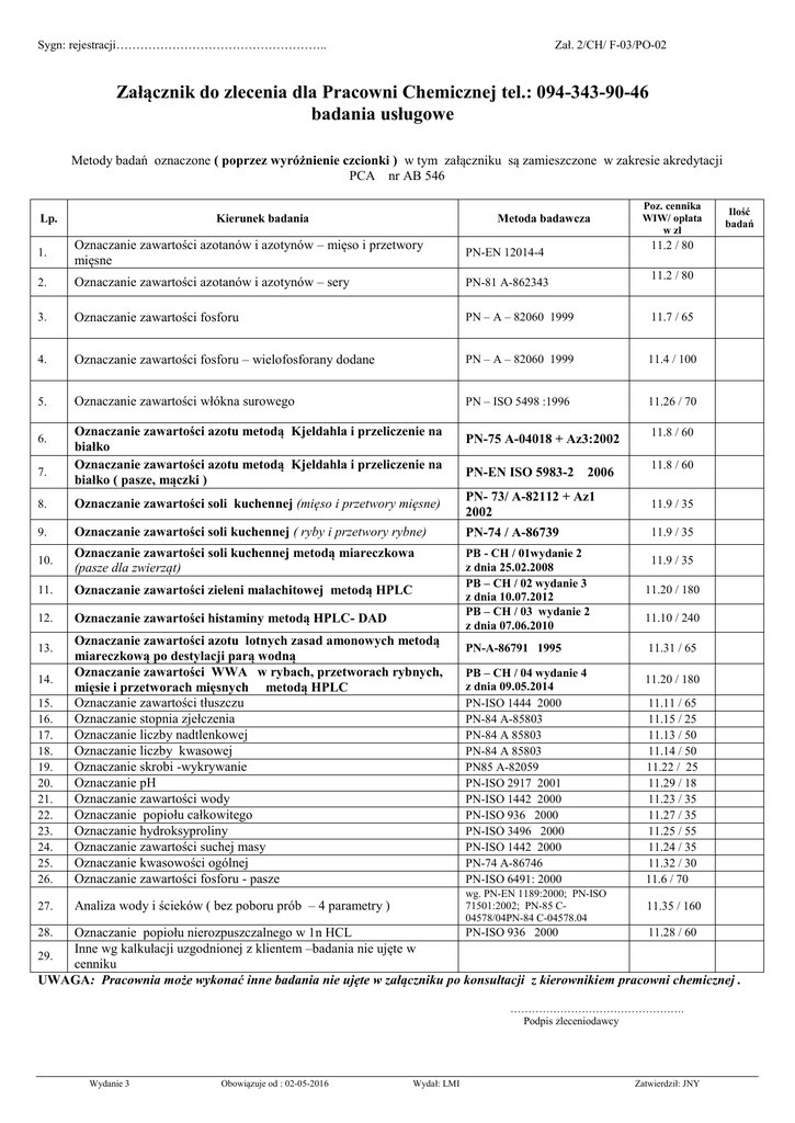 Zał. 2/CH/ F-03/PO-02 Sygn: rejestracji…………………………………………….. Załącznik do zlecenia F-02/PO-02 Załącznik do zlecenia dla Pracowni Chemicznej tel.: 094-343-90-46 badania usługowe Metody badań oznaczone ( poprzez wyróżnienie czcionki ) w tym załączniku są zamieszczone w zakresie akredytacji PCA nr AB 546 Lp. Kierunek badania Metoda badawcza Poz. cennika WIW/ opłata w zł 1. Oznaczanie zawartości azotanów i azotynów – mięso i przetwory mięsne PN-EN 12014-4 2. Oznaczanie zawartości azotanów i azotynów – sery PN-81 A-862343 3. Oznaczanie zawartości fosforu PN – A – 82060 1999 11.7 / 65 4. Oznaczanie zawartości fosforu – wielofosforany dodane PN – A – 82060 1999 11.4 / 100 5. Oznaczanie zawartości włókna surowego PN – ISO 5498 :1996 11.26 / 70 6. 7. Oznaczanie zawartości azotu metodą Kjeldahla i przeliczenie na białko Oznaczanie zawartości azotu metodą Kjeldahla i przeliczenie na białko ( pasze, mączki ) 11.2 / 80 11.2 / 80 PN-75 A-04018 + Az3:2002 PN-EN ISO 5983-2 2006 11.8 / 60 11.8 / 60 8. Oznaczanie zawartości soli kuchennej (mięso i przetwory mięsne) PN- 73/ A-82112 + Az1 2002 11.9 / 35 9. Oznaczanie zawartości soli kuchennej ( ryby i przetwory rybne) PN-74 / A-86739 11.9 / 35 10. Oznaczanie zawartości soli kuchennej metodą miareczkowa (pasze dla zwierząt) 11. Oznaczanie zawartości zieleni malachitowej metodą HPLC 11.20 / 180 12. Oznaczanie zawartości histaminy metodą HPLC- DAD PB - CH / 01wydanie 2 z dnia 25.02.2008 PB – CH / 02 wydanie 3 z dnia 10.07.2012 PB – CH / 03 wydanie 2 z dnia 07.06.2010 PN-A-86791 1995 11.31 / 65 15. 16. 17. 18. 19. 20. 21. 22. 23. 24. 25. 26. Oznaczanie zawartości azotu lotnych zasad amonowych metodą miareczkową po destylacji parą wodną Oznaczanie zawartości WWA w rybach, przetworach rybnych, mięsie i przetworach mięsnych metodą HPLC Oznaczanie zawartości tłuszczu Oznaczanie stopnia zjełczenia Oznaczanie liczby nadtlenkowej Oznaczanie liczby kwasowej Oznaczanie skrobi -wykrywanie Oznaczanie pH Oznaczanie zawartości wody Oznaczanie popiołu całkowitego Oznaczanie hydroksyproliny Oznaczanie zawartości suchej masy Oznaczanie kwasowości ogólnej Oznaczanie zawartości fosforu - pasze 27. Analiza wody i ścieków ( bez poboru prób – 4 parametry ) 13. 14. Ilość badań PB – CH / 04 wydanie 4 z dnia 09.05.2014 PN-ISO 1444 2000 PN-84 A-85803 PN-84 A 85803 PN-84 A 85803 PN85 A-82059 PN-ISO 2917 2001 PN-ISO 1442 2000 PN-ISO 936 2000 PN-ISO 3496 2000 PN-ISO 1442 2000 PN-74 A-86746 PN-ISO 6491: 2000 wg. PN-EN 1189:2000; PN-ISO 71501:2002; PN-85 C04578/04PN-84 C-04578.04 11.9 / 35 11.10 / 240 11.20 / 180 11.11 / 65 11.15 / 25 11.13 / 50 11.14 / 50 11.22 / 25 11.29 / 18 11.23 / 35 11.27 / 35 11.25 / 55 11.24 / 35 11.32 / 30 11.6 / 70 11.35 / 160 PN-ISO 936 2000 11.28 / 60 Oznaczanie popiołu nierozpuszczalnego w 1n HCL Inne wg kalkulacji uzgodnionej z klientem –badania nie ujęte w 29. cenniku UWAGA: Pracownia może wykonać inne badania nie ujęte w załączniku po konsultacji z kierownikiem pracowni chemicznej . 28. …………………………………………. Podpis zleceniodawcy Wydanie 3 Obowiązuje od : 02-05-2016 Wydał: LMI Zatwierdził: JNY