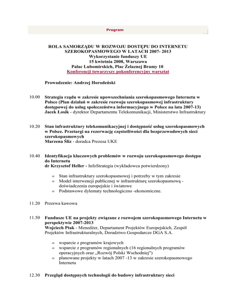 Program ROLA SAMORZĄDU W ROZWOJU DOSTĘPU DO INTERNETU SZEROKOPASMOWEGO W LATACH 2007- 2013 Wykorzystanie funduszy UE 15 kwietnia 2008, Warszawa Pałac Lubomirskich, Plac śelaznej Bramy 10 Konferencji towarzyszy pokonferencyjny warsztat Prowadzenie: Andrzej Horodeński 10.00 Strategia rządu w zakresie upowszechniania szerokopasmowego Internetu w Polsce (Plan działań w zakresie rozwoju szerokopasmowej infrastruktury dostępowej do usług społeczeństwa informacyjnego w Polsce na lata 2007-13) Jacek Łosik - dyrektor Departamentu Telekomunikacji, Ministerstwo Infrastruktury 10.20 Stan infrastruktury telekomunikacyjnej i dostępność usług szerokopasmowych w Polsce. Przetargi na rezerwację częstotliwości dla bezprzewodowych sieci szerokopasmowych Marzena Śliz - doradca Prezesa UKE 10.40 Identyfikacja kluczowych problemów w rozwoju szerokopasmowego dostępu do Internetu dr Krzysztof Heller - InfoStrategia (wykładowca potwierdzony) • • • Stan infrastruktury szerokopasmowej i potrzeby w tym zakresie Model interwencji publicznej w infrastrukturę szerokopasmową doświadczenia europejskie i światowe Podstawowe dylematy technologiczno -ekonomiczne. 11.20 Przerwa kawowa 11.50 Fundusze UE na projekty związane z rozwojem szerokopasmowego Internetu w perspektywie 2007-2013 Wojciech Ptak - MenedŜer, Departament Projektów Europejskich, Zespół Projektów Infrastrukturalnych, Doradztwo Gospodarcze DGA S.A. • • • 12.30 wsparcie z programów krajowych wsparcie z programów regionalnych (16 regionalnych programów operacyjnych oraz „Rozwój Polski Wschodniej") planowane projekty w latach 2007 -13 w zakresie szerokopasmowego Internetu Przegląd dostępnych technologii do budowy infrastruktury sieci szerokopasmowych Andrzej M. Skrzeczkowski - kierownik Działu InŜynierii Sieci, NASK (wykład potwierdzony) 13.00 Lunch 13.45 Doświadczenia i wnioski z realizacji projektów samorządowych w rozwoju szerokopasmowego Internetu • • • 15.15 Małopolska Sieć Szerokopasmowa - relacja z realizacji projektu sieci regionalnej Wojciech Ptak, DGA i dr Krzysztof Heller, InfoStrategia (wykład potwierdzony E-Świętokrzyskie - radiowa sieć wojewódzka po roku od uruchomienia: rzeczywiste koszty budowy i eksploatacji sieci Andrzej M. Skrzeczkowski - kierownik Działu InŜynierii Sieci, NASK (wykład potwierdzony) e-Przesmyki - gmina wiejska samodzielnie realizująca projekty za unijne pieniądze Andrzej Skolimowski, wójt gminy Przesmyki (wykład potwierdzony) Dyskusja i podsumowanie Budowa infrastruktury dostępowej we współpracy samorządu gminnego z operatorem telekomunikacyjnym: Jaki model współpracy i rozwiązanie wybrać realizując projekty szerokopasmowego Internetu? Uczestnicy dyskusji: Marzena Śliz - UKE, Wojciech Ptak - DGA, dr Krzysztof Heller - Infostrategia, Andrzej M. Skrzeczkowski - kierownik Działu InŜynierii Sieci, NASK, Andrzej Skolimowski - wójt gminy Przesmyki, Tomasz Białobłocki - TPSA, (uczestnicy potwierdzeni) 16.15 Zakończenie pierwszego dnia konferencji
