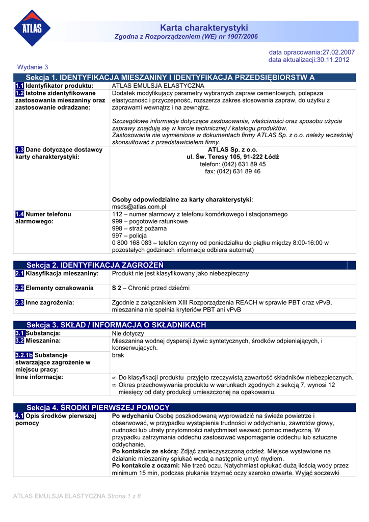 Karta charakterystyki Zgodna z Rozporządzeniem (WE) nr 1907/2006 data opracowania:27.02.2007 data aktualizacji:30.11.2012 Wydanie 3 Sekcja 1. IDENTYFIKACJA MIESZANINY I IDENTYFIKACJA PRZEDSIĘBIORSTW A 1.1 Identyfikator produktu: 1.2 Istotne zidentyfikowane zastosowania mieszaniny oraz zastosowanie odradzane: 1.3 Dane dotyczące dostawcy karty charakterystyki: 1.4 Numer telefonu alarmowego: ATLAS EMULSJA ELASTYCZNA Dodatek modyfikujący parametry wybranych zapraw cementowych, polepsza elastyczność i przyczepność, rozszerza zakres stosowania zapraw, do użytku z zaprawami wewnątrz i na zewnątrz. Szczegółowe informacje dotyczące zastosowania, właściwości oraz sposobu użycia zaprawy znajdują się w karcie technicznej / katalogu produktów. Zastosowania nie wymienione w dokumentach firmy ATLAS Sp. z o.o. należy wcześniej skonsultować z przedstawicielem firmy. ATLAS Sp. z o.o. ul. Św. Teresy 105, 91-222 Łódź telefon: (042) 631 89 45 fax: (042) 631 89 46 Osoby odpowiedzialne za karty charakterystyki: [email protected] 112 – numer alarmowy z telefonu komórkowego i stacjonarnego 999 – pogotowie ratunkowe 998 – straż pożarna 997 – policja 0 800 168 083 – telefon czynny od poniedziałku do piątku między 8:00-16:00 w pozostałych godzinach informacje odbiera automat) Sekcja 2. IDENTYFIKACJA ZAGROŻEŃ 2.1 Klasyfikacja mieszaniny: Produkt nie jest klasyfikowany jako niebezpieczny 2.2 Elementy oznakowania S 2 – Chronić przed dziećmi 2.3 Inne zagrożenia: Zgodnie z załącznikiem XIII Rozporządzenia REACH w sprawie PBT oraz vPvB, mieszanina nie spełnia kryteriów PBT ani vPvB Sekcja 3. SKŁAD / INFORMACJA O SKŁADNIKACH 3.1 Substancja: 3.2 Mieszanina: 3.2.1b Substancje stwarzające zagrożenie w miejscu pracy: Inne informacje: Nie dotyczy Mieszanina wodnej dyspersji żywic syntetycznych, środków odpieniających, i konserwujących. brak • Do klasyfikacji produktu przyjęto rzeczywistą zawartość składników niebezpiecznych. • Okres przechowywania produktu w warunkach zgodnych z sekcją 7, wynosi 12 miesięcy od daty produkcji umieszczonej na opakowaniu. Sekcja 4. ŚRODKI PIERWSZEJ POMOCY 4.1 Opis środków pierwszej pomocy Po wdychaniu Osobę poszkodowaną wyprowadzić na świeże powietrze i obserwować, w przypadku wystąpienia trudności w oddychaniu, zawrotów głowy, nudności lub utraty przytomności natychmiast wezwać pomoc medyczną. W przypadku zatrzymania oddechu zastosować wspomaganie oddechu lub sztuczne oddychanie. Po kontakcie ze skórą: Zdjąć zanieczyszczoną odzież. Miejsce wystawione na działanie mieszaniny spłukać wodą a następnie umyć mydłem. Po kontakcie z oczami: Nie trzeć oczu. Natychmiast opłukać dużą ilością wody przez minimum 15 min, podczas płukania trzymać oczy szeroko otwarte. Wyjąć soczewki ATLAS EMULSJA ELASTYCZNA Strona 1 z 8 Karta charakterystyki Zgodna z Rozporządzeniem (WE) nr 1907/2006 data opracowania:27.02.2007 data aktualizacji:30.11.2012 Wydanie 3 4.2 Najważniejsze ostre i opóźnione objawy oraz skutki narażenia kontaktowe. Konieczna konsultacja okulistyczna. Po połknięciu: Nie wywoływać wymiotów, nie podawać niczego doustnie. Skontaktować się z lekarzem. Należy przestrzegać uwag dotyczących bezpieczeństwa i użytkowania zamieszczonych na etykiecie. Natychmiast usuwać produkt za skóry, oczu i śluzówek, co pozwoli zapobiec wszelkim opóźnionym skutkom narażenia. 4.3 Wskazania dotyczące wszelkiej natychmiastowej pomocy lekarskiej i szczególnego postępowania z poszkodowanym W przypadku wystąpienia jakichkolwiek niepokojących objawów wezwać natychmiast pomoc medyczną, pokazać kartę charakterystyki, opakowanie lub etykietę. W przypadku kontaktu z oczami lub śluzówkami wskazana jest konsultacja medyczna. Wskazany jest dostęp do bieżącej wody. W przypadku wielokrotnego lub długotrwałego kontaktu ze skórą stosować kremy ochronne. Sekcja 5. POSTĘPOWANIE W PRZYPADKU POŻARU Każdy pracownik powinien zasięgnąć informacji na temat zagrożeń pożarowych na jego stanowisku pracy i w najbliższym otoczeniu. Stanowisko pracy powinno być utrzymane w należytym porządku. Materiały łatwopalne nie mogą znajdować się w pobliżu urządzeń elektrycznych, piecyków czy innych źródeł ognia. W przypadku powstania pożaru należy niezwłocznie, przy użyciu wszystkich dostępnych środków, zaalarmować osoby będące w strefie zagrożenia i wezwać straż pożarną (patrz: sekcja 1.4) podając niezbędne informacje umożliwiające rozpoczęcie akcji przeciwpożarowej (podać gdzie powstało zdarzenie - dokładny adres, co się pali lub jaki rodzaj zagrożenia zaistniał, czy istnieje zagrożenie dla życia ludzkiego, nr telefonu, z którego się alarmuje oraz swoje imię i nazwisko) Następnie przystąpić niezwłocznie, przy użyciu miejscowych środków gaśniczych do gaszenia pożaru i nieść pomoc osobom zagrożonym w przypadku koniecznym przystąpić do ewakuacji ludzi i mienia. Należy czynności te wykonać w taki sposób aby nie doszło do powstania paniki jaka może ogarnąć ludzi będących w zagrożeniu, które wywołuje u ludzi ogień i dym. Panika może być przyczyną niepotrzebnych i tragicznych w skutkach wypadków w trakcie prowadzenia działań ratowniczo gaśniczych. Dlatego prowadząc jakiekolwiek działania w przypadku powstania pożar należy kierować się rozwagą w podejmowaniu decyzji. Do czasu przybycia straży pożarnej kierowanie akcją obejmuje specjalnie do tej funkcji powołana osoba. Należy pamiętać o ochronie dróg oddechowych przed dymem poprzez stosowanie zwilżonych chusteczek oraz poruszania się w dolnych partiach w pomieszczeniach o dużym stopniu zadymienia. 5.1 Środki gaśnicze Odpowiednie środki gaśnicze: Piana, proszki gaśnicze, piasek, dwutlenek węgla, woda – prądy rozproszone. Niewłaściwe środki gaśnicze: Nie stosować wody w pełnym strumieniu. 5.2 Szczególne zagrożenia W przypadku pożaru mo