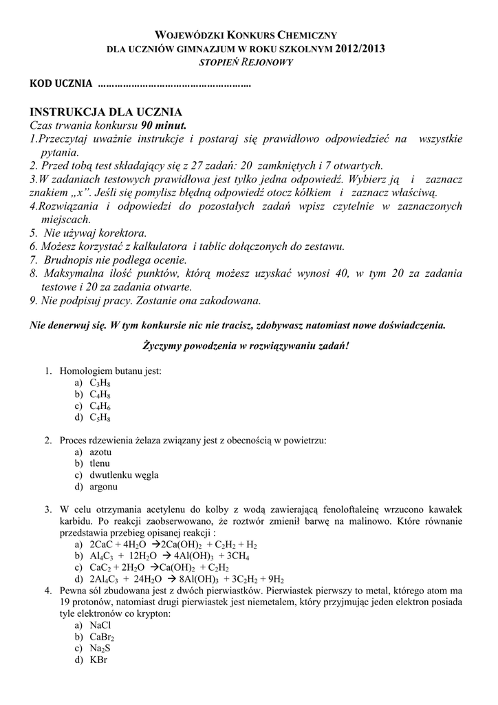 WOJEWÓDZKI KONKURS CHEMICZNY DLA UCZNIÓW GIMNAZJUM W ROKU SZKOLNYM 2012/2013 STOPIEŃ REJONOWY KOD UCZNIA ………………………………………………. INSTRUKCJA DLA UCZNIA Czas trwania konkursu 90 minut. 1.Przeczytaj uważnie instrukcje i postaraj się prawidłowo odpowiedzieć na wszystkie pytania. 2. Przed tobą test składający się z 27 zadań: 20 zamkniętych i 7 otwartych. 3.W zadaniach testowych prawidłowa jest tylko jedna odpowiedź. Wybierz ją i zaznacz znakiem „x”. Jeśli się pomylisz błędną odpowiedź otocz kółkiem i zaznacz właściwą. 4.Rozwiązania i odpowiedzi do pozostałych zadań wpisz czytelnie w zaznaczonych miejscach. 5. Nie używaj korektora. 6. Możesz korzystać z kalkulatora i tablic dołączonych do zestawu. 7. Brudnopis nie podlega ocenie. 8. Maksymalna ilość punktów, którą możesz uzyskać wynosi 40, w tym 20 za zadania testowe i 20 za zadania otwarte. 9. Nie podpisuj pracy. Zostanie ona zakodowana. Nie denerwuj się. W tym konkursie nic nie tracisz, zdobywasz natomiast nowe doświadczenia. Życzymy powodzenia w rozwiązywaniu zadań! 1. Homologiem butanu jest: a) C3H8 b) C4H8 c) C4H6 d) C5H8 2. Proces rdzewienia żelaza związany jest z obecnością w powietrzu: a) azotu b) tlenu c) dwutlenku węgla d) argonu 3. W celu otrzymania acetylenu do kolby z wodą zawierającą fenoloftaleinę wrzucono kawałek karbidu. Po reakcji zaobserwowano, że roztwór zmienił barwę na malinowo. Które równanie przedstawia przebieg opisanej reakcji : a) 2CaC + 4H2O 2Ca(OH)2 + C2H2 + H2 b) Al4C3 + 12H2O 4Al(OH)3 + 3CH4 c) CaC2 + 2H2O Ca(OH)2 + C2H2 d) 2Al4C3 + 24H2O 8Al(OH)3 + 3C2H2 + 9H2 4. Pewna sól zbudowana jest z dwóch pierwiastków. Pierwiastek pierwszy to metal, którego atom ma 19 protonów, natomiast drugi pierwiastek jest niemetalem, który przyjmując jeden elektron posiada tyle elektronów co krypton: a) NaCl b) CaBr2 c) Na2S d) KBr 5. Który związek ma najmniejszą masę cząsteczkową? a) azotan(V) sodu b) siarczan(IV) sodu c) węglan wapnia d) azotan(V) glinu 6. Ile ważą 3 mole ozonu? a) 32g b) 48g c) 96g d) 144g 7. W cząsteczce heksanu pomiędzy atomami węgla: a) występuje jedno potrójne wiązanie a pozostałe to wiązania pojedyncze b) występuje jedno podwójne wiązanie a pozostałe to wiązania pojedyncze c) występują tylko wiązania pojedyncze d) występują tylko wiązania wielokrotne 8. W cząsteczce bromu wiązanie tworzy się poprzez: a) elektrostatyczne przyciąganie między kationem i anionem b) uwspólnianie elektronów walencyjnych obu atomów bromu z utworzeniem wiązania pojedynczego c) uwspólnienie elektronów walencyjnych obu atomów bromu z utworzeniem wiązania potrójnego d) uwspólnienie elektronów walencyjnych obu atomów bromu z utworzeniem wiązania podwójnego 9. Uczniowie identyfikowali na lekcji chemii gazy: azot, wodór, tlen, tlenek węgla (IV). Określ, która z obserwacji dotyczyła wodoru: a) gaz bezbarwny, bezwonny, powoduje mętnienie wody wapiennej b) gaz bezbarwny, bezwonny, nie podtrzymuje palenia c) gaz bezbarwny, bezwonny, podtrzymuje palenie d) gaz bezbarwny, bezwonny, mający najmniejszą gęstość ze wszystkich identyfikowanych gazów. 10. W jakim stosunku masowym należ zmieszać 20% roztwór soli z wodą aby otrzymać roztwór 12%? a) 2 : 1 b) 3 : 2 c) 3: 4 d) 5 : 2 11. Jak zmieni się stężenie procentowe roztworu, jeżeli dwukrotnie zwiększy się masę substancji rozpuszczonej. a) b) c) d) zwiększy się dwukrotnie wzrośnie zwiększy się czterokrotnie zmaleje 12. Kwasy tlenowe otrzymujemy podczas: a) działania tlenem na niemetale b) rozpuszczania niemetalu w wodzie c) rozpuszczania tlenku kwasowego w wodzie d) rozpuszczania w wodzie produktu reakcji wodoru z niemetalem. 13. Do gazów cieplarnianych zaliczamy między innymi: a) wodór, azot b) tlenek azotu(III), tlenek siarki(VI) c) metan, dwutlenek węgla d) para wodna, tlenek siarki(VI) 14. Zbiór zawierający atom, kation, anion: Ne Mg2+ F- łączy jedna wspólna cecha: a) należą do metali b) należą do tego samego okresu c) posiadają tyle samo elektronów d) posiadają taką samą liczbę protonów w jądrze 15. Jeden z kwasów zawiera dwa atomy wodoru w cząsteczce, a drugi – trzy atomy wodoru w cząsteczce. Ich masy molowe są takie same i wynoszą po 98 g/mol. Stosunek mas molowych soli sodowych tych kwasów wynosi. a) 71:82 b) 27:34 c) 2:3 d) 1:1 16. Właściwości higroskopijnych nie posiada: a) kwas azotowy(V) b) kwas siarkowy(VI) c) wodorotlenek sodu d) wodorotlenek potasu 17. Które z wymienionych niżej tlenków mogą reagować z zasadą potasową : I. FeO II. CO2 III. SO2 IV. Na2O a) I , II , III, IV b) I , II, IV c) III , IV , I d) II , III 18. Która z poniższych substancji rozpuszczona w wodzie nie przewodzi prądu elektrycznego? a) soda żrąca b) sól kamienna c) kwas solny d) cukier 19. Deuter i tryt są: a) izotopami b) atomami różnych pierwiastków c) homologami d) izomerami 20. Ile gramów tlenu znajduje się w 67,2dm3 tlenku węgla(IV)? a) 16g b) 32g c) 48g d) 96g 21. (2p) Pewien metal tworzy z tlenem związek, w którym stosunek molowy metalu do tlenu wynosi 2:1. Podczas reakcji wodorotlenku tego metalu z tlenkiem siarki(IV) powstaje sól o masie 158g/mol. Ustal masę molową metalu występującego w soli oraz napisz wzór sumaryczny soli uwzględniając poprawny symbol metalu. 22. (3p) Narysuj wzory półstrukturalne trzech izomerów związku o wzorze C5H12. 23. (5p) Trzy probówki oznaczone literami A, B, C zawierają roztwory różnych substancji. Są to: azotan(V) żelaza(II), węglan amonu, siarczek potasu. Na podstawie opisów doświadczeń określ jakie substancje znajdowały się w oznaczonych probówkach oraz zapisz jonowe skrócone równania reakcji przedstawione w opisie. I. Do wszystkich probówek zawierających substancje A, B, C dodano kwas chlorowodorowy. W probówce A wydzielił się gaz o charakterystycznym zapachu, natomiast w probówce C wydzielił się gaz bezwo