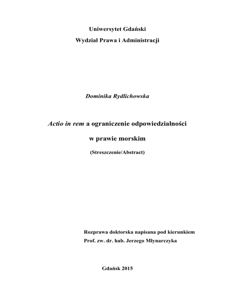 Uniwersytet Gdański Wydział Prawa i Administracji Dominika Rydlichowska Actio in rem a ograniczenie odpowiedzialności w prawie morskim (Streszczenie/Abstract) Rozprawa doktorska napisana pod kierunkiem Prof. zw. dr. hab. Jerzego Młynarczyka Gdańsk 2015 Streszczenie/Abstract STRESZCZENIE Actio in rem a ograniczenie odpowiedzialności w prawie morskim Niniejsza rozprawa doktorska podejmuje analizę zagadnienia actio in rem w kontekście ograniczenia odpowiedzialności w prawie morskim. Zawiera także rozważania na temat zasadności wprowadzenia actio in rem do systemu prawa polskiego. W ocenie autorki, actio in rem jest instytucją z pogranicza prawa materialnego i procesowego, co nie jest niczym szczególnym w prawie morskim, bowiem zarówno Kodeks morski jak i międzynarodowe konwencje niejednokrotnie zawierają przepisy materialne oraz proceduralne regulujące określoną materię. Uzasadnieniem dla wyboru tematu pracy jest porównanie materialnej instytucji ograniczenia odpowiedzialności z procesowym powództwem przeciwko rzeczy (statkowi morskiemu) w stosunkach żeglugowych. Nie można postawić znaku równości pomiędzy tymi dwoma zagadnieniami, gdyż ograniczenie odpowiedzialności to ograniczenie osobistego obowiązku świadczenia dłużnika. Natomiast actio in rem ma na celu koncentrację odpowiedzialności na danej rzeczy i zaspokojenie z niej dłużnika. Zwykle wartość statku wystarcza na pokrycie roszczeń wierzycieli, chyba, że roszczenie spowodowane jest szkodami olejowymi, kiedy to rozmiar szkód może znacznie przewyższać wartość statku. W tym przypadku odpowiedzialność przejmuje fundusz i jest ona z góry ograniczona limitami konwencyjnymi. Szczególna uwaga została poświęcona poszukiwaniu w prawie cywilnym i morskim instytucji o cechach charakterystycznych dla actio in rem. Przykładowo w prawie cywilnym zastaw czy hipoteka noszą cechy postępowania co do rzeczy i stanowią jednocześnie przejawy odpowiedzialności rzeczowej dłużnika z określonej rzeczy. Jednakże przedmiotem rozprawy będzie głównie analiza instytucji prawa morskiego, w szczególności postępowania wobec statku morskiego. Biorąc pod uwagę okoliczności świadczące na korzyść actio in rem oraz istnienie w polskim prawie odpowiedzialności z rzeczy, autorka rozważa o jej wprowadzeniu do krajowego systemu prawnego. Omawiana instytucja z pewnością znalazłaby zastosowanie, zwłaszcza w stosunkach morskich. Przede wszystkim, actio in rem daje wierzycielowi większą gwarancję zaspokojenia jego roszczeń, bowiem wierzyciel kieruje swoje roszczenia przeciwko statkowi i bezpośrednio z niego zaspokaja swoje roszczenia. Zatem to rzecz odpowiada za długi 2 Streszczenie/Abstract swojego właściciela lub innej osoby posługującej się nią, jeżeli osoby te nie przystąpią do postępowania. Jest to powództwo o zaspokojenie się z danej rzeczy (res), a odpowiedzialność dłużnika koncentruje się niejako na rzeczy. Taki rodzaj odpowiedzialności ze statku jest charakterystyczny dla prawa anglosaskiego i sprawdza się w nim od stuleci. Stąd też, rozważając o potrzebie wprowadzenia actio in rem do prawa polskiego, autorka sugeruje zaczerpnięcie wzorców z systemu common law. Pozwanie rzeczy - statku morskiego - umożliwia bardziej skuteczne dochodzenie roszczeń, a jednocześnie - w przypadku większości roszczeń – stanowi ograniczenie odpowiedzialności dłużnika do wartości statku. Natomiast inna sytuacja będzie miała miejsce przy roszczeniach z tytułu wycieków olejowych, gdzie rozmiar szkody może znacznie przewyższać wartość statku. Odpowiedzialność przechodzi wtedy na fundusz ograniczenia odpowiedzialności. Główne cele rozprawy to: wykazanie istnienia instytucji o cechach charakterystycznych dla actio in rem w polskim prawie cywilnym i morskim; ocena przydatności wprowadzenia actio in rem do polskiego porządku prawnego; rozważenie propozycji nowelizacji Kodeksu morskiego w aspekcie wprowadzenia actio in rem do prawa krajowego, opartej na rozwiązaniach prawa anglosaskiego i sformułowanie wniosków de lege ferenda. Podstawę źródłową rozprawy stanowią akty prawne oraz judykatura. W dysertacji odwoływano się do licznych orzeczeń sądów polskich oraz brytyjskich i amerykańskich, które ilustrują sposób funkcjonowania actio in rem oraz potwierdzają zalety jej stosowania. W wielu miejscach autorka oparła się na literaturze polskiej i zagranicznej (głównie anglojęzycznej). Korzystała także z literatury francuskiej oraz włoskiej, jednakże czyniła to bardziej w kontekście prawnoporównawczym niż prawotwórczym. W pracy posłużono się metodologią badań dogmatyczno-prawnych, historycznych, porównawczych i teoretycznych oraz empirycznych. Za pomocą metody dogmatycznoprawnej dokonana została analiza obowiązujących przepisów, ich wzajemnych powiązań, a także orzeczeń sądowych i poglądów przedstawicieli doktryny prawa morskiego i cywilnego. 3 Streszczenie/Abstract Uwzględnienie aspektów historycznych pozwoliło na wskazanie rodowodu instytucji actio in rem i sposobu jej wykorzystywania w prawie rzymskim. Z kolei, zastosowana metoda porównawcza pozwoliła na zestawienie systemu prawa kontynentalnego z prawem anglosaskim w zakresie postępowania o dochodzenie roszczeń morskich. Specyfika tematu wręcz obligowała autorkę do skorzystania z tej metody badawczej, gdyż omawiana actio in rem nie występuje w prawie kontynentalnym i należało przedstawić sposób funkcjonowania i zastosowania actio in rem. Badania teoretyczne dotyczyły również poszukiwania instytucji o cechach actio in rem w polskim prawie cywilnym i morskim. Autorka posłużyła się metodą empiryczną do badania wyroków polskich sądów i izb morskich oraz orzecznictwa anglosaskiego zawierających definicję statku morskiego. Następnie omówiła te wyroki na łamach niniejszej rozprawy. Praca składa się ze wstępu i sześciu rozdziałów. W 