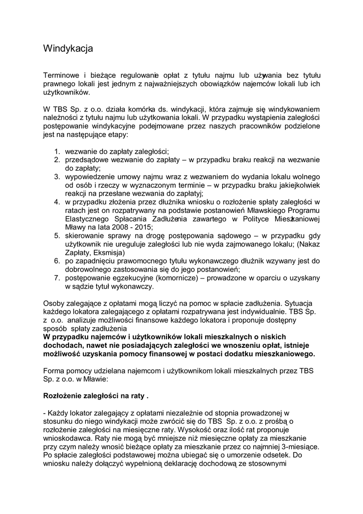 Windykacja Terminowe i bieżące regulowanie opłat z tytułu najmu lub używania bez tytułu prawnego lokali jest jednym z najważniejszych obowiązków najemców lokali lub ich użytkowników. W TBS Sp. z o.o. działa komórka ds. windykacji, która zajmuje się windykowaniem należności z tytułu najmu lub użytkowania lokali. W przypadku wystąpienia zaległości postępowanie windykacyjne podejmowane przez naszych pracowników podzielone jest na następujące etapy: 1. wezwanie do zapłaty zaległości; 2. przedsądowe wezwanie do zapłaty – w przypadku braku reakcji na wezwanie do zapłaty; 3. wypowiedzenie umowy najmu wraz z wezwaniem do wydania lokalu wolnego od osób i rzeczy w wyznaczonym terminie – w przypadku braku jakiejkolwiek reakcji na przesłane wezwania do zapłatyj; 4. w przypadku złożenia przez dłużnika wniosku o rozłożenie spłaty zaległości w ratach jest on rozpatrywany na podstawie postanowień Mławskiego Programu Elastycznego Spłacania Zadłużenia zawartego w Polityce Mieszkaniowej Mławy na lata 2008 - 2015; 5. skierowanie sprawy na drogę postępowania sądowego – w przypadku gdy użytkownik nie ureguluje zaległości lub nie wyda zajmowanego lokalu; (Nakaz Zapłaty, Eksmisja) 6. po zapadnięciu prawomocnego tytułu wykonawczego dłużnik wzywany jest do dobrowolnego zastosowania się do jego postanowień; 7. postępowanie egzekucyjne (komornicze) – prowadzone w oparciu o uzyskany w sądzie tytuł wykonawczy. Osoby zalegające z opłatami mogą liczyć na pomoc w spłacie zadłużenia. Sytuacja każdego lokatora zalegającego z opłatami rozpatrywana jest indywidualnie. TBS Sp. z o.o. analizuje możliwości finansowe każdego lokatora i proponuje dostępny sposób spłaty zadłużenia W przypadku najemców i użytkowników lokali mieszkalnych o niskich dochodach, nawet nie posiadających zaległości we wnoszeniu opłat, istnieje możliwość uzyskania pomocy finansowej w postaci dodatku mieszkaniowego. Forma pomocy udzielana najemcom i użytkownikom lokali mieszkalnych przez TBS Sp. z o.o. w Mławie: Rozłożenie zaległości na raty . - Każdy lokator zalegający z opłatami niezależnie od stopnia prowadzonej w stosunku do niego windykacji może zwrócić się do TBS Sp. z o.o. z prośbą o rozłożenie zaległości na miesięczne raty. Wysokość oraz ilość rat proponuje wnioskodawca. Raty nie mogą być mniejsze niż miesięczne opłaty za mieszkanie przy czym należy wnosić bieżące opłaty za mieszkanie przez co najmniej 3-miesiące. Po spłacie zaległości podstawowej można ubiegać się o umorzenie odsetek. Do wniosku należy dołączyć wypełnioną deklarację dochodową ze stosownymi zaświadczeniami o dochodach dokumentującą że od co najmniej 3 miesięcy gospodarstwo domowe osiąga dochód uprawniający do najmu lokalu socjalnego ; -Zezwolić na przeprowadzenie wywiadu środowiskowego przez uprawnionych pracowników MOPS w zakresie niezbędnym dla potwierdzenia wykazanej we wniosku o oddłużenie sytuacji materialnej; -Wyrazić zgodę na zamianę lokalu w ramach mieszkaniowego zasobu Miasta na lokal o niższym czynszu, niższej kategorii wartości użytkowej, na lokal mniejszy lub na lokal o powierzchni normatywnej uprawniającej do przyznania dodatku mieszkaniowego Prolongata spłaty zaległości. Lokator zalegający z opłatami może w uzasadnionych przypadkach zwrócić się do TBS Sp. z o.o. o odroczenie terminu spłaty zaległości maksymalnie o 3 miesiące. W tym czasie jest zobowiązany do regulowania bieżących opłat związanych z lokalem mieszkalnym. Wnioski wraz z załącznikami składa się w sekretariacie TBS Sp. z o.o. Druki do pobrania: Wniosek o rozłożenie zaległości na raty Wniosek o prolongatę spłaty zaległości Wniosek o umorzenie odsetek