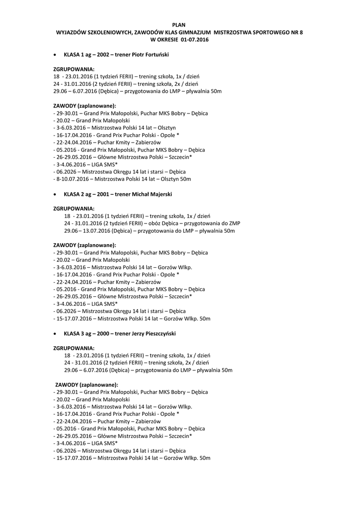 PLAN WYJAZDÓW SZKOLENIOWYCH, ZAWODÓW KLAS GIMNAZJUM MISTRZOSTWA SPORTOWEGO NR 8 W OKRESIE 01-07.2016 KLASA 1 ag – 2002 – trener Piotr Fortuński ZGRUPOWANIA: 18 - 23.01.2016 (1 tydzień FERII) – trening szkoła, 1x / dzień 24 - 31.01.2016 (2 tydzień FERII) – trening szkoła, 2x / dzień 29.06 – 6.07.2016 (Dębica) – przygotowania do LMP – pływalnia 50m ZAWODY (zaplanowane): - 29-30.01 – Grand Prix Małopolski, Puchar MKS Bobry – Dębica - 20.02 – Grand Prix Małopolski - 3-6.03.2016 – Mistrzostwa Polski 14 lat – Olsztyn - 16-17.04.2016 - Grand Prix Puchar Polski - Opole * - 22-24.04.2016 – Puchar Kmity – Zabierzów - 05.2016 - Grand Prix Małopolski, Puchar MKS Bobry – Dębica - 26-29.05.2016 – Główne Mistrzostwa Polski – Szczecin* - 3-4.06.2016 – LIGA SMS* - 06.2026 – Mistrzostwa Okręgu 14 lat i starsi – Dębica - 8-10.07.2016 – Mistrzostwa Polski 14 lat – Olsztyn 50m KLASA 2 ag – 2001 – trener Michał Majerski ZGRUPOWANIA: 18 - 23.01.2016 (1 tydzień FERII) – trening szkoła, 1x / dzień 24 - 31.01.2016 (2 tydzień FERII) – obóz Dębica – przygotowania do ZMP 29.06 – 13.07.2016 (Dębica) – przygotowania do LMP – pływalnia 50m ZAWODY (zaplanowane): - 29-30.01 – Grand Prix Małopolski, Puchar MKS Bobry – Dębica - 20.02 – Grand Prix Małopolski - 3-6.03.2016 – Mistrzostwa Polski 14 lat – Gorzów Wlkp. - 16-17.04.2016 - Grand Prix Puchar Polski - Opole * - 22-24.04.2016 – Puchar Kmity – Zabierzów - 05.2016 - Grand Prix Małopolski, Puchar MKS Bobry – Dębica - 26-29.05.2016 – Główne Mistrzostwa Polski – Szczecin* - 3-4.06.2016 – LIGA SMS* - 06.2026 – Mistrzostwa Okręgu 14 lat i starsi – Dębica - 15-17.07.2016 – Mistrzostwa Polski 14 lat – Gorzów Wlkp. 50m KLASA 3 ag – 2000 – trener Jerzy Pieszczyński ZGRUPOWANIA: 18 - 23.01.2016 (1 tydzień FERII) – trening szkoła, 1x / dzień 24 - 31.01.2016 (2 tydzień FERII) – trening szkoła, 2x / dzień 29.06 – 6.07.2016 (Dębica) – przygotowania do LMP – pływalnia 50m ZAWODY (zaplanowane): - 29-30.01 – Grand Prix Małopolski, Puchar MKS Bobry – Dębica - 20.02 – Grand Prix Małopolski - 3-6.03.2016 – Mistrzostwa Polski 14 lat – Gorzów Wlkp. - 16-17.04.2016 - Grand Prix Puchar Polski - Opole * - 22-24.04.2016 – Puchar Kmity – Zabierzów - 05.2016 - Grand Prix Małopolski, Puchar MKS Bobry – Dębica - 26-29.05.2016 – Główne Mistrzostwa Polski – Szczecin* - 3-4.06.2016 – LIGA SMS* - 06.2026 – Mistrzostwa Okręgu 14 lat i starsi – Dębica - 15-17.07.2016 – Mistrzostwa Polski 14 lat – Gorzów Wlkp. 50m