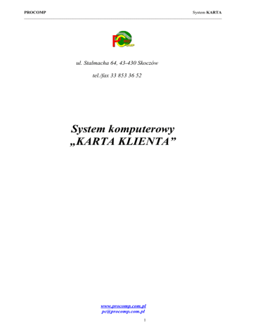 PROCOMP System KARTA _____________________________________________________________________________________________ ul. Stalmacha 64, 43-430 Skoczów tel./fax 33 853 36 52 System komputerowy „KARTA KLIENTA” www.procomp.com.pl [email protected] 1 System KARTA PROCOMP _____________________________________________________________________________________________ SPIS TREŚCI I OGÓLNE INFORMACJE O SYSTEMIE...............................................................................................................3 II OPIS FUNKCJI SYSTEMU....................................................................................................................................6 1. REJESTRACJA .......................................................................................................................................................6 1.1 RACHUNKÓW..........................................................................................................................................................6 1.2 KLIENTÓW I KART...................................................................................................................................................6 1.3 PLACÓWEK..............................................................................................................................................................6 1.4 KOPIOWANIE DANYCH ZE SKLEPÓW .........................................................................................................................7 1.5 OBSŁUGA DAT WAŻNOŚCI KART...............................................................................................................................7 2. PRZEGLĄDY EKRANOWE..................................................................................................................................7 2.1 WG KLIENTA, KARTY...............................................................................................................................................7 2.2 WG PLACÓWEK.......................................................................................................................................................8 2.3 ZESTAWIENIE OGÓLNE ............................................................................................................................................8 2.4 NAJLEPSZE KARTY ..................................................................................................................................................8 2.5 NAJLEPSI KLIENCI ...................................................................................................................................................8 2.6 POWRÓT DO MENU...................................................................................................................................................8 3. WYDRUKI................................................................................................................................................................8 3.1 WYDRUK DANYCH ZE WSKAZANEJ PLACÓWKI ..........................................................................................................8 3.2 WYDRUK DANYCH Z WSZYSTKICH PLACÓWEK..........................................................................................................9 4. POLSKIE ZNAKI.....................................................................................................................................................9 5. TRYB PRACY DRUKARKI.................................................................................................................................9 6. INDEKSOWANIE BAZ DANYCH......................................................................................................................10 7. LIKWIDACJA DANYCH .....................................................................................................................................10 8. PRZYWRACANIE DANYCH Z KOPII .............................................................................................................10 9. DANE O KOPIACH AUTOMATYCZNYCH ....................................................................................................10 10. LISTA DYSKÓW DO IMPORTU DANYCH ..................................................................................................11 11. LOKALIZACJA KOPII NA DYSKACH...........................................................................................................11 12. DOSTĘP DO INTERNETU.................................................................................................................................11 13. AKTUALIZACJA OPROGRAMOWANIA .....................................................................................................11 14. KONIEC PRACY.................................................................................................................................................11 III PRZECHOWYWANIE DANYCH OSOBOWYCH ........................................................................................12 2 PROCOMP System KARTA _____________________________________________________________________________________________ I OGÓLNE INFORMACJE O SYSTEMIE System KARTA KLIENTA umożliwia rejestrację i przegląd kartotek osób posiadających kartę klienta oraz bonifikat udzielonych przez poszczególne placówki. Eksploatacyjne możliwości Systemu zostały odpowiednio pogrupowane. Strzałki kierunkowe pozwalają wskazywać właściwy problem. Klawisz Enter służy do zaakceptowania wybranego zagadnienia. Zmiana realizowanego zagadnienia następuje wyłącznie poprzez powrót do GŁÓWNEGO MENU za pomocą klawisza F10. W każdej części systemu klawisz INSERT wywołuje kalkulator. Wywołując podpowiedź klawiszem F1 możemy zapoznać się z zasadą jego działania. Przypadkowe naciśnięcie klawisza ENTER nie musi powodować wykonywania nie chcianej czynności. Zawsze w dolnej części ekranu lub z prawej strony znajdzi