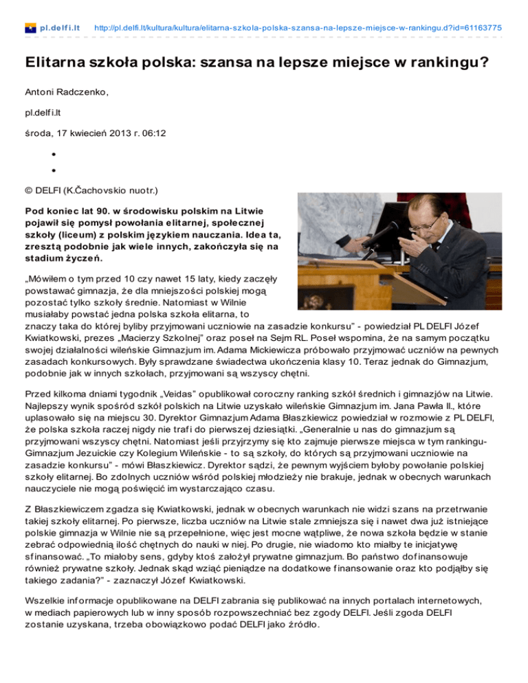 pl.de lf i.lt http://pl.delfi.lt/kultura/kultura/elitarna-szko la-po lska-szansa-na-lepsze-miejsce-w-rankingu.d?id=61163775 Elitarna szkoła polska: szansa na lepsze miejsce w rankingu? Antoni Radczenko, pl.delf i.lt środa, 17 kwiecień 2013 г. 06:12 © DELFI (K.Čachovskio nuotr.) Pod koniec lat 90. w środowisku polskim na Litwie pojawił się pomysł powołania elitarnej, społecznej szkoły (liceum) z polskim językiem nauczania. Idea ta, zresztą podobnie jak wiele innych, zakończyła się na stadium życzeń. „Mówiłem o tym przed 10 czy nawet 15 laty, kiedy zaczęły powstawać gimnazja, że dla mniejszości polskiej mogą pozostać tylko szkoły średnie. Natomiast w Wilnie musiałaby powstać jedna polska szkoła elitarna, to znaczy taka do której byliby przyjmowani uczniowie na zasadzie konkursu” - powiedział PL DELFI Józef Kwiatkowski, prezes „Macierzy Szkolnej” oraz poseł na Sejm RL. Poseł wspomina, że na samym początku swojej działalności wileńskie Gimnazjum im. Adama Mickiewicza próbowało przyjmować uczniów na pewnych zasadach konkursowych. Były sprawdzane świadectwa ukończenia klasy 10. Teraz jednak do Gimnazjum, podobnie jak w innych szkołach, przyjmowani są wszyscy chętni. Przed kilkoma dniami tygodnik „Veidas” opublikował coroczny ranking szkół średnich i gimnazjów na Litwie. Najlepszy wynik spośród szkół polskich na Litwie uzyskało wileńskie Gimnazjum im. Jana Pawła II., które uplasowało się na miejscu 30. Dyrektor Gimnazjum Adama Błaszkiewicz powiedział w rozmowie z PL DELFI, że polska szkoła raczej nigdy nie traf i do pierwszej dziesiątki. „Generalnie u nas do gimnazjum są przyjmowani wszyscy chętni. Natomiast jeśli przyjrzymy się kto zajmuje pierwsze miejsca w tym rankinguGimnazjum Jezuickie czy Kolegium Wileńskie - to są szkoły, do których są przyjmowani uczniowie na zasadzie konkursu” - mówi Błaszkiewicz. Dyrektor sądzi, że pewnym wyjściem byłoby powołanie polskiej szkoły elitarnej. Bo zdolnych uczniów wśród polskiej młodzieży nie brakuje, jednak w obecnych warunkach nauczyciele nie mogą poświęcić im wystarczająco czasu. Z Błaszkiewiczem zgadza się Kwiatkowski, jednak w obecnych warunkach nie widzi szans na przetrwanie takiej szkoły elitarnej. Po pierwsze, liczba uczniów na Litwie stale zmniejsza się i nawet dwa już istniejące polskie gimnazja w Wilnie nie są przepełnione, więc jest mocne wątpliwe, że nowa szkoła będzie w stanie zebrać odpowiednią ilość chętnych do nauki w niej. Po drugie, nie wiadomo kto miałby te inicjatywę sf inansować. „To miałoby sens, gdyby ktoś założył prywatne gimnazjum. Bo państwo dof inansowuje również prywatne szkoły. Jednak skąd wziąć pieniądze na dodatkowe f inansowanie oraz kto podjąłby się takiego zadania?” - zaznaczył Józef Kwiatkowski. Wszelkie inf ormacje opublikowane na DELFI zabrania się publikować na innych portalach internetowych, w mediach papierowych lub w inny sposób rozpowszechniać bez zgody DELFI. Jeśli zgoda DELFI zostanie uzyskana, trzeba obowiązkowo podać DELFI jako źródło.