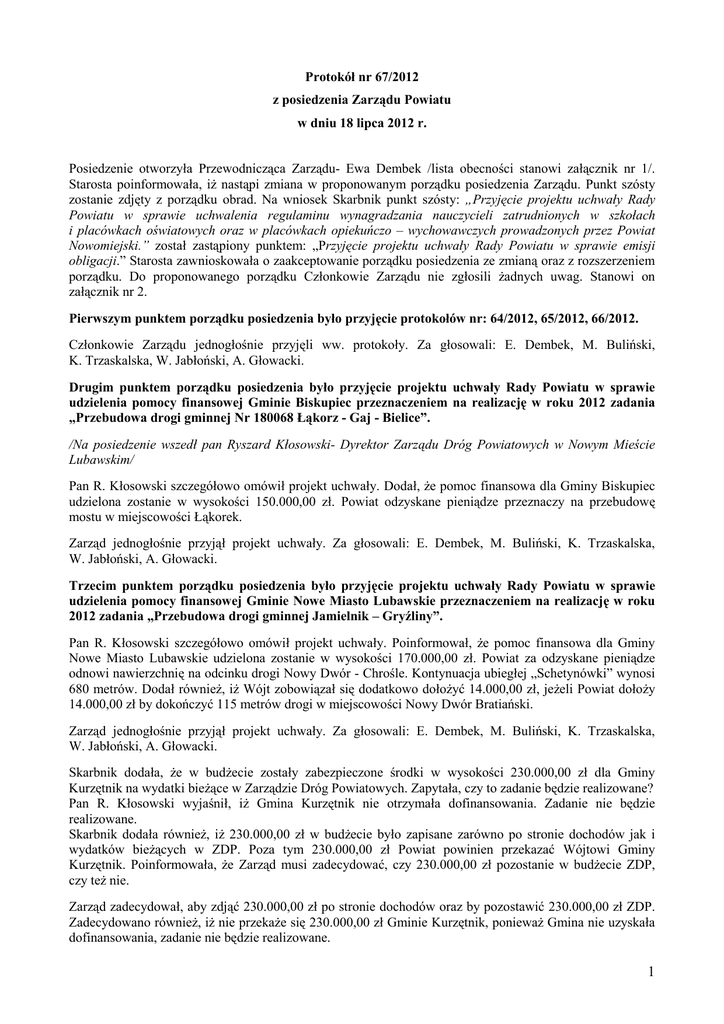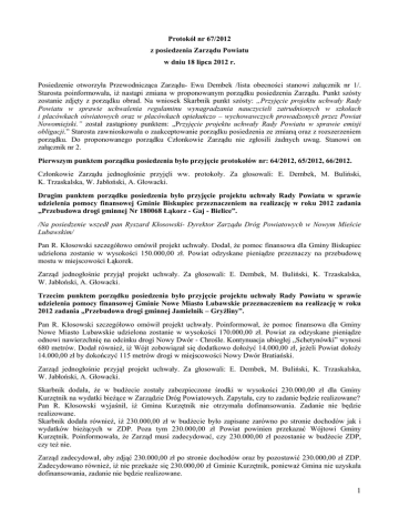 Protokół nr 67/2012 z posiedzenia Zarządu Powiatu w dniu 18 lipca 2012 r. Posiedzenie otworzyła Przewodnicząca Zarządu- Ewa Dembek /lista obecności stanowi załącznik nr 1/. Starosta poinformowała, iż nastąpi zmiana w proponowanym porządku posiedzenia Zarządu. Punkt szósty zostanie zdjęty z porządku obrad. Na wniosek Skarbnik punkt szósty: „Przyjęcie projektu uchwały Rady Powiatu w sprawie uchwalenia regulaminu wynagradzania nauczycieli zatrudnionych w szkołach i placówkach oświatowych oraz w placówkach opiekuńczo – wychowawczych prowadzonych przez Powiat Nowomiejski.” został zastąpiony punktem: „Przyjęcie projektu uchwały Rady Powiatu w sprawie emisji obligacji.” Starosta zawnioskowała o zaakceptowanie porządku posiedzenia ze zmianą oraz z rozszerzeniem porządku. Do proponowanego porządku Członkowie Zarządu nie zgłosili żadnych uwag. Stanowi on załącznik nr 2. Pierwszym punktem porządku posiedzenia było przyjęcie protokołów nr: 64/2012, 65/2012, 66/2012. Członkowie Zarządu jednogłośnie przyjęli ww. protokoły. Za głosowali: E. Dembek, M. Buliński, K. Trzaskalska, W. Jabłoński, A. Głowacki. Drugim punktem porządku posiedzenia było przyjęcie projektu uchwały Rady Powiatu w sprawie udzielenia pomocy finansowej Gminie Biskupiec przeznaczeniem na realizację w roku 2012 zadania „Przebudowa drogi gminnej Nr 180068 Łąkorz - Gaj - Bielice”. /Na posiedzenie wszedł pan Ryszard Kłosowski- Dyrektor Zarządu Dróg Powiatowych w Nowym Mieście Lubawskim/ Pan R. Kłosowski szczegółowo omówił projekt uchwały. Dodał, że pomoc finansowa dla Gminy Biskupiec udzielona zostanie w wysokości 150.000,00 zł. Powiat odzyskane pieniądze przeznaczy na przebudowę mostu w miejscowości Łąkorek. Zarząd jednogłośnie przyjął projekt uchwały. Za głosowali: E. Dembek, M. Buliński, K. Trzaskalska, W. Jabłoński, A. Głowacki. Trzecim punktem porządku posiedzenia było przyjęcie projektu uchwały Rady Powiatu w sprawie udzielenia pomocy finansowej Gminie Nowe Miasto Lubawskie przeznaczeniem na realizację w roku 2012 zadania „Przebudowa drogi gminnej Jamielnik – Gryźliny”. Pan R. Kłosowski szczegółowo omówił projekt uchwały. Poinformował, że pomoc finansowa dla Gminy Nowe Miasto Lubawskie udzielona zostanie w wysokości 170.000,00 zł. Powiat za odzyskane pieniądze odnowi nawierzchnię na odcinku drogi Nowy Dwór - Chrośle. Kontynuacja ubiegłej „Schetynówki” wynosi 680 metrów. Dodał również, iż Wójt zobowiązał się dodatkowo dołożyć 14.000,00 zł, jeżeli Powiat dołoży 14.000,00 zł by dokończyć 115 metrów drogi w miejscowości Nowy Dwór Bratiański. Zarząd jednogłośnie przyjął projekt uchwały. Za głosowali: E. Dembek, M. Buliński, K. Trzaskalska, W. Jabłoński, A. Głowacki. Skarbnik dodała, że w budżecie zostały zabezpieczone środki w wysokości 230.000,00 zł dla Gminy Kurzętnik na wydatki bieżące w Zarządzie Dróg Powiatowych. Zapytała, czy to zadanie będzie realizowane? Pan R. Kłosowski wyjaśnił, iż Gmina Kurzętnik nie otrzymała dofinansowania. Zadanie nie będzie realizowane. Skarbnik dodała również, iż 230.000,00 zł w budżecie było zapisane zarówno po stronie dochodów jak i wydatków bieżących w ZDP. Poza tym 230.000,00 zł Powiat powinien przekazać Wójtowi Gminy Kurzętnik. Poinformowała, że Zarząd musi zadecydować, czy 230.000,00 zł pozostanie w budżecie ZDP, czy też nie. Zarząd zadecydował, aby zdjąć 230.000,00 zł po stronie dochodów oraz by pozostawić 230.000,00 zł ZDP. Zadecydowano również, iż nie przekaże się 230.000,00 zł Gminie Kurzętnik, ponieważ Gmina nie uzyskała dofinansowania, zadanie nie będzie realizowane. 1 Czwartym punktem porządku posiedzenia było podjęcie uchwały Zarządu Powiatu w sprawie zatwierdzenia specyfikacji istotnych warunków zamówienia na roboty budowlane dla zadnia „Przebudowa drogi powiatowej Nr 1299N gr. woj. (Brodnica) – Krotoszyny – Szwarcenowo – dr. pow. Nr 1333N (Radomno) na odcinku stanowiącym dojazd do przebudowywanego mostu w m. Łąkorek”. Pan R. Kłosowski szczegółowo omówił specyfikację istotnych warunków zamówienia, która stanowi załącznik nr 3. Dodał, iż termin rozliczenia się z Ministerstwem Infrastruktury mija 15 października 2012 r. Zarząd jednogłośnie podjął uchwałę Zarządu Powiatu. Za głosowali: E. Dembek, M. Buliński, K. Trzaskalska, W. Jabłoński, A. Głowacki. Piątym punktem porządku posiedzenia było podjęcie uchwały Zarządu Powiatu w sprawie powołania komisji do przeprowadzenia przetargu nieograniczonego na roboty budowlane dla zadania „Przebudowa drogi powiatowej Nr 1299N gr. woj. (Brodnica) – Krotoszyny – Szwarcenowo – dr. pow. Nr 1333N (Radomno) na odcinku stanowiącym dojazd do przebudowywanego mostu w m. Łąkorek”. Członkowie Zarządu wybrali następujący skład komisji do przeprowadzenia przetargu nieograniczonego na roboty budowlane dla zadania „Przebudowa drogi powiatowej Nr 1299N gr. woj. (Brodnica) – Krotoszyny – Szwarcenowo – dr. pow. Nr 1333N (Radomno) na odcinku stanowiącym dojazd do przebudowywanego mostu w m. Łąkorek”: 1. Przewodniczący – Umiński Wojciech, 2. Zastępca przewodniczącego – Banaszewska Alina, 3. Sekretarz – Robaczewska Joanna, 4. Członek komisji – Kiński Sebastian. Zarząd jednogłośnie podjął uchwałę Zarządu Powiatu. Za głosowali: E. Dembek, M. Buliński, K. Trzaskalska, W. Jabłoński, A. Głowacki. Pierwszym punktem rozszerzenia porządku było zapoznanie się z Postanowieniem dotyczącym przebudowy drogi powiatowej Nr 1248N gr. woj. (Ciche) – Nielbark – gr. woj. (Brzozie) przez wieś Nielbark do drogi krajowej Nr 15. Pan R. Kłosowski wyjaśnił, iż Regionalny Dyrektor Ochrony Środowiska w Olsztynie wydał postanowienie, że dla przedsięwzięcia polegającego na przebudowie drogi powiatowej Nr 1248N gr. woj. (Ciche) – Nielbark 