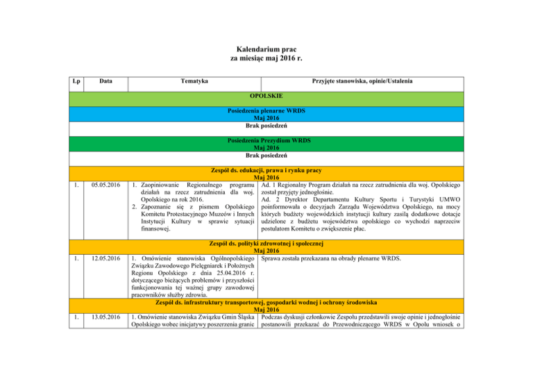 Kalendarium prac za miesiąc maj 2016 r. Lp Data Przyjęte stanowiska, opinie/Ustalenia Tematyka OPOLSKIE Posiedzenia plenarne WRDS Maj 2016 Brak posiedzeń Posiedzenia Prezydium WRDS Maj 2016 Brak posiedzeń 1. 05.05.2016 1. 12.05.2016 1. 13.05.2016 Zespół ds. edukacji, prawa i rynku pracy Maj 2016 1. Zaopiniowanie Regionalnego programu Ad. 1 Regionalny Program działań na rzecz zatrudnienia dla woj. Opolskiego działań na rzecz zatrudnienia dla woj. został przyjęty jednogłośnie. Opolskiego na rok 2016. Ad. 2 Dyrektor Departamentu Kultury Sportu i Turystyki UMWO 2. Zapoznanie się z pismem Opolskiego poinformowała o decyzjach Zarządu Województwa Opolskiego, na mocy Komitetu Protestacyjnego Muzeów i Innych których budżety wojewódzkich instytucji kultury zasilą dodatkowe dotacje Instytucji Kultury w sprawie sytuacji udzielone z budżetu województwa opolskiego co wychodzi naprzeciw finansowej. postulatom Komitetu o zwiększenie płac. Zespół ds. polityki zdrowotnej i społecznej Maj 2016 1. Omówienie stanowiska Ogólnopolskiego Sprawa została przekazana na obrady plenarne WRDS. Związku Zawodowego Pielęgniarek i Położnych Regionu Opolskiego z dnia 25.04.2016 r. dotyczącego bieżących problemów i przyszłości funkcjonowania tej ważnej grupy zawodowej pracowników służby zdrowia. Zespół ds. infrastruktury transportowej, gospodarki wodnej i ochrony środowiska Maj 2016 1. Omówienie stanowiska Związku Gmin Śląska Podczas dyskusji członkowie Zespołu przedstawili swoje opinie i jednogłośnie Opolskiego wobec inicjatywy poszerzenia granic postanowili przekazać do Przewodniczącego WRDS w Opolu wniosek o administracyjnych miasta Opola kosztem integralności gmin Dąbrowa, Dobrzeń Wielki, Komprachcice, Prószków i Turawa. wprowadzeniu tematu dotyczącego poszerzenia granic administracyjnych miasta Opola i stanowiska ZGŚO pod obrady Wojewódzkiej Rady Dialogu Społecznego w Opolu.