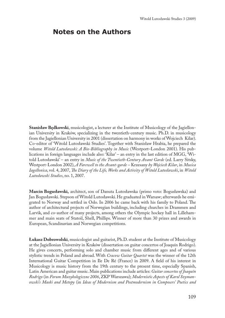 Witold Lutosławski Studies 3 (2009) Notes on the Authors Stanisław Będkowski, musicologist, a lecturer at the Institute of Musicology of the Jagiellonian University in Kraków, specializing in the twentieth-century music. Ph.D. in musicology from the Jagiellonian University in 2001 (dissertation on harmony in works of Wojciech Kilar). Co-editor of ‘Witold Lutosławski Studies’. Together with Stanisław Hrabia, he prepared the volume Witold Lutosławski: A Bio-Bibliography in Music (Westport–London 2001). His publications in foreign languages include also: ‘Kilar’ – an entry in the last edition of MGG, ‘Witold Lutosławski’ – an entry in Music of the Twentieth-Century Avant Garde (ed. Larry Sitsky, Westport-London 2002), A Farewell to the Avant-garde – Krzesany by Wojciech Kilar, in Musica Iagellonica, vol. 4, 2007, The Diary of the Life, Works and Activity of Witold Lutosławski, in Witold Lutosławski Studies, no. 1, 2007. Marcin Bogusławski, architect, son of Danuta Lutosławska (primo voto: Bogusławska) and Jan Bogusławski. Stepson of Witold Lutosławski. He graduated in Warsaw; afterwards he emigrated to Norway and settled in Oslo. In 2006 he came back with his family to Poland. The author of architectural projects of Norwegian buildings, including churches in Drammen and Larvik, and co-author of many projects, among others the Olympic hockey hall in Lillehammer and main seats of Statoil, Shell, Phillips. Winner of more than 30 prizes and awards in European, Scandinavian and Norwegian competitions. Łukasz Dobrowolski, musicologist and guitarist, Ph.D. student at the Institute of Musicology at the Jagiellonian University in Kraków (dissertation on guitar concertos of Joaquín Rodrigo). He gives concerts, performing solo and chamber music from different ages and of various stylistic trends in Poland and abroad. With Cracow Guitar Quartet was the winner of the 12th International Guitar Competition in Ile De Ré (France) in 2009. A field of his interest in Musicology is music history from the 19th century to the present time, especially Spanish, Latin American and guitar music. Main publications include articles: Guitar concertos of Joaquín Rodrigo (in Forum Muzykologiczne 2006, ZKP Warszawa); Modernistic Aspects of Karol Szyman‑ owski’s Maski and Metopy (in Ideas of Modernism and Postmodernism in Composers’ Poetics and 109 Witold Lutosławski Studies 3 (2009) Reflection about Music. Studies edited by A. Jarzębska and J. Paja-Stach, Kraków Musica Iagellonica 2007); International Festivals of Guitar Music in Poland (in The Musicologist and Source Documentary Evidence. A Book of Essays in Honour of Professor Piotr Poźniak on His 70th Birthday, edited by Z. Fabiańska, J. Kubieniec, A. Sitarz, P. Wilk, Kraków: Musica Iagellonica 2009) and several entries for Encyklopedia Muzyczna PWM, ed. E. Dziębowska, Kraków 2009, vol. t–v (among others, Joaquín Turina, Heitor Villa-Lobos). Jadwiga Paja-Stach is Professor at the Institute of Musicology at the Jagiellonian University in Kraków. She is a head of the Department of Methodology and History of Music since the 19th Century. Among her interests are mainly methods of analysis of a musical work and history of 20th-century music. She is the author of many articles, entries (for Die Musik in Geschichte und Gegenwart and Encyklopedia Muzyczna PWM) and 5 books: Dzieła otwarte w twórczości kom‑ pozytorów XX wieku (Open works in the Music of 20th-Century Composers) Kraków: Wydawnictwo Uniwersytetu Jagiellońskiego1992, Witold Lutosławski Kraków: Musica Iagellonica 1996, Lutosławski i jego styl muzyczny (Lutosławski and his musical style) Kraków: Musica Iagellonica 1997, Twórczość Willema Pijpera w kontekście muzyki XX wieku/The work of Willem Pijper in the context of twentieth century music (bilingual book) Kraków: Musica Iagellonica 2002, Muzyka polska od Paderewskiego do Pendereckiego (Polish Music from Paderewski to Penderecki), Kraków: Musica Iagellonica 2009. She has also edited three books: Andrzej Panufnik’s music and its re‑ ception Kraków: Musica Iagellonica 2003, Witold Lutosławski i jego wkład do kultury muzycznej XX wieku (Witold Lutosławski and his contribution to 20th century music culture) Kraków: Musica Iagellonica 2005 and – with Alicja Jarzębska – Idee modernizmu i postmodernizmu w poetyce kompozytorskiej i w refleksji o muzyce (Ideas of Modernism and Postmodernism in the Poetics of Com‑ posers and in Reflections on Music), Kraków: Musica Iagellonica 2007. She also founded a journal “Witold Lutosławski Studies”. Anna G. Piotrowska, musicologist, Ph.D., assistant professor at Jagiellonian University (Institute of Musicology) mainly interested in sociological and cultural aspects of musical life and the place of music in human life. In 2007 with 20 other scholars she co-authored A Manifesto for the Humanities in Europe. In varietate Concordia. Author of the book Idea muzyki narodowej w twórczości kompozytorów amerykańskich pierwszej połowy XX wieku (The Idea of National Music in the Works of American Composers of the Early 20th century, Toruń: Adam Marszałek 2003) and more than thirty articles (in Polish, English, German, Slovak and Georgian) on musical culture. Currently she is involved in the project on stereotypization via music with special emphasis on so called “Gypsy music”.