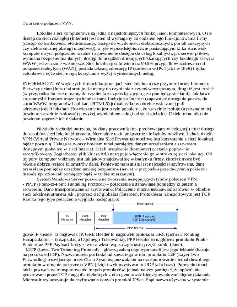Tworzenie połączeń VPN. Lokalne sieci komputerowe są jedną z najistotniejszych funkcji sieci komputerowych. O ile dostęp do sieci rozległej (Internet) jest niemal wymagany do codziennego funkcjonowania firmy (dostęp do bankowości elektronicznej, dostęp do wiadomości elektronicznych, portali aukcyjnych czy elektronicznej obsługi urzędowej), o tyle w przedsiębiorstwie posiadającym kilka stanowisk komputerowych połączenie lokalne i zapewnienie dostępu do usług lokalnych, jak serwer plików, wymiana bezpośrednia danych, dostęp do urządzeń drukujących/skanujących czy lokalnego serwera WWW jest znacznie ważniejsze. Sieć lokalna jest bowiem na 99,9% przypadków izolowana od połączeń rozległych (WAN), posiada własną adresację IP (zarówno w IPv4 jak i w IPv6) i tylko członkowie tejże sieci mogą korzystać z wyżej wymienionych usług. INFORMACJA: W większych firmach/korporacjach sieć lokalna może przybrać formę Intranetu. Pierwszy człon (Intra) informuje, że mamy do czynienia z czymś wewnętrznym, drugi iż jest to sieć (w przypadku Internetu mamy do czynienia z czymś łączącym, jest pomiędzy sieciami). Jak łatwo się domyślić Intranet może spełniać te same funkcje co Internet (zapewniać dostęp do poczty, do stron WWW, programów i aplikacji HTML5) jednak tylko w obrębie wskazanej puli adresowej/sieci lokalnej. Rozwiązanie to jest o tyle popularne, że szczelnie izoluje (a przynajmniej powinno szczelnie izolować) powyżej wymienione usługi od sieci globalne. Dzięki temu nikt nie powinien zagrozić ich działaniu. Niekiedy zachodzi potrzeba, by dany pracownik (np. przebywający w delegacji) miał dostęp do zasobów sieci lokalnej/intranetu. Normalnie takie połączenie nie byłoby możliwe. Jednak dzięki VPN (Virtual Private Network – Wirtualna Sieć Prywatna) możliwe jest korzystanie z sieci lokalnej będąc poza nią. Usługa ta tworzy bowiem tunel pomiędzy danym urządzeniem a serwerem dostępnym globalnie w sieci Internet. Jeżeli urządzenie (komputer) zostanie poprawnie zweryfikowany (login/hasło, plik klucza itd.) następuje włączenie go w strukturę sieci lokalnej. Od tej pory komputer widziany jest tak jakby znajdował się w budynku firmy, chociaż może być równie dobrze tysiące kilometrów dalej. Ponieważ transmisja jest najczęściej szyfrowana, dane przesyłane pomiędzy urządzeniami się bezpieczne (nawet w przypadku przechwycenia pakietów metodą np. człowiek pomiędzy bądź w trybie mieszanym). System Windows Server pozwala na tworzenie następujących typów połączeń VPN: - PPTP (Point-to-Point Tunneling Protocol) – połączenie ustanawiane pomiędzy klientem a serwerem. Dane transportowane są szyfrowane. Połączenia można ustanawiać zarówno w obrębie sieci lokalnej/intranetu jak i poprzez sieć globalną (Internet). Protokołem transportowym jest TCP. Ramka tego typu połączenia wygląda następująco: gdzie IP Header to nagłówek IP, GRE Header to nagłówek protokołu GRE (Generic Routing Encapsulation – Enkapsulacja Ogólnego Trasowania), PPP Header to nagłówek protokołu PunktPunkt oraz PPP Payload, który zawiera właściwą, zaszyfrowaną część ramki (dane). - L2TP (Level Two Tunneling Protocol) – główną zaletą tego typu tuneli jest jego lekkość (bazuje na protokole UDP). Nazwa tunelu pochodzi od zawartego w nim protokołu L2F (Layer Two Forwarding) rozwijanego przez Cisco Systems; pozwala on na transportowanie niemal dowolnego protokołu w obrębie połączenia VPN (dzięki wykorzystywaniu UDP jako bazy). Poprzedni tunel także pozwala na transportowanie innych protokołów, jednak należy pamiętać, że opóźnienia generowane przez TCP mogą dla niektórych z nich generować błędy/powodować błędne działanie. Microsoft wykorzystuje do szyfrowania danych protokół IPSec. Stąd nazwa używana w systemie Windows – L2TP/IPSec. Trzeba pamiętać, że zarówno klient jak i serwer muszą obsługiwać protokół IPSec. Na chwilę obecną jest to jedno z lepszych i bardziej bezpiecznych połączeń oferowanych przez Microsoft dla protokołu IPv4. Ramka L2TP: Ramka L2TP/IPSec Encapsulation: - SSTP (Secure Socket Tunneling Protocol) – ta wersja tunelowania wykorzystuje protokół HTTPS, czyli TCP na porcie 443. Bezpieczeństwo danych zapewnia protokół SSL. Polecany jest szczególnie przy połączeniach do lokalizacji, gdzie inne połączenia są niewykonalne – operator blokuje wszystkie usługi poza WWW (gdzie wykorzystywany jest właśnie port 80 i 443). Ramka SSTP: Proszę zauważyć, że jest to pierwszy rodzaj tunelowania VPN w pełni przystosowany do nowego protokołu IPv6. INFORMACJA: Firma Microsoft dla połączeń w IPv6 wprowadza zupełnie nowy rodzaj połączeń – DirectAccess (Połączenie bezpośrednie). W przypadku posiadania odpowiednich adresów prywatnych IPv6 (w stosie prywatnym) komputery będą tworzyć w swoim obrębie sieć LAN, która nie wymaga dodatkowych połączeń czy konfiguracji (IPv6 domyślnie szyfruje pakiety IPSec). W chwili obecnej usługa ta jest w fazie testowej, aczkolwiek jej stabilność pozwala na wdrażanie jej. Warunkiem jest posiadanie połączenia IPv6 (natywnego) z odpowiednią konfiguracją adresową. Źródło: http://technet.microsoft.com/en-us/library/cc771298(v=ws.10).aspx http://technet.microsoft.com/en-us/network/dd420463.aspx Konfiguracja i użytkowanie VPN w Windows Server 2012 1. Wybieramy przystawkę Routing i dostęp zdalny (Menedżer Serwera – zakładka Narzędzia>Routing i dostęp zdlany; konsola MMC i wybranie przystawki itp.). 2. Prawdopodobnie narzędzie będzie proponowało nam włączenie usługi DirectAccess. Należy je zignorować (bo nie mamy ustawionej sieci IPv6). 3. Następnie klikamy na nazwie naszego serwera prawym przyciskiem myszy i wybieramy Konfiguruj i włącz routing i dostęp zdalny 4. W oknie wyboru konfiguracji roli serwera wybieramy opcję Dostęp zdalny (połączenie telefo