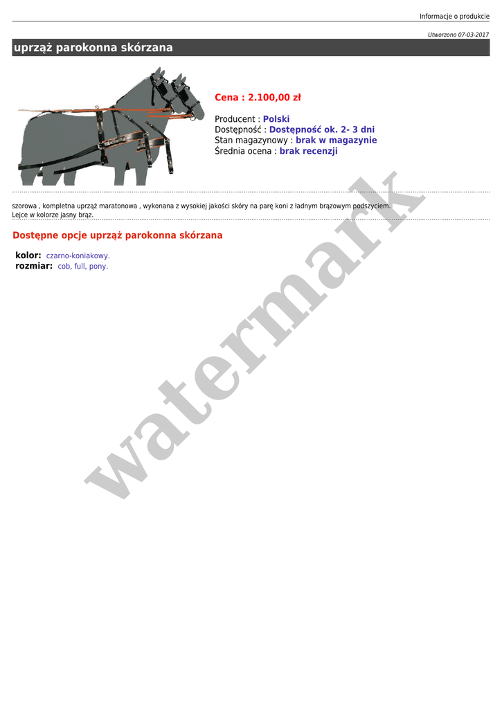 Informacje o produkcie Utworzono 07-03-2017 uprząż parokonna skórzana Cena : 2.100,00 zł er m ar k Producent : Polski Dostępność : Dostępność ok. 2- 3 dni Stan magazynowy : brak w magazynie Średnia ocena : brak recenzji szorowa , kompletna uprząż maratonowa , wykonana z wysokiej jakości skóry na parę koni z ładnym brązowym podszyciem. Lejce w kolorze jasny brąz. Dostępne opcje uprząż parokonna skórzana w at kolor: czarno-koniakowy. rozmiar: cob, full, pony.