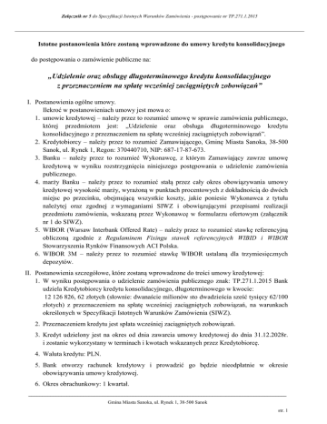Załącznik nr 5 do Specyfikacji Istotnych Warunków Zamówienia - postępowanie nr TP.271.1.2015 Istotne postanowienia które zostaną wprowadzone do umowy kredytu konsolidacyjnego do postępowania o zamówienie publiczne na: „Udzielenie oraz obsługę długoterminowego kredytu konsolidacyjnego z przeznaczeniem na spłatę wcześniej zaciągniętych zobowiązań” I. Postanowienia ogólne umowy. Ilekroć w postanowieniach umowy jest mowa o: 1. umowie kredytowej – należy przez to rozumieć umowę w sprawie zamówienia publicznego, której przedmiotem jest: „Udzielenie oraz obsługa długoterminowego kredytu konsolidacyjnego z przeznaczeniem na spłatę wcześniej zaciągniętych zobowiązań”. 2. Kredytobiorcy – należy przez to rozumieć Zamawiającego, Gminę Miasta Sanoka, 38-500 Sanok, ul. Rynek 1, Regon: 370440710, NIP: 687-17-87-673. 3. Banku – należy przez to rozumieć Wykonawcę, z którym Zamawiający zawrze umowę kredytową w wyniku rozstrzygnięcia niniejszego postępowania o udzielenie zamówienia publicznego. 4. marży Banku – należy przez to rozumieć stałą przez cały okres obowiązywania umowy kredytowej wysokość marży, wyrażoną w punktach procentowych z dokładnością do dwóch miejsc po przecinku, obejmującą wszystkie koszty, jakie poniesie Wykonawca z tytułu należytej oraz zgodnej z wymaganiami SIWZ i obowiązującymi przepisami realizacji przedmiotu zamówienia, wskazaną przez Wykonawcę w formularzu ofertowym (załącznik nr 1 do SIWZ). 5. WIBOR (Warsaw Interbank Offered Rate) – należy przez to rozumieć stawkę referencyjną obliczoną zgodnie z Regulaminem Fixingu stawek referencyjnych WIBID i WIBOR Stowarzyszenia Rynków Finansowych ACI Polska. 6. WIBOR 3M – należy przez to rozumieć stawkę WIBOR ustalaną dla trzymiesięcznych depozytów. II. Postanowienia szczegółowe, które zostaną wprowadzone do treści umowy kredytowej: 1. W wyniku postępowania o udzielenie zamówienia publicznego znak: TP.271.1.2015 Bank udziela Kredytobiorcy kredytu konsolidacyjnego, długoterminowego w kwocie: 12 126 826, 62 złotych (słownie: dwanaście milionów sto dwadzieścia sześć tysięcy 62/100 złotych) z przeznaczeniem na spłatę wcześniej zaciągniętych zobowiązań, na warunkach określonych w Specyfikacji Istotnych Warunków Zamówienia (SIWZ). 2. Przeznaczeniem kredytu jest spłata wcześniej zaciągniętych zobowiązań. 3. Kredyt udzielony jest na okres od dnia zawarcia umowy kredytowej do dnia 31.12.2028r. i zostanie wykorzystany w terminach i kwotach wskazanych przez Kredytobiorcę. 4. Waluta kredytu: PLN. 5. Bank otworzy rachunek kredytowy i prowadzić go będzie nieodpłatnie w okresie obowiązywania umowy kredytowej. 6. Okres obrachunkowy: 1 kwartał. ______________________________________________________________________________________________ Gmina Miasta Sanoka, ul. Rynek 1, 38-500 Sanok str. 1 Załącznik nr 5 do Specyfikacji Istotnych Warunków Zamówienia - postępowanie nr TP.271.1.2015 7. Kredyt zostanie uruchomiony, po podpisaniu umowy w terminie ….. dni roboczych (zgodnie z ofertą Wykonawcy). 8. Wypłata kredytu/transz kredytu następować będzie na podstawie pisemnej dyspozycji Kredytobiorcy w drodze przelewu środków w ciężar konta kredytowego na rachunki wskazane do spłaty wcześniej zaciągniętych zobowiązań w terminie siedmiu dni od złożenia dyspozycji: (wymienić nazwy Banków w których zostały zaciągnięte zobowiązania) (wymienić nazwy Banków w których zostały zaciągnięte zobowiązania) 9. Karencja w spłacie kapitału będzie obowiązywała do dnia 30.03.2017 r. Spłata kapitału nastąpi w 48 kwartalnych ratach, płatnych ostatniego dnia każdego kwartału począwszy od dnia 31.03.2017 r. Ostateczny termin spłaty kredytu nastąpi w dniu 31.12.2028r. z zastrzeżeniem uprawnień Kredytobiorcy opisanych w pkt 21 oraz 28. 10. Oprocentowanie kredytu jest zmienne. Oprocentowanie kredytu w całym okresie kredytowania ustalone jest w skali rocznej według zmiennej stopy procentowej. Stopa procentowa ustalona jest przez Bank w oparciu o stawkę referencyjną WIBOR 3M powiększoną o marżę Banku zgodnie z ofertą Wykonawcy. 11. Marża Banku wynosi: …… (zgodnie z ofertą Wykonawcy) pkt proc. 12. Marża Banku nie ulegnie podwyższeniu w okresie obowiązywania umowy kredytowej. 13. Oprocentowanie kredytu w dniu podpisania umowy wynosi: ………….. % 14. Stawkę referencyjną stanowi stawka WIBOR 3M. 15. Stawka WIBOR 3M ustalana jest według jej notowań na 2 dni robocze poprzedzające rozpoczęcie okresu obrachunkowego za jaki należne od kredytu odsetki są naliczane i spłacane. W przypadku braku notowań stawki WIBOR 3M dla drugiego dnia roboczego poprzedzającego rozpoczęcie danego okresu obrachunkowego, do wyliczenia stopy procentowej stosuje się notowania z dnia poprzedzającego, w którym było prowadzone notowanie stawki WIBOR 3M. 16. W każdym okresie obrachunkowym wchodzącym w skład umownego okresu kredytowania stopa procentowa jest stała. 17. Odsetki od udzielonego kredytu naliczane są w oparciu o stawkę WIBOR 3M powiększoną o marżę Banku. Odsetki naliczane są kwartalnie od wykorzystanych środków. Do obliczenia kwoty odsetek przyjmuje się rzeczywistą liczbę dni wykorzystania kredytu w stosunku do 365 dni w roku. 18. Jeżeli data spłaty odsetek i/lub raty kapitałowo-odsetkowej przypada na dzień ustawowo wolny od pracy uważa się, że ustalony termin został zachowany, jeżeli spłata nastąpiła w pierwszym dniu roboczym po terminie określonym w umowie kredytowej. 19. Kwartalna płatność odsetek odbywać się będzie na podstawie powiadomienia Banku (noty bankowej), zawierającego kwotę naliczonych odsetek. 20. Niespłacone w terminie raty odsetkowe nie podlegają oprocentowaniu ani kapitalizacji. 21. Bankowi nie przysługuje prawo do naliczania Kredytobiorcy jakichkolwiek prowizji ani _______________________________________________________________