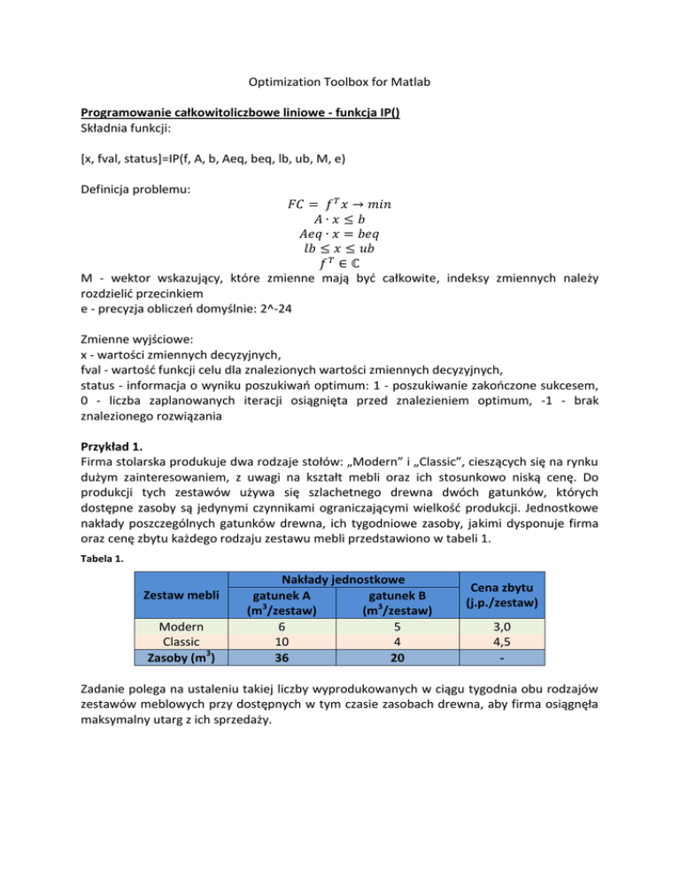 Optimization Toolbox for Matlab Programowanie całkowitoliczbowe liniowe - funkcja IP() Składnia funkcji: [x, fval, status]=IP(f, A, b, Aeq, beq, lb, ub, M, e) Definicja problemu: M - wektor wskazujący, które zmienne mają być całkowite, indeksy zmiennych należy rozdzielić przecinkiem e - precyzja obliczeń domyślnie: 2^-24 Zmienne wyjściowe: x - wartości zmiennych decyzyjnych, fval - wartość funkcji celu dla znalezionych wartości zmiennych decyzyjnych, status - informacja o wyniku poszukiwań optimum: 1 - poszukiwanie zakończone sukcesem, 0 - liczba zaplanowanych iteracji osiągnięta przed znalezieniem optimum, -1 - brak znalezionego rozwiązania Przykład 1. Firma stolarska produkuje dwa rodzaje stołów: „Modern” i „Classic”, cieszących się na rynku dużym zainteresowaniem, z uwagi na kształt mebli oraz ich stosunkowo niską cenę. Do produkcji tych zestawów używa się szlachetnego drewna dwóch gatunków, których dostępne zasoby są jedynymi czynnikami ograniczającymi wielkość produkcji. Jednostkowe nakłady poszczególnych gatunków drewna, ich tygodniowe zasoby, jakimi dysponuje firma oraz cenę zbytu każdego rodzaju zestawu mebli przedstawiono w tabeli 1. Tabela 1. Zestaw mebli Modern Classic Zasoby (m3) Nakłady jednostkowe gatunek A gatunek B 3 (m /zestaw) (m3/zestaw) 6 5 10 4 36 20 Cena zbytu (j.p./zestaw) 3,0 4,5 - Zadanie polega na ustaleniu takiej liczby wyprodukowanych w ciągu tygodnia obu rodzajów zestawów meblowych przy dostępnych w tym czasie zasobach drewna, aby firma osiągnęła maksymalny utarg z ich sprzedaży. Przykład 2. W fabryce wytwarza się dwa produkty I i II. Wytworzenie jednostki produktu I wymaga zużycia 8 jednostek surowca A i 2 jednostek surowca B, wyprodukowanie zaś jednostki produktu II wymaga 5 jednostek surowca A i 5 jednostek surowca B. Dostawy surowców w każdy dniu wynoszą: 40 jednostek surowca A i 25 jednostek surowca B. Zakładając, że zysk ze sprzedaży jednostki produktu I wynosi 9 zł, ze sprzedaży zaś produktu II – 8 zł, należy określić wielkość dziennej produkcji maksymalizującej potencjalny zysk łączny. Wielkość produkcji musi być wyrażona w liczbach całkowitych. Programowanie binarne Składnia funkcji: [x, fval]=bintprog(f, A, b, Aeq, beq) Definicja problemu: Zmienne wyjściowe: x - wartości zmiennych decyzyjnych, fval - wartość funkcji celu dla znalezionych wartości zmiennych decyzyjnych, Przykład 3. W hali fabrycznej znajduje się kilka gniazd produkcyjnych. Każde gniazdo wytwarza innego rodzaju wyroby w różnej ilości. Wyroby gotowe odbierane są przez transporter. Porusza się on po z góry wyznaczonych trasach przemieszczając się od wejścia w kierunku magazynu wyrobów gotowych. Zakładamy, że transporter jest przeznaczony do przewozu wszystkich rodzajów wyrobów. Na rysunku 1. przedstawiono schemat hali produkcyjnej oraz możliwe drogi, po których może poruszać się transporter. Podano również średni czas (w minutach), w jakim transporter pokonuje dany odcinek swojej trasy. Zadanie polega na wyznaczeniu ścieżki, po której transporter ma się poruszać, aby pokonać trasę od wejścia do magazynu w jak najkrótszym czasie. WEJŚCIE 2 2 1 2 3 3 8 3 4 6 5 14 17 6 6 12 21 5 7 7 8 13 9 10 11 15 12 MAGAZYN Rysunek 1. 16 6 10