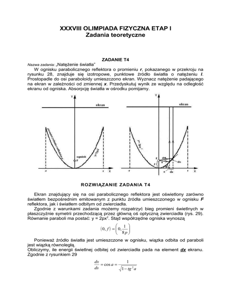 XXXVIII OLIMPIADA FIZYCZNA ETAP I Zadania teoretyczne ZADANIE T4 światła” W ognisku parabolicznego reflektora o promieniu r, pokazanego w przekroju na rysunku 28, znajduje się izotropowe, punktowe źródło światła o natężeniu I. Prostopadle do osi paraboloidy umieszczono ekran. Wyznacz natężenie padającego na ekran w zależności od zmiennej x. Przedyskutuj wynik ze względu na odległość ekranu od ogniska. Absorpcję światła w ośrodku pomijamy. Nazwa zadania: „Natężenie ROZWIĄZANIE ZADANIA T4 Ekran znajdujący się na osi parabolicznego reflektora jest oświetlony zarówno światłem bezpośrednim emitowanym z punktu źródła umieszczonego w ognisku F reflektora, jak i światłem odbitym od zwierciadła. Zgodnie z warunkami zadania możemy rozpatrzyć bieg promieni świetlnych w płaszczyźnie symetrii przechodzącą przez główną oś optyczną zwierciadła (rys. 29). Równanie paraboli ma postać: y = 2px2. Stąd współrzędne ogniska wynoszą 1 8p ( 0, f ) = 0, Ponieważ źródło światła jest umieszczone w ognisku, wiązka odbita od paraboli jest wiązką równoległą. Obliczymy, ile energii świetlnej odbitej od zwierciadła pada na element dx ekranu. Zgodnie z rysunkiem 29 dx 1 = cos a = ds 1 − tg 2 a Ponieważ tga = y ′ = 4 px to dx 1 = cos a = ds 1 − 16 px 2 (1) Stąd ds = 1 + 16 px 2 dx Powierzchnia obrotowa utworzona przez ds wynosi dS = 2πxds = 2πx 1 − 16 px 2 dx (2) Energia świetlna dI padająca na powierzchnię ds jest równa dI dS = cos a I 4πa 2 (3) I Ixdx dS cos a = 2 4πa 2a 2 (4) Podstawiając (1), (2) mamy dI = 1 gdzie: a – odległość punktu paraboli (x,2px2) od ogniska 0, 8p 1 a = x + 2 px 2 − 8 p 2 2 (5) 2 Odbita od powierzchni zwierciadła wiązka światła o energii Di oświetla w odległości x od jego osi pierścień o szerokości dx. Pole tego pierścienia wynosi dP = 2πxdx (6) Szukane oświetlenie ekranu przez wiązkę odbitą wynosi I ( x) = dI dP (7) co po skorzystaniu z wzorów (4), (5), (6), daje szukaną zależność natężenia światła odbitego od zwierciadła w funkcji odległości od osi reflektora I ( x) = I 4π 1 1 x + 2 px 2 − 8 p 2 2 (8) Wiązka odbita na ekranie krążek o średnicy 2r (rys. 29). Oświetlenie to jest nierównomierne. Dla x równego zeru (x = 0) funkcja I(x) ma ekstremum. Jest to maksimum. Ponieważ wiązka odbita jest równoległa, więc oświetlenie ekranu przez tę wiązkę nie zależy od odległości ekranu od zwierciadła. Oświetlenie ekranu światłem bezpośrednim jest niejednorodne i również daje na ekranie krążek, którego średnica jest wyznaczona przez cień geometrycznego reflektora (rys. 30). Poza tym oświetlenie ekranu jest odwrotnie proporcjonalne do b2, tzn. odległości punktu ekranu od źródła światła i proporcjonalnie do cos β . Dla dużych odległości od zwierciadła ekran jest oświetlony, praktycznie biorąc, tylko przez światło odbite. Dla małych odległości ekranu od ogniska, całkowite oświetlenie ekranu może być istotnie różne od oświetlenia tylko światłem odbitym. (brak punktacji) Źródło: Zadanie pochodzi z czasopisma „Fizyka w Szkole” Komitet Główny Olimpiady Fizycznej w Szczecinie www.of.szc.pl