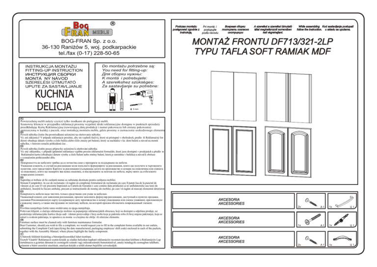 Podczas monta¿u Pri montáži postêpowaæ zgodnie z postupujte instrukcj¹. podla návodu BOG-FRAN Sp. z o.o. 36-130 Rani¿ów 5, woj. podkarpackie tel./fax (0-17) 228-50-65 INSTRUKCJA MONTA¯U FITTING-UP INSTRUCTION ÈÍÑÒÐÓÊÖÈß ÑÁÎÐÊÈ MONTÁŽNY NÁVOD SZERELÉSI ÚTMUTATÓ UPUTE ZA SASTAVLJANJE KUCHNIA DELICJA Âîâðåìÿ ñáîðêè ïîñòöïàòü ñîãëàñíî èíñòðöêöèè A szerelést a szerelési útmutató által meghatározott sorrendben kell végrehajtani. While assembling Kod sastavljanja postupati follow the instruction. u skladu sa uputama. MONTA¯ FRONTU DF713/321-2LP TYPU TAFLA SOFT RAMIAK MDF Do monta¿u potrzebne s¹: You need for fitting-up: Äëÿ ñáîðêè íóæíû: K montáži potrebujete: A szereléshez szükséges: Za sastavljanje su potrebne: 5 mm PL Powierzchniê mebli nale¿y czyœciæ tylko œrodkami do pielêgnacji mebli. Szanowny kliencie w przypadku reklamacji prosimy wype³niæ druki reklamacyjne dostêpne w punktach sprzeda¿y przedk³adaj¹c Kartê Reklamacyjn¹ (zawieraj¹c¹ datê produkcji i numer pakowacza lub zmiany pakowania) umieszczon¹ w ka¿dej z paczek, oraz instrukcjê monta¿u mebla, gdzie prosimy o zaznaczenie uszkodzonego elementu. SK Povrch nábytku èistite iba prostriedkami urèenými na ošetrovanie nábytku. Vážení zákazníci! V prípade reklamácie prosíme, aby ste vyplnili tlaèivá, ktoré sú prístupné v obchodoch, predložili Reklamaèný list (ktorý obsahuje dátum výroby a èíslo balièa alebo èíslo zmeny pri balení), ktorý sa nachádza v každom balení a návod na montáž nábytku, v ktorom oznaète poškodenú èas•. CZ Povrch nábytku èistìte pouze pøípravky urèenými k ošetøování nábytku. Vážený zákazníku, v pøípadì uplatnìní reklamace vyplòte prosím reklamaèní formuláøe, které jsou dostupné v prodejnách a pøedložte Reklamaèní kartu (obsahující datum výroby a èíslo balení nebo zmìny balení, která je umístìna v balíèku) a návod k obsluze s vyznaèením poškozeného dílu. BG Ïîâúðõíîñòòà íà ìåáåëèòå òðÿáâà äà ñå ïî÷èñòâà ñàìî ñ ïðåïàðàòè çà ïîääúðæàíå íà ìåáåëè. Óâàæàåìè êëèåíòè, â ñëó÷àé íà ðåêëàìàöèÿ ìîëÿ ïîïúëíåòå ôîðìóëÿðèòå çà ðåêëàìàöèÿ, êîèòî ùå ïîëó÷èòå â òúðãîâñêèòå ïóíêòîâå, êàòî ïðåäñòàâèòå Êàðòàòà çà ðåêëàìàöèÿ (ñúäúðæàùà äàòàòà íà ïðîèçâîäñòâî è íîìåðà íà îïàêîâ÷èêà èëè ñìÿíàòà çà îïàêîâàíå), êîÿòî ùå íàìåðèòå âúâ âñÿêà îïàêîâêà, è èíñòðóêöèÿòà çà ìîíòàæ íà ìåáåëà, âúðõó êîÿòî äà îòáåëåæèòå ïîâðåäåíèÿ åëåìåíò. RO Suprafaþa ei trebuie sã fie curãþatã numai cu substanþe destinate pentru curãþarea mobilei. Stimate Cumpãrãtor, în caz de reclamaþie vã rugãm sã completaþi formularul de reclamaþie pe care îl puteþi lua de la punctul de vânzare ºi pe care îl veþi prezenta împreunã cu Cartela de Garanþie ( care conþine data producþiei ºi nr ambalatorului sau turei de ambalare), însoþitã la fiecare ambalaj, precum ºi instrucþiunile de montaj ale mobilei, pe care vã rugãm sã marcaþi elementul deteriorat. RUS Ïîâåðõíîñòü ìåáåëè íàäî ÷èñòèòü òîëüêî ñðåäñòâàìè äëÿ óõîäà çà ìåáåëüþ. Óâàæàåìûé êëèåíò, äëÿ çàÿâëåíèÿ ðåêëàìàöèè, ïðîñèì çàïîëíèòü ôîðìóëÿð ðåêëàìàöèè, äîñòóïíûé â ïóíêòàõ ïðîäàæè, óêàçûâàÿ Ðåêëàìàöèîííóþ êàðòó (ñîäåðæàùóþ äàòó ïðîèçâîäñòâà è íîìåð óïàêîâùèêà èëè ñìåíû óïàêîâêè), ïðèëîæåííóþ ê êàæäîìó ïàêåòó, à òàêæå èíñòðóêöèþ ïî ìîíòàæó ìåáåëè, íà êîòîðîé ïðîñèì îáîçíà÷èòü ïîâðåæäåííûé ýëåìåíò. HR Površinu namještaja èistite samo sredstvama za njegu namještaja. Poštovani klijenti, u sluèaju reklamacije molimo za popunjenje reklamacijskih obrazaca, koji su dostupni u odjelima prodaje, uz predoèenje reklamacijske kartice (koja sadrži datum proizvodnje i broj osobe koja je pakirala robu ili broj smjene pakiranja), koja se nalazi u svakom pakiranju, te upustava za montažu u kojima ste obilježili ošteæene elemente. GB Furniture surface must be cleaned only with furniture maintenance formulas. Dear Customer, should you wish to file a complaint, we would request you to fill in the complaint forms available in our outlets, submitting the Complaint Card (specifying the date manufactured, packaging employee/ shift code) enclosed in each of the packets, together with the Assembly Manual, where please highlight the faulty component. AKCESORIA AKCESSORIES 2x A1 1x U1 1x A1 1x U1 2x A1 1x U1 AKCESORIA AKCESSORIES H A bútorok felületét kizárólag a bútorápolószerekkel lehet tisztítani. Tisztelt Vásárló! Reklamació esetén kérjük az eladási helyeken kapható reklamációs nyomtatványokat kitölteni a Reklamációs Lap (tartalmazza a gyártási dátumat és csomagoló számát vagy mûszakszámát) bemutatásával, amely mindegyik csomagban található, valamint a bútor szerelési utasítását, amelyen kérjük a sérült elemet bejelölni sziveskedjék. AKCESORIA AKCESSORIES Z3 Z3 Z4 Z4 W2 Z3 Z3 Z3 W2 5 mm A1 A1 Z3 U1 Z4 Z4 Z4 - DDNW90/82LP Symbol elementu Wymiary Element symbol Measurements 1 Sz.J -luty 2005 “DELICJA” Kod Code 713x321 Producent zastrzega sobie prawo do dokonania zmian konstrukcyjnych oferowanych mebli, nie zmieniaj¹c ich ogólnego charakteru!