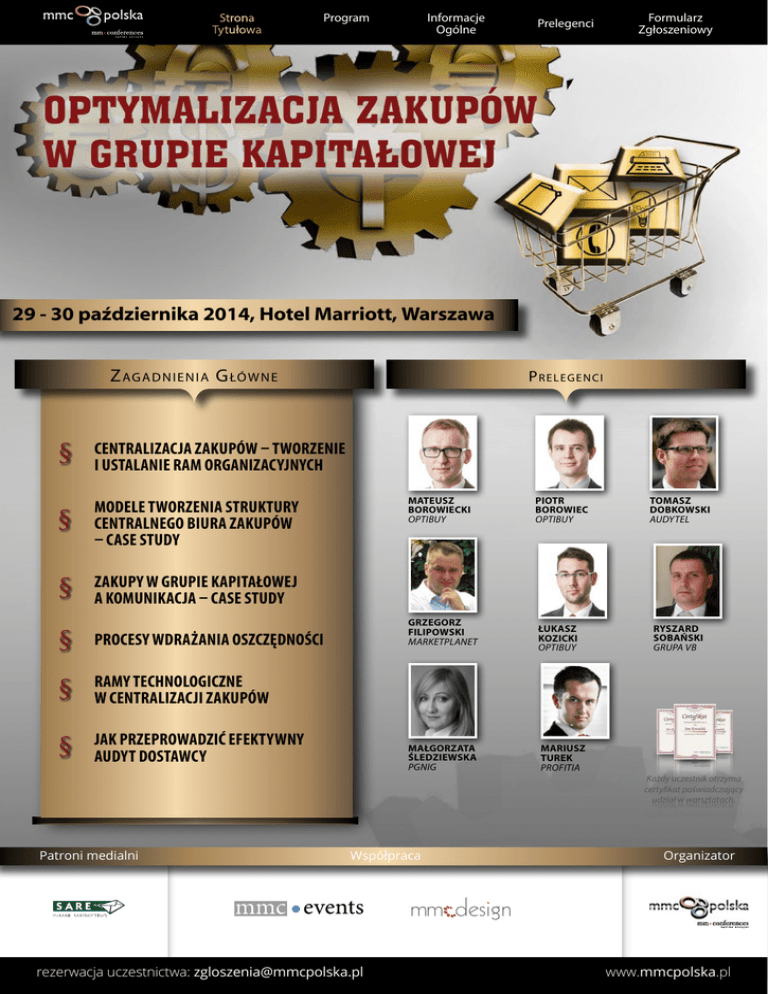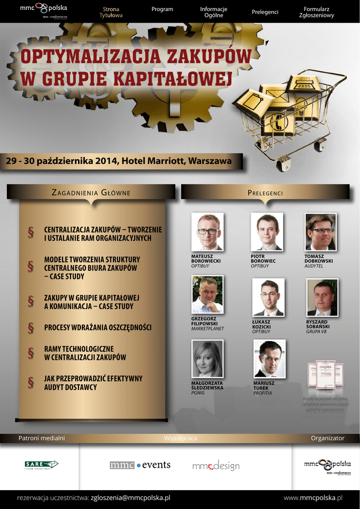 Strona Tytułowa Program Informacje Ogólne Prelegenci Formularz Zgłoszeniowy 29 - 30 października 2014, Hotel Marriott, Warszawa Z ag a d n i e n i a G łó w n e Prelegenci CENTRALIZACJA ZAKUPÓW – TWORZENIE I USTALANIE RAM ORGANIZACYJNYCH MATEUSZ BOROWIECKI OPTIBUY MODELE TWORZENIA STRUKTURY CENTRALNEGO BIURA ZAKUPÓW – CASE STUDY PIOTR BOROWIEC OPTIBUY TOMASZ DOBKOWSKI AUDYTEL ZAKUPY W GRUPIE KAPITAŁOWEJ A KOMUNIKACJA – CASE STUDY GRZEGORZ FILIPOWSKI MARKETPLANET PROCESY WDRAŻANIA OSZCZĘDNOŚCI ŁUKASZ KOZICKI OPTIBUY RYSZARD SOBAŃSKI GRUPA VB RAMY TECHNOLOGICZNE W CENTRALIZACJI ZAKUPÓW JAK PRZEPROWADZIĆ EFEKTYWNY AUDYT DOSTAWCY MAŁGORZATA ŚLEDZIEWSKA PGNIG MARIUSZ TUREK PROFITIA Każdy uczestnik otrzyma certyfikat poświadczający udział w warsztatach. certyfikat poświadczający Każdy uczestnik otrzyma Patroni medialni Współpraca rezerwacja uczestnictwa: [email protected] Organizator www.mmcpolska.pl Strona Tytułowa Program Informacje Ogólne Formularz Zgłoszeniowy Prelegenci 29 - 30 października 2014, Hotel Marriott, Warszawa PROGRAM Dzień I Dzień II 9:30 REJESTRACJA I PORANNA KAWA 8:15 REJESTRACJA I PORANNA KAWA 10:00 CENTRALIZACJA ZAKUPÓW – TWORZENIE I USTALANIE RAM ORGANIZACYJNYCH 8:40 RAMY TECHNOLOGICZNE W CENTRALIZACJI ZAKUPÓW • Jak utworzyć ramy organizacyjne – dobre praktyki • Jak przezwyciężyć bariery prawne w rozwoju centralizacji • Jak zwalczać różnice w poziomach organizacji struktur zakupowych w spółkach zależnych • Strategie wdrażania zmian w centralizacji zakupów • Instrumenty wewnętrzne GRZEGORZ FILIPOWSKI, Marketplanet 11:40 PRZERWA KAWOWA 12:00 MODELE TWORZENIA STRUKTURY CENTRALNEGO BIURA ZAKUPÓW – CASE STUDY RYSZARD SOBAŃSKI, Grupa VB 13:00 ZAKUPY W GRUPIE KAPITAŁOWEJ A KOMUNIKACJA – CASE STUDY • Efektywne zarządzanie komunikacją na przestrzeni departament zakupów a grupa kapitałowa MATEUSZ BOROWIECKI, OptiBuy 14:10 LUNCH 15:10 PROCESY WDRAŻANIA OSZCZĘDNOŚCI • Tworzenie drzewa kategorii zakupowych w obszarze dostaw i usług • Wykorzystanie możliwości efektu skali w procesie wspólnych zakupów • Analiza potrzeb • Określenie priorytetów MARIUSZ TUREK, PROFITIA 16:30 – ZAKOŃCZENIE I DNIA WARSZTATU rezerwacja uczestnictwa: [email protected] • Tworzenie i ustalanie ram technologicznych • Jak przezwyciężać bariery IT w rozwoju centralizacji • Określenie roli systemu IT w ocenie ofert zakupowych, obiegu dokumentacji pomiędzy spółkami etc. PIOTR BOROWIEC, OptiBuy ŁUKASZ KOZICKI, OptiBuy 10:00 PRZERWA KAWOWA 10:20 NAJCZĘSTSZE PROBLEMY PRZY INTEGRACJI WSPÓLNYCH BAZ ZAKUPOWYCH • Specyfika różnorodności branż • Kategoryzacja usług • Tworzenie wspólnej bazy dostawców TOMASZ DOBKOWSKI, AUDYTEL 11:20 SPRAWNE ZARZĄDZANIE PROCESAMI KONTROLNYMI W GRUPIE ZAKUPOWEJ • Analiza stanu bieżącego • Ryzyko wewnętrzne a kwestie nadzoru 12:45 LUNCH 13:30 ZAKUPY W GRUPACH KAPITAŁOWYCH STOSUJĄCYCH USTAWĘ PRAWO ZAMÓWIEŃ PUBLICZNYCH MAŁGORZATA ŚLEDZIEWSKA, PGNiG 14:30 JAK PRZEPROWADZIĆ EFEKTYWNY AUDYT DOSTAWCY • Określanie etapów i zakresu negocjacji • Ujednolicanie umów 15:30 ZAKOŃCZENIE WARSZTATÓW I WRĘCZENIE CERTYFIKATÓW www.mmcpolska.pl Strona Tytułowa Program Informacje Ogólne Formularz Zgłoszeniowy Prelegenci 29 - 30 października 2014, Hotel Marriott, Warszawa INFORMACJE Dlaczego warto wziąć udział w warsztacie? Warsztaty kierujemy do: Udział w warsztatach jest sposobnością by pogłębić i zaktualizować swoją wiedzę i umiejętności w strategicznych obszarach warunkujących efektywne funkcjonowanie grupy kapitałowej oraz skonfrontować własne praktyki z doświadczeniem innych praktyków i uznanych ekspertów. Podczas spotkania zostaną przedstawione strategiczne aspekty m.in. tworzenia optymalnych ram grupy zakupowej, zwalczania barier rozwoju organizacji, procesy wdrażania oszczędności czy zarządzania wspólnymi bazami zakupowymi w obszarze centralizacji. Spotkanie umożliwi wymianę spostrzeżeń z osobami piastującymi podobne stanowiska i mającymi zbliżony zakres obowiązków w grupie kapitałowej. Ponadto wydarzenie pozwoli spojrzeć Państwu na stosowane przez siebie praktyki z innej perspektywy. Warsztaty dedykowane są reprezentantom grup kapitałowych w szczególności: Dyrektorom działów: »» zakupów, »» zarządzania, »» logistyki Kierownikom i Specjalistom z działów: »» zakupów »» finansów, »» rozwoju, Przedstawicielom Rad Nadzorczych, Członkom Zarządu i Prezesom Spółek Organizator rezerwacja uczestnictwa: [email protected] miejsce warsztatu Miejsce warsztatu HOTEL MARRIOTT Al. Jerozolimskie 65/79 00-697 Warszawa Kontakt do producenta więcej informacji MM Conferences S.A. (MMC Polska) jest liderem w kategorii konferencji dedykowanych dla branży telekomunikacyjnej, mediów, finansów i energetycznej. Realizujemy projekty, które stały się platformą spotkań i wymiany myśli oraz doświadczeń pomiędzy wszystkimi uczestnikami rynku. Rokrocznie przygotowujemy sto kilkadziesiąt projektów szkoleniowo-konferencyjnych przy współpracyz największymi firmami i instytucjami, a wiele z nich posiada własną markę i ugruntowaną pozycję na rynku: Sympozjum Świata Telekomunikacji i Mediów, Banking & Insurance Forum, Konferencja EuroPOWER. Gwarantem jakości organizowanych wydarzeń jest zarówno współpraca z czołowymi graczami rynku jak również zespół doświadczonych managerów, producentów oraz handlowców. Współpracujemy m.in. z: Orange, T- mobile, Play, Polkomtel, PKN ORLEN S.A, PGNiG, Tauron Polska Energia, Hawe SA, Emitel, KPMG, PwC, E&Y, Deloitte, UKE, URE, KNF, PKO BP, PEKAO SA, PZU, NBP, Asseco Poland, Intel, Comarch. W skład grupy MMC Polska wchodzi: MM Conferences S.A., MMC Szkolenia, MMC Events, MMC Design. Paulina Kaczmarek Młodszy Kierownik Projektu T: 22 379 29 31 e-mail: [email protected] www.mmcpolska.pl Strona Tytułowa Program Informacje Ogólne Prelegenci Formularz