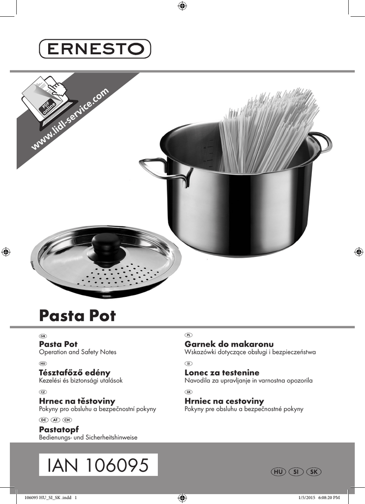 Pasta Pot Pasta Pot Garnek do makaronu Tésztafőző edény Lonec za testenine Hrnec na těstoviny Hrniec na cestoviny Operation and Safety Notes Kezelési és biztonsági utalások Pokyny pro obsluhu a bezpečnostní pokyny Wskazówki dotyczące obsługi i bezpieczeństwa Navodila za upravljanje in varnostna opozorila Pokyny pre obsluhu a bezpečnostné pokyny Pastatopf Bedienungs- und Sicherheitshinweise IAN 106095 106095 HU_SI_SK .indd 1 1/5/2015 6:08:20 PM GB PL HU SI CZ SK DE / AT / CH 106095 HU_SI_SK .indd 2 Operation and Safety Notes Wskazówki dotyczące obsługi i bezpieczeństwa Kezelési és biztonsági utalások Navodila za upravljanje in varnostna opozorila Pokyny pro obsluhu a bezpečnostní pokyny Pokyny pre obsluhu a bezpečnostné pokyny Bedienungs- und Sicherheitshinweise Page Strona Oldal Stran Strana Strana Seite 3 4 6 8 10 12 14 1/5/2015 6:08:20 PM Pasta Pot P Note for induction hobs JJ Please note the effective bottom diameter of 180 mm. J J Note: a noise may occur under certain The product is for private use only. conditions, resulting from the electromagnetic properties of the heat source and the pot / General Safety Instructions pan. J J This is totally normal and does not imply that DANGER OF INJURY! your induction hob or your cookware is DANGER OF damaged. DEATH AND ACCIDENTS FOR JJ Place the pot/ pan in the middle of the TODDLERS AND CHILDREN! induction hotplate. Never leave children unsupervised with the J J CAUTION! High heating-up rate! Do not packaging material. The packaging material overheat cookware when preheating. represents a danger of suffocation. Children freJJ The room must be aired out well, in the event quently underestimate the dangers. Always cookware overheat. keep children away from the packaging material. Please note that the handles may become hot during cooking. For your Use safety, use a potholder or barbecue gloves. Before first use, rinse the pot in hot water. DANGER OF DAMAGE TO The item is suitable for keeping dishes warm PROPERTY! inside the oven (max. 150 °C for 1 hour). Pots must never be left unattended. Fat and Use the strainer lid to easily drain water without food can very quickly overheat and ignite. Nevspilling food in the basin. Fit the lid so the er try to extinguish a fat or food fire with water. retaining clamps match the side notches in the Cover the flames with a pot lid or a tested fire pot. Then turn the cover a quarter turn to the blanket. right or left. The pot is now ready to drain. CAUTION! Never heat up the pot if it is empty. ATTENTION! The lid will become hot! Use The pot will overheat and get damaged. potholders to prevent scalding. Never heat the pot up on the highest energy level if it is filled with fat. If it overheats switch Cleaning and Care the hotplate off immediately. Never lift the pot directly off the hotplate, but first allow it to stand Clean the pot with hot water and commercially on the cooling plate. available washing-up liquid. Do not place meat which is still dripping with The product is suitable for the liquid into hot fat. The fat splattering out on to a dishwasher. hot hob could easily cause a fire. The pot is suitable for use on gas, electric, ceramic, halogen and induction hobs. Disposal FOOD-SAFE! This product has no adverse effect on taste or smell. The packaging is made entirely of recyclable materials, which you may Save energy! To avoid heat loss, choose dispose of at local recycling facilities. a hotplate with a diameter that matches the Contact your local refuse disposal authority for more diameter of the pot. details of how to dispose of your worn-out product. Do not slide the pot on the glass ceramic hobs to avoid scratches. Proper Use GB 106095 HU_SI_SK .indd 3 3 1/5/2015 6:08:21 PM Garnek do makaronu P Zastosowanie produktu zgodne z przeznaczeniem Produkt jest przeznaczony wyłącznie do użytku w gospodarstwie domowym. P Wskazówki dot. bezpieczeństwa NIEBEZPIECZEŃSTWO OBRAŻEŃ CIAŁA! J ZAGROŻENIE ŻYCIA ORAZ NIEBEZPIECZEŃSTWO WYPADKU W PRZYPADKU W MAŁYCH DZIECI! Nigdy nie należy pozostawiać bez nadzoru dzieci z materiałem opakowaniowym. Zachodzi niebezpieczeństwo uduszenia się materiałem opakowaniowym. Dzieci często nie doceniają zagrożenia. Trzymać dzieci z dala od materiału opakowaniowego. J Należy pamiętać o tym, że uchwyty podczas gotowania mogą stać się gorące. Z tego też względu dla własnej ochrony trzeba używać ścierek do garnków albo rękawic do grillowania. NIEBEZPIECZEŃSTWO USZKODZENIA RZECZY! J Podczas gotowania ważne jest, aby garnków nie spuszczać z oka. Tłuszcz i potrawy mogą się bardzo szybko przegrzewać i zapalić. W przypadku zapalenia się potrawy lub tłuszczu, nigdy nie należy gasić ich wodą! Płomień należy przytłumić pokrywką lub certyfikowanym kocem gaśniczym. J OSTROŻNIE! Nigdy nie należy podgrzewać pustego garnka, w przeciwnym razie można spowodować jego przegrzanie. Skutkiem tego może być uszkodzenie produktu. J Garnka wypełnionego tłuszczem nigdy nie podgrzewać na najwyższym stopniu temperatury. W przypadku przegrzania płytę grzejną natychmiast wyłączyć. Nigdy nie podnosić garnka bezpośrednio z płyty grzejnej, lecz pozostawić go najpierw na stygnącym palniku. 4 J Nie wkładać mokrego mięsa do gorącego tłusz- czu, ponieważ powoduje to rozpryskiwanie kropel tłuszczu i niesie ze sobą ryzyko jego zapalenia się od rozgrzanego palnika. J Garnek jest przeznaczony do stosowania na kuchenkach gazowych, elektrycznych oraz płytach ceramicznych, halogenowych i indukcyjnych. BEZ WPŁYWU NA ŻYWNOŚĆ! Produkt nie wpływa ujemnie na właściwości smakowe i zapachowe. J Oszczędzaj energię! Aby uniknąć strat ciepła, garnek należy ustawiać na palniku odpowiadającym wielkością średnicy dna garnka. JNie należy przeciągać albo przesuwać garnków po palnikach ceramiczno / szklanych. Przy nieprzestrzeganiu tego może dojść do uszkodzeń przez zadrapania. P Uwagi dotyczą