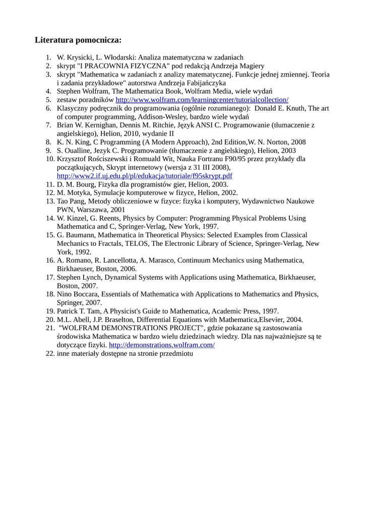 Literatura pomocnicza: 1. W. Krysicki, L. Włodarski: Analiza matematyczna w zadaniach 2. skrypt "I PRACOWNIA FIZYCZNA" pod redakcją Andrzeja Magiery 3. skrypt "Mathematica w zadaniach z analizy matematycznej. Funkcje jednej zmiennej. Teoria i zadania przykładowe" autorstwa Andrzeja Fabijańczyka 4. Stephen Wolfram, The Mathematica Book, Wolfram Media, wiele wydań 5. zestaw poradników http://www.wolfram.com/learningcenter/tutorialcollection/ 6. Klasyczny podręcznik do programowania (ogólnie rozumianego): Donald E. Knuth, The art of computer programming, Addison-Wesley, bardzo wiele wydań 7. Brian W. Kernighan, Dennis M. Ritchie, Język ANSI C. Programowanie (tłumaczenie z angielskiego), Helion, 2010, wydanie II 8. K. N. King, C Programming (A Modern Approach), 2nd Edition,W. N. Norton, 2008 9. S. Oualline, Jezyk C. Programowanie (tłumaczenie z angielskiego), Helion, 2003 10. Krzysztof Rościszewski i Romuald Wit, Nauka Fortranu F90/95 przez przykłady dla początkujących, Skrypt internetowy (wersja z 31 III 2008), http://www2.if.uj.edu.pl/pl/edukacja/tutoriale/f95skrypt.pdf 11. D. M. Bourg, Fizyka dla programistów gier, Helion, 2003. 12. M. Motyka, Symulacje komputerowe w fizyce, Helion, 2002. 13. Tao Pang, Metody obliczeniowe w fizyce: fizyka i komputery, Wydawnictwo Naukowe PWN, Warszawa, 2001 14. W. Kinzel, G. Reents, Physics by Computer: Programming Physical Problems Using Mathematica and C, Springer-Verlag, New York, 1997. 15. G. Baumann, Mathematica in Theoretical Physics: Selected Examples from Classical Mechanics to Fractals, TELOS, The Electronic Library of Science, Springer-Verlag, New York, 1992. 16. A. Romano, R. Lancellotta, A. Marasco, Continuum Mechanics using Mathematica, Birkhaeuser, Boston, 2006. 17. Stephen Lynch, Dynamical Systems with Applications using Mathematica, Birkhaeuser, Boston, 2007. 18. Nino Boccara, Essentials of Mathematica with Applications to Mathematics and Physics, Springer, 2007. 19. Patrick T. Tam, A Physicist's Guide to Mathematica, Academic Press, 1997. 20. M.L. Abell, J.P. Braselton, Differential Equations with Mathematica,Elsevier, 2004. 21. "WOLFRAM DEMONSTRATIONS PROJECT", gdzie pokazane są zastosowania środowiska Mathematica w bardzo wielu dziedzinach wiedzy. Dla nas najważniejsze są te dotyczące fizyki. http://demonstrations.wolfram.com/ 22. inne materiały dostępne na stronie przedmiotu