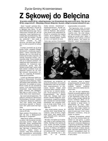 Życie Gminy Krzemieniewo Z Sękowej do Belęcina W grudniu minęło 60 lat, odkąd Agnieszka i Jan Drzymałowie idą razem przez życie. Pan Jan ma 90 lat, a jego żona 81. Mieszkają w Nowym Belęcinie. Są sami, odkąd na zawsze odszedł ich syn. Zycie "rzucało" państwa Drzy małów po całej Polsce. Poznali się w Sękowej koło Gorlic. To jest około 500 kilometrów stąd. Tam w miejscowym kościele pan Jan był organistą. A pani Agnieszka pra cowała jako przedszkolanka. Nie trudno było się spotkać. Poznali się, pokochali i ślub wzięli w "swoim" kościele. To były skromne, ale dobre lata. W Sęko wej na świat przyszedł ich jedyny syn. służby zdrowia, niewidomych i niepełnosprawnych. Poznali go, pokochali, szanowali. Z Leszna trafił do Pawłowic. Był probosz czem parafii przez kilkanaście lat. Parafia to oczywiście dla księdza rodzina, ale ta najbliższa, a więc rodzice, mieszkali daleko. Tęsknił do nich, a oni tęsknili do syna. Kiedy więc państwo Drzymałowie organizowałby uroczystość. Pani Agnieszka mówi, że przez całe lata spotykała dobrych ludzi. Tutaj, w Belęcinie, byli przecież zupełnie obcy. Nie znali nikogo, nie mieli krewnych, przyjaciół. A jednak nie są dziś sami. Jeden z sąsiadów robi im zakupy, przynosi opał do piwnicy. Inny zawozi do kościoła. Lekarz systematycznie A potem przenieśli się na drugi koniec Polski, niedaleko Elbląga. Zamieszkali w służbowej organis tówce i razem rozpoczęli pracę. Okazało się, że w tej parafii po trzebny był nie tylko organista, ale również nauczyciel muzyki i nau czycielka religii. Praca czekała na nich aż w czterech szkołach. Do najbliższej mieli 5 kilometrów, a do najdalszej 10. Codziennie więc przemierzali gminę. Pani Ag nieszka uczyła religii i wolne miała tylko soboty i niedziele. A pan Jan właściwie wolnych dni nie miał. Był przecież nauczycielem mu zyki, no i organistą. W niedziele i święta grał w kościele. I znowu po kilkunastu latach po jechali w Rzeszowskie. Za pracą organisty trafili do Robczyc. Poko nali kolejne setki kilometrów. Pani Agnieszka nie podjęła już pracy. W tym czasie ich syn poszedł do liceum, a oni mieli jeszcze córkę. Adoptowali małą dziewczynkę, kiedy mieszkali pod Elblągiem. Było więc co robić w domu. Przy szłość dzieci była najważniejsza. Syn Józef wybrał kapłaństwo. Po maturze poszedł do Seminarium Duchownego w Tarnowie, a potem w Poznaniu. Święcenia odebrał w 1977 roku. Swoją mszę świętą prymicyjną odprawił w Robczycach, tam, gdzie ojciec był orga nistą. Pan Jan przepracował jako orga nista aż 52 lata. Skąd państwo Drzymałowie zna leźli się więc w Wielkopolsce? Dlaczego tu przyjechali? Najprościej byłoby powiedzieć: za synem. Ale to przecież nie tylko zwyczajna podróż. Ksiądz Józef Drzymała swoją duszpasterską posługę wykonywał w diecezji, w której otrzymał święcenia kapłań skie. Był więc w parafiach poz nańskich, między innymi w Lesznie. Tutaj wierni poznali go jako duszpasterza leszczyńskiej "Solidarności", pracowników zdecydowali się przyjechać do gminy Krzemieniewo, to ta podróż podyktowana była nie tyle wzglę dami organizacyjnymi, co zwy czajnie sercem. Ksiądz Józef chciał być blisko rodziców, zamie rzał się nimi na starość opieko wać, chciał zapewnić im spokój, bezpieczeństwo. Tak właśnie miało być. Dlatego kupił stary domek w Nowym Belęcinie, wyre montował go, urządził trzy pokoje. Sam przecież też miał tam kiedyś zamieszkać. No i przywiózł rodzi ców na drugi koniec Polski. A oni czuli się szczęśliwi. To było w 1996 roku. Bóg chciał jednak inaczej. W pierwszy dzień świąt Bożego Na rodzenia, osiem lat temu, ksiądz Józef zmarł. Ktoś napisał wów czas "Odszedł cicho i spokojnie. Idzie do nieba". Nie było i nie będzie już trudniej szej chwili w życiu państwa Drzy małów. Każdego dnia tęsknią do syna. Trudno, się dziwić, że kiedy o nim mówią, łzy same napływają do oczu. A mówią o nim pięknie. Nawet teraz, gdy rozmawialiśmy o ich jubileuszu 60 - lecia małżeń stwa, tak naprawdę byli z Józ kiem. To on przecież ich odwiedza, panie w aptece przygotowują leki na każdy dzień. Znajomy weterynarz z Leszna zostawia zawsze słodycze, owoce. Jak trudno byłoby bez do brych ludzi... Pan Jan nie jest najzdrowszy. Ostatnio przeszedł zapalenie płuc i stara się nie wychodzić na dwór. A pani Agnieszka krząta się po domu, gotuje, sprząta, zajmuje się kurami, królikami. Mówi, że za wsze ma co robić. Zapytana, czy nie pojedzie w swoje strony, w Rzeszowskie do córki, odpo wiada, że nie. Tutaj jest jej dom. Pierwszy, który mają z mężem na własność. Skromny, ale podaro wany im przez syna. Z nim, na pawłówickim cmentarzu, chcą już zostać na zawsze. Państwo Drzymałowie zdziwili się, że w dniu rocznicy ślubu od wiedził ich wójt gminy, a potem nasza redakcja. Nie spodziewali się życzeń. A przecież składamy je z ogromną życzliwością. Żeby jak najdłużej byli razem i żeby dopisy wało im zdrowie. A także, aby po trafili kierować wspomnienia do dobrych i szczęśliwych chwil. Ta kich przecież dzieci darowały im w życiu sporo.