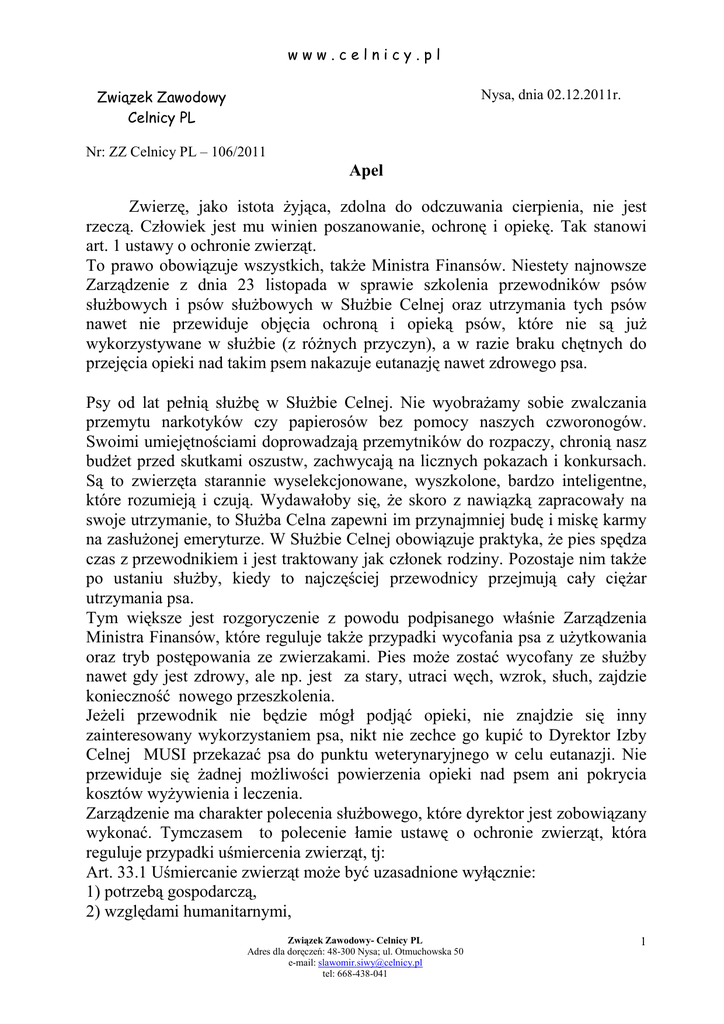 www.celnicy.pl Nysa, dnia 02.12.2011r. Związek Zawodowy Celnicy PL Nr: ZZ Celnicy PL – 106/2011 Apel Zwierzę, jako istota żyjąca, zdolna do odczuwania cierpienia, nie jest rzeczą. Człowiek jest mu winien poszanowanie, ochronę i opiekę. Tak stanowi art. 1 ustawy o ochronie zwierząt. To prawo obowiązuje wszystkich, także Ministra Finansów. Niestety najnowsze Zarządzenie z dnia 23 listopada w sprawie szkolenia przewodników psów służbowych i psów służbowych w Służbie Celnej oraz utrzymania tych psów nawet nie przewiduje objęcia ochroną i opieką psów, które nie są już wykorzystywane w służbie (z różnych przyczyn), a w razie braku chętnych do przejęcia opieki nad takim psem nakazuje eutanazję nawet zdrowego psa. Psy od lat pełnią służbę w Służbie Celnej. Nie wyobrażamy sobie zwalczania przemytu narkotyków czy papierosów bez pomocy naszych czworonogów. Swoimi umiejętnościami doprowadzają przemytników do rozpaczy, chronią nasz budżet przed skutkami oszustw, zachwycają na licznych pokazach i konkursach. Są to zwierzęta starannie wyselekcjonowane, wyszkolone, bardzo inteligentne, które rozumieją i czują. Wydawałoby się, że skoro z nawiązką zapracowały na swoje utrzymanie, to Służba Celna zapewni im przynajmniej budę i miskę karmy na zasłużonej emeryturze. W Służbie Celnej obowiązuje praktyka, że pies spędza czas z przewodnikiem i jest traktowany jak członek rodziny. Pozostaje nim także po ustaniu służby, kiedy to najczęściej przewodnicy przejmują cały ciężar utrzymania psa. Tym większe jest rozgoryczenie z powodu podpisanego właśnie Zarządzenia Ministra Finansów, które reguluje także przypadki wycofania psa z użytkowania oraz tryb postępowania ze zwierzakami. Pies może zostać wycofany ze służby nawet gdy jest zdrowy, ale np. jest za stary, utraci węch, wzrok, słuch, zajdzie konieczność nowego przeszkolenia. Jeżeli przewodnik nie będzie mógł podjąć opieki, nie znajdzie się inny zainteresowany wykorzystaniem psa, nikt nie zechce go kupić to Dyrektor Izby Celnej MUSI przekazać psa do punktu weterynaryjnego w celu eutanazji. Nie przewiduje się żadnej możliwości powierzenia opieki nad psem ani pokrycia kosztów wyżywienia i leczenia. Zarządzenie ma charakter polecenia służbowego, które dyrektor jest zobowiązany wykonać. Tymczasem to polecenie łamie ustawę o ochronie zwierząt, która reguluje przypadki uśmiercenia zwierząt, tj: Art. 33.1 Uśmiercanie zwierząt może być uzasadnione wyłącznie: 1) potrzebą gospodarczą, 2) względami humanitarnymi, Związek Zawodowy- Celnicy PL Adres dla doręczeń: 48-300 Nysa; ul. Otmuchowska 50 e-mail: [email protected] tel: 668-438-041 1 www.celnicy.pl 3) koniecznością sanitarną, 4) nadmierną agresywnością, powodującą bezpośrednie zagrożenie dla zdrowia lub życia ludzkiego, 5) potrzebami nauki, z zastrzeżeniem przepisów rozdziału 9. Nie przewiduje się uśmiercenia zdrowego zwierzęcia. Za zabicie psa z naruszeniem tych zasad grozi kara grzywny, kara ograniczenia wolności albo pozbawienie wolności do roku. Decyzja o treści Zarządzenia została podjęta świadomie. W trakcie prac nad treścią nowych regulacji Ministerstwo Finansów było informowane, że propozycje naruszają prawa zwierząt. Podobnie jak w przypadku konsultacji innych aktów prawnych uwagi zostały zignorowane. Przewodniczący ZZ-Celnicy PL /-/ Sławomir Siwy Związek Zawodowy- Celnicy PL Adres dla doręczeń: 48-300 Nysa; ul. Otmuchowska 50 e-mail: [email protected] tel: 668-438-041 2