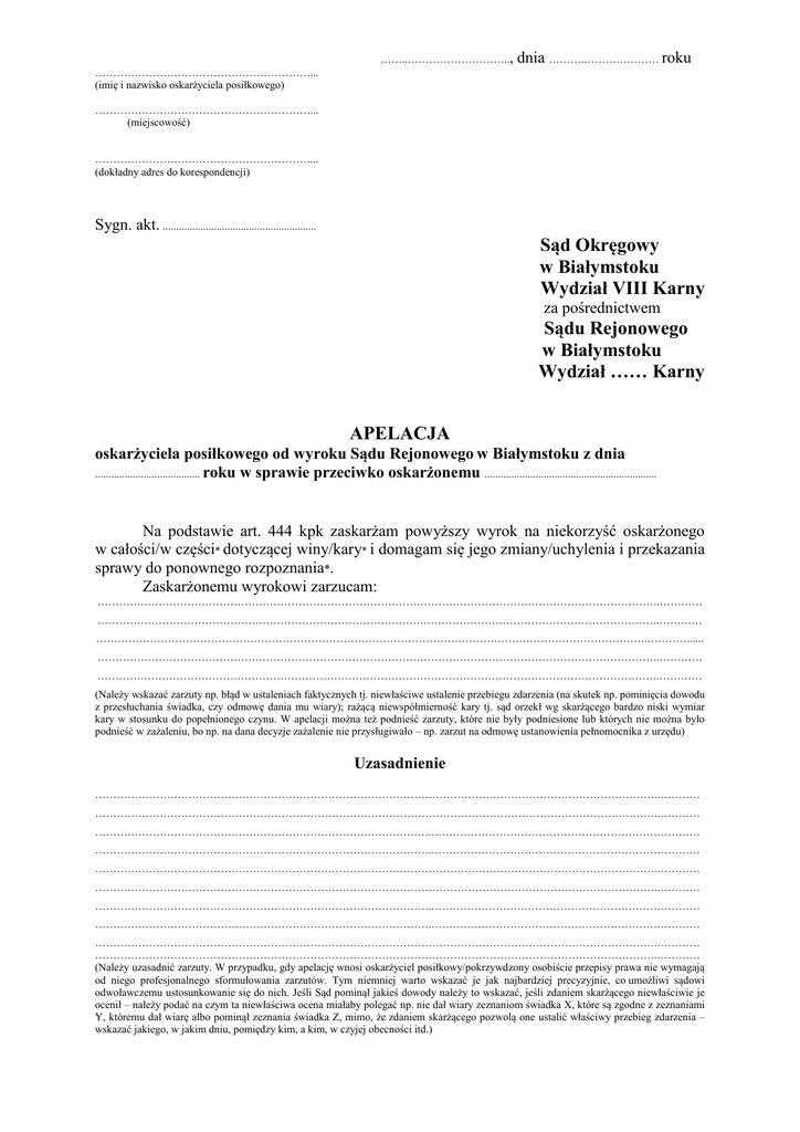 ……..……………………….., dnia ……….………………… roku ……………………………………………………... (imię i nazwisko oskarżyciela posiłkowego) ……………………………………………………... (miejscowość) ……………………………………………………... (dokładny adres do korespondencji) Sygn. akt. ......................................................... Sąd Okręgowy w Białymstoku Wydział VIII Karny za pośrednictwem Sądu Rejonowego w Białymstoku Wydział …… Karny APELACJA oskarżyciela posiłkowego od wyroku Sądu Rejonowego w Białymstoku z dnia ....................................... roku w sprawie przeciwko oskarżonemu ................................................................ Na podstawie art. 444 kpk zaskarżam powyższy wyrok na niekorzyść oskarżonego w całości/w części* dotyczącej winy/kary* i domagam się jego zmiany/uchylenia i przekazania sprawy do ponownego rozpoznania*. Zaskarżonemu wyrokowi zarzucam: ………………………………………………………………………………………………………………………………………….………… ………………………………………………………………………………………………………………………………………….………… ……………………………………………………………………………………………………………………………………….…………..... ………………………………………………………………………………………………………………………………………….………… ………………………………………………………………………………………………………………………………………….………… (Należy wskazać zarzuty np. błąd w ustaleniach faktycznych tj. niewłaściwe ustalenie przebiegu zdarzenia (na skutek np. pominięcia dowodu z przesłuchania świadka, czy odmowę dania mu wiary); rażącą niewspółmierność kary tj. sąd orzekł wg skarżącego bardzo niski wymiar kary w stosunku do popełnionego czynu. W apelacji można też podnieść zarzuty, które nie były podniesione lub których nie można było podnieść w zażaleniu, bo np. na dana decyzje zażalenie nie przysługiwało – np. zarzut na odmowę ustanowienia pełnomocnika z urzędu) Uzasadnienie ………………………………………………………………………………………………………………………………………….………… ………………………………………………………………………………………………………………………………………….………… ………………………………………………………………………………….………………………………………………………………… ………………………………………………………………………………….………………………………………………………………… ………………………………………………………………………………………………………………………………………….………… ………………………………………………………………………………………………………………………………………….………… ………………………………………………………………………………….………………………………………………………………… ………………………………………………………………………………….………………………………………………………………… ………………………………………………………………………………………………………………………………………….………… ………………………………………………………………………………………………………………………………………….………… (Należy uzasadnić zarzuty. W przypadku, gdy apelację wnosi oskarżyciel posiłkowy/pokrzywdzony osobiście przepisy prawa nie wymagają od niego profesjonalnego sformułowania zarzutów. Tym niemniej warto wskazać je jak najbardziej precyzyjnie, co umożliwi sądowi odwoławczemu ustosunkowanie się do nich. Jeśli Sąd pominął jakieś dowody należy to wskazać, jeśli zdaniem skarżącego niewłaściwie je ocenił – należy podać na czym ta niewłaściwa ocena miałaby polegać np. nie dał wiary zeznaniom świadka X, które są zgodne z zeznaniami Y, któremu dał wiarę albo pominął zeznania świadka Z, mimo, że zdaniem skarżącego pozwolą one ustalić właściwy przebieg zdarzenia – wskazać jakiego, w jakim dniu, pomiędzy kim, a kim, w czyjej obecności itd.) Mając powyższe na uwadze, wnoszę o zmianę/uchylenie* zaskarżonego wyroku i przekazanie sprawy do ponownego rozpoznania*. ………………………. (podpis oskarżyciela posiłkowego) Załączniki: - ……………………………………………………………. ; - ………………………………………………………….… ; (należy opisać tu dokumenty, które przedkłada się w załączeniu na potwierdzenie twierdzeń zawartych w uzasadnieniu)