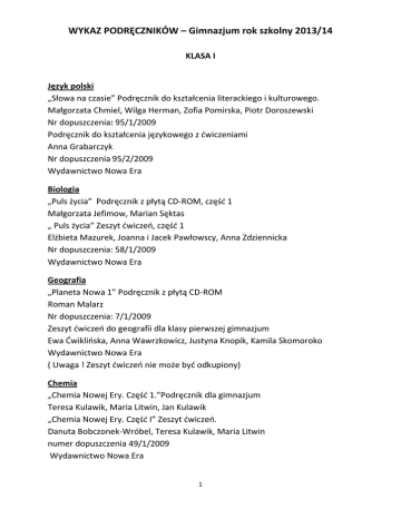WYKAZ PODRĘCZNIKÓW – Gimnazjum rok szkolny 2013/14 KLASA I Język polski „Słowa na czasie” Podręcznik do kształcenia literackiego i kulturowego. Małgorzata Chmiel, Wilga Herman, Zofia Pomirska, Piotr Doroszewski Nr dopuszczenia: 95/1/2009 Podręcznik do kształcenia językowego z ćwiczeniami Anna Grabarczyk Nr dopuszczenia 95/2/2009 Wydawnictwo Nowa Era Biologia „Puls życia” Podręcznik z płytą CD-ROM, część 1 Małgorzata Jefimow, Marian Sęktas „ Puls życia” Zeszyt ćwiczeń, część 1 Elżbieta Mazurek, Joanna i Jacek Pawłowscy, Anna Zdziennicka Nr dopuszczenia: 58/1/2009 Wydawnictwo Nowa Era Geografia „Planeta Nowa 1” Podręcznik z płytą CD-ROM Roman Malarz Nr dopuszczenia: 7/1/2009 Zeszyt ćwiczeń do geografii dla klasy pierwszej gimnazjum Ewa Ćwiklińska, Anna Wawrzkowicz, Justyna Knopik, Kamila Skomoroko Wydawnictwo Nowa Era ( Uwaga ! Zeszyt ćwiczeń nie może być odkupiony) Chemia „Chemia Nowej Ery. Część 1.”Podręcznik dla gimnazjum Teresa Kulawik, Maria Litwin, Jan Kulawik „Chemia Nowej Ery. Część I” Zeszyt ćwiczeń. Danuta Bobczonek-Wróbel, Teresa Kulawik, Maria Litwin numer dopuszczenia 49/1/2009 Wydawnictwo Nowa Era 1 Fizyka Spotkania z fizyką. Cześć 1 Podręcznik , autor: Grażyna Francuz-Ornat Zeszyt ćwiczeń – część 1 Grażyna Francuz-Ornat, Teresa Kulawik, Maria Nawotny – Różańska Nr dopuszczenia: 93/1/2009 Wydawnictwo: Nowa Era Matematyka Matematyka z plusem Podręcznik do klasy I Praca zbiorowa pod dyrekcją M. Dobrowolskiej Nr dopuszczenia: 168/1/2009 Gdańskie Wydawnictwo Oświatowe Język angielski New Exam Connections 1 Podręcznik do klasy I + ćwiczenia lub New Exam Connections 2 Podręcznik + ćwiczenia Tony Garside, Joanna Spencer-Kępczyńska, Diana Pye, Paul Kelly, Caroline Krantz Nr dopuszczenia: 259/1/2011 z 1 Wydawnictwo Oxford University Press Proszę nie kupować! Dopiero we wrześniu po diagnozie zostanie ustalony poziom. Historia Podręcznik do klasy I Śladami przeszłości. pod redakcją Stanisława Roszaka, A. Łaszkiewicz Nr dopuszczenia 60/1/2009 Wydawnictwo Nowa Era Religia „Spotkanie ze słowem„ D. Jackowiak, J. Szpet numer dopuszczenia: AZ-31-01/10-PO-1/11 Wyd. Św. Wojciech 2 Wychowanie do życia w rodzinie „Wędrując ku dorosłości” klasa I-III autor: T.Król Wydawnictwo: Rubikon Nr dopuszczenia 205/2011/z 1 Uwaga: Podręcznik nie jest obowiązkowy Język rosyjski Echo 1 - Podręcznik z ćwiczeniami +CD Autor: Beata Gawęcka-Ajchel Nr dopuszczenia: 97/1/2009 Wydawnictwo: WSiP KLASA II Język polski ” Słowa na czasie” Podręcznik do kształcenia literackiego i kulturalnego M. Chmiel, W. Herman, Z. Pomirska, P. Doroszewski Nr dopuszczenia 95/3/2009 „Słowa na Czasie” Podręcznik do kształcenia językowego z ćwiczeniami Wilga Herman Nr dopuszczenia 95/4/2009 Wydawnictwo Nowa Era Biologia „Puls życia” Podręcznik z płytą CD-ROM, część 2 Zeszyt ćwiczeń, część 2 Małgorzata Jefimow, Nr dopuszczenia: 58/2/2009 Wydawnictwo Nowa Era 3 Geografia „Planeta Nowa 2” Podręcznik z płytą CD-ROM Dawid Szczypiński, Mirosław Wójtowicz Nr dopuszczenia: 7/2/2009 Ćwiczenia: ”Planeta Nowa” Ewa Ćwiklińska, Anna Wawrzkowicz, Wydawnictwo Nowa Era (Uwaga ! zeszyt ćwiczeń nie może być odkupiony) Chemia „Chemia Nowej Ery. Część 2.”Podręcznik dla gimnazjum Teresa Kulawik, Maria Litwin, Jan Kulawik Zeszyt ćwiczeń cz. 2 Danuta Bobczonek-Wróbel, Teresa Kulawik, Maria Litwin numer dopuszczenia 49/2/2009 Wydawnictwo Nowa Era Fizyka Spotkania z fizyką. Cześć 2 Podręcznik, Teresa Kulawik Zeszyt ćwiczeń część 2 Grażyna Francuz-Ornat, , Maria Nawotny – Różańska, Teresa Kulawik nr dopuszczenia: 93/2/2010 Wydawnictwo Nowa Era Wiedza o społeczeństwie „Bliżej świata” Maria Wesołowska- Starnowska, Andrzej Pilipiuk, Wiotpld Starnowski nr dopuszczenia 140/2009 Wydawnictwo: WSiP Język niemiecki „Magnet 2” Podręcznik Giorgio Motta Nr dopuszczenia: 98/2/2010 Wydawnictwo Lektorklett Nie sprzedawać podręcznika z kl. I – dokończenie w kl. II ! 4 Matematyka Matematyka z plusem Podręcznik do klasy II Praca zbiorowa pod dyrekcją M. Dobrowolskiej Nr dopuszczenia: 168/2/2010 Gdańskie Wydawnictwo Oświatowe Język angielski New Exam Connections 2 Podręcznik do klasy II + ćwiczenia Tony Garside, Joanna Spencer – Kępczyńska, , Diana Pye, Paul Kelly, Caroline Krantz Nr dopuszczenia: 259/2/2011 z 1 W II semestrze grupa z kl. II b, mająca 4 godz. kupuje dodatkowo New Exam Connections 3 Nr dopuszczenia: 259/3/2011 z 1 Wydawnictwo Oxford University Press Historia „Śladami Przeszłości” Podręcznik do klasy II Stanisław Roszak Nr dopuszczenia 60/2/2010 Wydawnictwo Nowa Era Religia „Aby nie ustać w drodze” Podręcznik D. Jackowiak, J. Szpet numer dopuszczenia: AZ-32-01/10-PO-1/12 wyd. Św. Wojciech Zajęcia techniczne „Technika w praktyce: zajęcia żywieniowe” Podręcznik do klasy II i III Katarzyna Wilczek, Ewa Uljasz Wydawnictwo, Nowa Era nr dopuszczenia 196/3/2009 Zajęcia elektryczno-elektroniczne Waldemar Czyżewski Nr dopuszczenia 196/1/2009 Nowa Era Uwaga zakup podręczników nastąpi dopiero po dokonaniu podziału na grupy! 5 Informatyka Informatyka. Podręcznik dla ucznia gimnazjum do klasy II i III Ewa Gurbiel, Grażyna Hardt -Olejniczak, Ewa Kołczyk, Helena Krupicka, Maciej M. Sysło Nr dopuszczenia 134/2009 Wydawnictwo Szkolne i Pedagogiczne Nie sprzedawać po klasie II ! Język rosyjski Echo 2 – Podręcznik z ćwiczeniami + CD Autor: Beata Gawęcka – Ajchel Nr dopuszczenia: 97/2/2010 Wydawnictwo WSiP KLASA III Język polski „Słowa na czasie” Podręcznik do kształcenia literackiego i kulturalnego M. Chmiel, W. Herman, Z. Pomirska, P. Doroszewski Nr dopuszczenia 95/5/2010 „Słowo na czasie” Podręcznik do kształcenia językowego z ćwiczeniami W. Herman Nr dopuszczenia 95/6/2010 Wydawnictwo Nowa Era Geografia „Planeta Nowa 3” Podręcznik z płytą CD-ROM Mariusz Szubert Nr dopuszczen