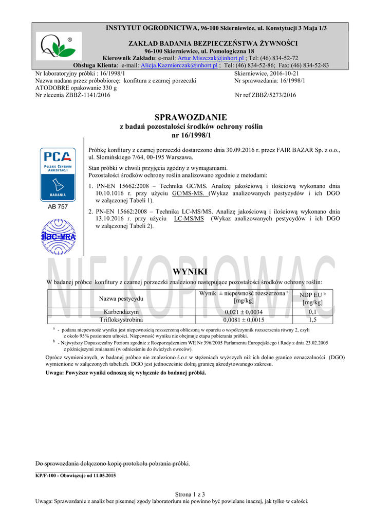 INSTYTUT OGRODNICTWA, 96-100 Skierniewice, ul. Konstytucji 3 Maja 1/3 ZAKŁAD BADANIA BEZPIECZEŃSTWA ŻYWNOŚCI 96-100 Skierniewice, ul. Pomologiczna 18 Kierownik Zakładu: e-mail: [email protected] ; Tel: (46) 834-52-72 Obsługa Klienta: e-mail: [email protected] ; Tel: (46) 834-52-86; Fax: (46) 834-52-83 Nr laboratoryjny próbki : 16/1998/1 Skierniewice, 2016-10-21 Nazwa nadana przez próbobiorcę: konfitura z czarnej porzeczki Nr sprawozdania: 16/1998/1 ATODOBRE opakowanie 330 g Nr zlecenia ZBBŻ-1141/2016 Nr ref ZBBŻ/5273/2016 SPRAWOZDANIE z badań pozostałości środków ochrony roślin nr 16/1998/1 Próbkę konfitury z czarnej porzeczki dostarczono dnia 30.09.2016 r. przez FAIR BAZAR Sp. z o.o., ul. Słomińskiego 7/64, 00-195 Warszawa. Stan próbki w chwili przyjęcia zgodny z wymaganiami. Pozostałości środków ochrony roślin analizowano zgodnie z metodami: 1. PN-EN 15662:2008 – Technika GC/MS. Analizę jakościową i ilościową wykonano dnia 10.10.1016 r. przy użyciu GC/MS-MS. (Wykaz analizowanych pestycydów i ich DGO w załączonej Tabeli 1). 2. PN-EN 15662:2008 – Technika LC-MS/MS. Analizę jakościową i ilościową wykonano dnia 13.10.2016 r. przy użyciu LC-MS/MS (Wykaz analizowanych pestycydów i ich DGO w załączonej Tabeli 2). WYNIKI WYNIKI W badanej próbce konfitury z czarnej porzeczki znaleziono następujące pozostałości środków ochrony roślin: Nazwa pestycydu Wynik ± niepewność rozszerzona a [mg/kg] NDP EU b [mg/kg] Karbendazym Trifloksystrobina 0,021 0,0034 0,0081 0,0015 0,1 1,5 a - podana niepewność wyniku jest niepewnością rozszerzoną obliczoną w oparciu o współczynnik rozszerzenia równy 2, czyli z około 95% poziomem ufności. Niepewność wyniku nie obejmuje etapu pobierania próbki. b - Najwyższy Dopuszczalny Poziom zgodnie z Rozporządzeniem WE Nr 396/2005 Parlamentu Europejskiego i Rady z dnia 23.02.2005 z późniejszymi zmianami (w odniesieniu do świeżych owoców). Oprócz wymienionych, w badanej próbce nie znaleziono ś.o.r w stężeniach wyższych niż ich dolne granice oznaczalności (DGO) wymienione w załączonych tabelach. DGO jest jednocześnie dolną granicą akredytowanego zakresu. Uwaga: Powyższe wyniki odnoszą się wyłącznie do badanej próbki. Do sprawozdania dołączono kopię protokołu pobrania próbki. ________________________________ KP/F-100 - Obowiązuje od 11.05.2015 Strona 1 z 3 Uwaga: Sprawozdanie z analiz bez pisemnej zgody laboratorium nie powinno być powielane inaczej, jak tylko w całości. INSTYTUT OGRODNICTWA, 96-100 Skierniewice, ul. Konstytucji 3 Maja 1/3 ZAKŁAD BADANIA BEZPIECZEŃSTWA ŻYWNOŚCI 96-100 Skierniewice, ul. Pomologiczna 18 Kierownik Zakładu: e-mail: [email protected] ; Tel: (46) 834-52-72 Obsługa Klienta: e-mail: [email protected] ; Tel: (46) 834-52-86; Fax: (46) 834-52-83 Nr laboratoryjny próbki : 16/1998/1 Skierniewice, 2016-10-21 Nazwa nadana przez próbobiorcę: konfitura z czarnej porzeczki Nr sprawozdania: 16/1998/1 ATODOBRE opakowanie 330 g Nr zlecenia ZBBŻ-1141/2016 Nr ref ZBBŻ/5273/2016 Tabela 1. Wykaz pestycydów i ich dolnych granic oznaczalności (DGO) – GC-MS/MS Lp. Nazwa pestycydu DGO mg/kg Lp. Nazwa pestycydu DGO mg/kg Lp. Nazwa pestycydu DGO mg/kg 1. 2. 3. 4. 5. 6. 7. 8. 9. 10. 11. 12. 13. 14. 15. 16. 17. 18. 19. 20. 21. 22. 23. 24. 25. 26. 27. 28. 29. 30. 31. 32. 33. 34. 35. 36. 37. 38. 39. 40. 41. 42. 43. 44. 45. 46. 47. 48. 49. 50. 51. 52. 53. 54. 55. 56. 57. 58. 59. 60. 61. 62. 63. 64. 65. 66. 67. 68. Acetochlor Akrynatryna Alachlor Aldryna Alletryna Ametryna Aminokarb Antrachinon Atrazyna Azakonazol Azynofos etylowy Azynofos metylowy Azoksystrobina Beflubutamid Benalaksyl Benfluralina Benfurakarb Bifenazat Bifenoks Bifentryna Bifenyl Bitertanol Boskalid Bromfenwinfos Bromocyklen Bromofos etylowy Bromofos metylowy Bromopropylat Bupirymat Buprofezyna Butachlor Butafenacyl Butylat Chinalfos Chinoksyfen Chinometionat Chlomazon Chlorbenzyd Chlorfenapyr Chlorfenson Chlorfenwinfos Chlorobenzylat Chlorobufam Chloromefos Chloropiryfos Chloropiryfos metylowy Chloroprofam Chloropropylan Chlorotalonil Chlortiofos Chlortion Cyflutryna gamma-Cyhalotryna lambda-Cyhalotryna Cyjanazyna Cyjanofenfos Cyjanofos Cykloat Cypermetryna Cyprodynil Cyprokonazol DDD-o,p DDD-p,p DDE-o,p DDE-p,p DDM DDT-o,p DDT-p,p 0,005 0,005 0,005 0,001 0,005 0,005 0,005 0,005 0,005 0,005 0,005 0,005 0,005 0,005 0,005 0,005 0,005 0,005 0,005 0,005 0,005 0,005 0,005 0,005 0,005 0,005 0,005 0,005 0,005 0,005 0,005 0,005 0,005 0,005 0,005 0,005 0,005 0,005 0,005 0,005 0,005 0,005 0,005 0,005 0,005 0,005 0,005 0,005 0,005 0,005 0,005 0,005 0,005 0,005 0,005 0,005 0,005 0,005 0,005 0,005 0,005 0,005 0,005 0,005 0,005 0,005 0,005 0,005 69. 70. 71. 72. 73. 74. 75. 76. 77. 78. 79. 80. 81. 82. 83. 84. 85. 86. 87. 88. 89. 90. 91. 92. 93. 94. 95. 96. 97. 98. 99. 100. 101. 102. 103. 104. 105. 106. 107. 108. 109. 110. 111. 112. 113. 114. 115. 116. 117. 118. 119. 120. 121. 122. 123. 124. 125. 126. 127. 128. 129. 130. 131. 132. 133. 134. 135. 136. Deltametryna Demeton-S Desmetryna Dialifos Diazynon Dichlobenil, Dichlobutrazol Dichlofention Dichlofluanid Dichloran Dichlorfos Dichloroanilina Dichlorobenzofenon Dieldryna Dietofenkarb Difenokonazol Difenyloamina Dikofol Dimetachlor Dimetoat Dimetomorf Dimetylochlorotal Dimoksystrobina Dinikonazol Dinitramina Dinobuton Dioksabenzofos Dioksakarb Dioksation Disulfoton Ditalimfos DMST Dodemorf Edifenfos alfa-Endosulfan beta-Endosulfan Endosulfan-siarczan Endryna EPN Epoksykonazol Esfenwalerat Etakonazol Etalfluralina Etion Etofenproks Etofumezat Etoksychina Etoprofos Etrimfos Fenamifos Fenarymol Fenazachina Fenbukonazol Fenchlorofos, Fenheksamid Fenitrotion Fenoksykarb Fenpropatryna Fenpropidyna Fenpropimorf Fention Fentoat Fenwalerat Fenylfenol Fipronil Fipronil desulfinyl Fluchinkonazol Fluchloralina 0,005 0,005 0,005 0,005 0,005 0,005 0,005 0,005 0,005 0,005 0,001 0,005 0,005 0,005 0,005 0,005 0,005 0,005 0,005 0,005 0,005 0,005 0,005 0,005 0,01 0,01 0,005 0,