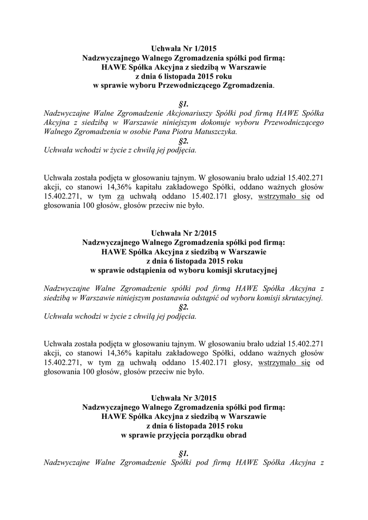 Uchwała Nr 1/2015 Nadzwyczajnego Walnego Zgromadzenia spółki pod firmą: HAWE Spółka Akcyjna z siedzibą w Warszawie z dnia 6 listopada 2015 roku w sprawie wyboru Przewodniczącego Zgromadzenia. §1. Nadzwyczajne Walne Zgromadzenie Akcjonariuszy Spółki pod firmą HAWE Spółka Akcyjna z siedzibą w Warszawie niniejszym dokonuje wyboru Przewodniczącego Walnego Zgromadzenia w osobie Pana Piotra Matuszczyka. §2. Uchwała wchodzi w życie z chwilą jej podjęcia. Uchwała została podjęta w głosowaniu tajnym. W głosowaniu brało udział 15.402.271 akcji, co stanowi 14,36% kapitału zakładowego Spółki, oddano ważnych głosów 15.402.271, w tym za uchwałą oddano 15.402.171 głosy, wstrzymało się od głosowania 100 głosów, głosów przeciw nie było. Uchwała Nr 2/2015 Nadzwyczajnego Walnego Zgromadzenia spółki pod firmą: HAWE Spółka Akcyjna z siedzibą w Warszawie z dnia 6 listopada 2015 roku w sprawie odstąpienia od wyboru komisji skrutacyjnej Nadzwyczajne Walne Zgromadzenie spółki pod firmą HAWE Spółka Akcyjna z siedzibą w Warszawie niniejszym postanawia odstąpić od wyboru komisji skrutacyjnej. §2. Uchwała wchodzi w życie z chwilą jej podjęcia. Uchwała została podjęta w głosowaniu tajnym. W głosowaniu brało udział 15.402.271 akcji, co stanowi 14,36% kapitału zakładowego Spółki, oddano ważnych głosów 15.402.271, w tym za uchwałą oddano 15.402.171 głosy, wstrzymało się od głosowania 100 głosów, głosów przeciw nie było. Uchwała Nr 3/2015 Nadzwyczajnego Walnego Zgromadzenia spółki pod firmą: HAWE Spółka Akcyjna z siedzibą w Warszawie z dnia 6 listopada 2015 roku w sprawie przyjęcia porządku obrad §1. Nadzwyczajne Walne Zgromadzenie Spółki pod firmą HAWE Spółka Akcyjna z siedzibą w Warszawie (dalej „Spółka”) niniejszym przyjmuje następujący porządek obrad: 1. otwarcie obrad Zgromadzenia, 2. wybór Przewodniczącego Zgromadzenia, 3. stwierdzenie prawidłowości zwołania Zgromadzenia i jego zdolności do podejmowania uchwał, 4. podjęcie uchwały w sprawie odstąpienia od wyboru komisji skrutacyjnej, 5. przyjęcie porządku obrad Zgromadzenia, 6. podjęcie uchwały w sprawie ustalenia liczby Członków Rady Nadzorczej Spółki,7. zamknięcie Zgromadzenia. §2. Uchwała wchodzi w życie z chwilą jej podjęcia. Uchwała została podjęta w głosowaniu tajnym. W głosowaniu brało udział 15.402.271 akcji, co stanowi 14,36% kapitału zakładowego Spółki, oddano ważnych głosów 15.402.271, w tym za uchwałą oddano 15.402.171 głosy, wstrzymało się od głosowania 100 głosów, głosów przeciw nie było. Uchwała Nr 4/2015 Nadzwyczajnego Walnego Zgromadzenia spółki pod firmą: HAWE Spółka Akcyjna z siedzibą w Warszawie z dnia 6 listopada 2015 roku w sprawie ustalenia liczby Członków Rady Nadzorczej Spółki Na podstawie §38 lit.b) Statutu Spółki Nadzwyczajne Walne Zgromadzenie postanawia: §1. Określa się liczbę członków Rady Nadzorczej Spółki na 8 (osiem). §2. Uchwała wchodzi w życie z chwilą jej podjęcia. Uchwała została podjęta w głosowaniu tajnym. W głosowaniu brało udział 15.402.271 akcji, co stanowi 14,36% kapitału zakładowego Spółki, oddano ważnych głosów 15.402.271, w tym za uchwałą oddano 15.402.171 głosy, wstrzymało się od głosowania 100 głosów, głosów przeciw nie było.