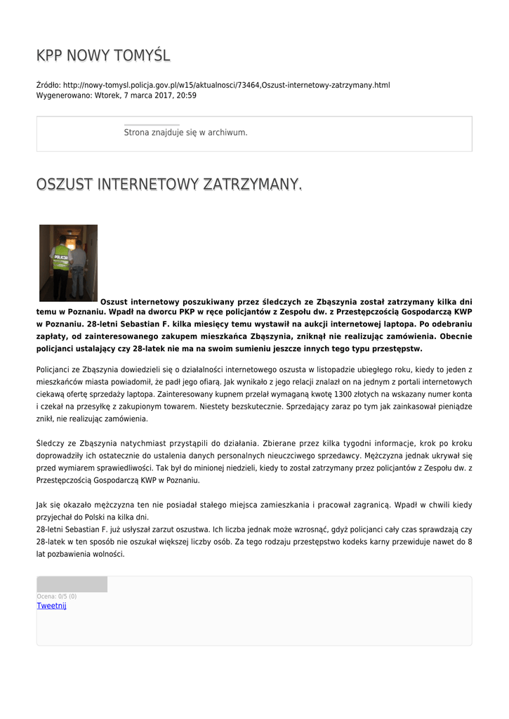KPP NOWY TOMYŚL Źródło: http://nowy-tomysl.policja.gov.pl/w15/aktualnosci/73464,Oszust-internetowy-zatrzymany.html Wygenerowano: Wtorek, 7 marca 2017, 20:59 Strona znajduje się w archiwum. OSZUST INTERNETOWY ZATRZYMANY. Oszust internetowy poszukiwany przez śledczych ze Zbąszynia został zatrzymany kilka dni temu w Poznaniu. Wpadł na dworcu PKP w ręce policjantów z Zespołu dw. z Przestępczością Gospodarczą KWP w Poznaniu. 28-letni Sebastian F. kilka miesięcy temu wystawił na aukcji internetowej laptopa. Po odebraniu zapłaty, od zainteresowanego zakupem mieszkańca Zbąszynia, zniknął nie realizując zamówienia. Obecnie policjanci ustalający czy 28-latek nie ma na swoim sumieniu jeszcze innych tego typu przestępstw. Policjanci ze Zbąszynia dowiedzieli się o działalności internetowego oszusta w listopadzie ubiegłego roku, kiedy to jeden z mieszkańców miasta powiadomił, że padł jego ofiarą. Jak wynikało z jego relacji znalazł on na jednym z portali internetowych ciekawą ofertę sprzedaży laptopa. Zainteresowany kupnem przelał wymaganą kwotę 1300 złotych na wskazany numer konta i czekał na przesyłkę z zakupionym towarem. Niestety bezskutecznie. Sprzedający zaraz po tym jak zainkasował pieniądze znikł, nie realizując zamówienia. Śledczy ze Zbąszynia natychmiast przystąpili do działania. Zbierane przez kilka tygodni informacje, krok po kroku doprowadziły ich ostatecznie do ustalenia danych personalnych nieuczciwego sprzedawcy. Mężczyzna jednak ukrywał się przed wymiarem sprawiedliwości. Tak był do minionej niedzieli, kiedy to został zatrzymany przez policjantów z Zespołu dw. z Przestępczością Gospodarczą KWP w Poznaniu. Jak się okazało mężczyzna ten nie posiadał stałego miejsca zamieszkania i pracował zagranicą. Wpadł w chwili kiedy przyjechał do Polski na kilka dni. 28-letni Sebastian F. już usłyszał zarzut oszustwa. Ich liczba jednak może wzrosnąć, gdyż policjanci cały czas sprawdzają czy 28-latek w ten sposób nie oszukał większej liczby osób. Za tego rodzaju przestępstwo kodeks karny przewiduje nawet do 8 lat pozbawienia wolności. Ocena: 0/5 (0) Tweetnij