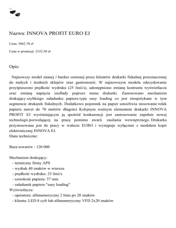 Nazwa: INNOVA PROFIT EURO EJ Cena: 3062.70 zł Cena w promocji: 2152.50 zł Opis: Najnowszy model znanej i bardzo cenionej przez klientów drukarki fiskalnej przeznaczonej do małych i średnich sklepów oraz gastronomii. W najnowszym modelu zdecydowanie przyśpieszono prędkość wydruku (25 linii/s), udostępniono zmianę kontrastu wyświetlacza oraz zmianę napięcia szuflady poprzez menu drukarki. Zastosowano mechanizm drukujący szybkiego załadunku papieru typu easy loading co jest niespotykane w tym segmencie drukarek fiskalnych. Dodatkowo pojemnik na papier umożliwia stosowanie rolek papieru nawet do 70 metrów długości. Kolejnym ważnym elementem drukarki INNOVA PROFIT EJ wyróżniającym ją spośród konkurencji jest zastosowanie zupełnie nowej technologii pozwalającej na pracę pomimo awarii zasilania wewnętrznego. Drukarka przystosowana jest do pracy w walucie EURO i występuje wyłącznie z modułem kopii elektronicznej INNOVA EJ. Dane techniczne: Baza towarów : 120 000 Mechanizm drukujący: - termiczny firmy APS - wydruk 40 znaków w wierszu - prędkość wydruku: 25 linii/s - szerokość papieru: 57 mm - załadunek papieru "easy loading" Wyświetlacze: - operatora: alfanumeryczny 2 linie po 20 znaków - klienta: LED 8 cyfr lub alfanumeryczny VFD 2x20 znaków Wybór napięcia sterującego szufladą na pieniądze z poziomu menu drukarki: -6V - 12 V - 24 V Komunikacja z komputerem: - RS232C - USB Moduł kopii elektronicznej INNOVA EJ: - całkowicie bezobsługowy (bez konieczności szkolenia personelu) - pojemność wystarczająca na cały okres użytkowania - dostęp do kopii paragonów przez: - złącze USB drukarki (nie przerywając pracy kasjera) - MENU drukarki - włożenie modułu do komputera (USB) - dostępny dla użytkownika - zabezpieczony przez kradzieżą Wymiary (mm): - szerokość: 194 - głębokość: 230 - wysokość: 161 Waga: ok 2 kg Wszystkie podane ceny, są cenami netto do których należy doliczyć podatek VAT. Cennik nie stanowi oferty handlowej w rozumieniu art. 66 par.1 Kodeksu Cywilnego