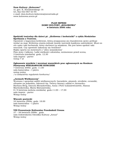 Dom Kultury „Kolorowa” ul. gen. K. Sosnkowskiego 16 tel./fax 022 867 63 95 e-mail: [email protected] www.kolorowa.arsus.pl PLAN IMPREZ DOMU KULTURY „KOLOROWA” w kwietniu 2006 roku Spektakl teatralny dla dzieci pt. „Królewna i herbatniki” z cyklu Niedzielne Spotkania z Teatrem. Opowieœã o kapryœnej królewnie, któr¹ zrozpaczony jej charakterem ojciec próbuje wydaã za m¹¿. Królewna stawia jednak twardy warunek ka¿demu zalotnikowi. Musi on oto upiec taki herbatnik, który zachwyci j¹ smakiem. Nie jest ùatwo speùniã taki warunek. Czy opowieœã zakoñczy siê weselem? Bajka oparta na motywach z "ulicy sezamkowej" Plan ¿ywy i lalkowy. Lalki wielkoœci czùowieka, animowane przed scen¹. 2 kwietnia (niedziela) godz. 12.30 sala imprez - parter wstêp 7 zù Ogùoszenie wyników i wernisa¿ wszystkich prac zgùoszonych na Konkurs Plastyczny WIELKANOCNE KURCZAKI 7 kwietnia 2006r. godz. 11.00 sala kameralna – I piêtro wstêp wolny /w zaù¹czeniu regulamin konkursu/ „Jarmark Wielkanocny” Wystawa i sprzeda¿ ozdób wielkanocnych: baranków, pisanek, stroików, ceramiki, obrazów na jedwabiu, bi¿uterii itp. Twórcy bior¹cy udziaù w Jarmarku: Barbara Berg, Danuta Morzykowska, Anna i Piotr £ukasiewiczowie, Hanna Machnikowska, Maria Matuszewska. 8 i 9 kwietnia (sobota-niedziela) godz.11.00 – 17.00 sala imprez - parter Wstêp wolny Wieczór poetycki 24 kwietnia 2006r. godz. 18.00 sala kameralna – I piêtro Wstêp wolny VIII Prezentacje Kulturalne Przedszkoli Ursusa 27 – 28 kwietnia 2006r. godz. sala widowiskowa Oœrodka Kultury „Arsus” Wstêp wolny