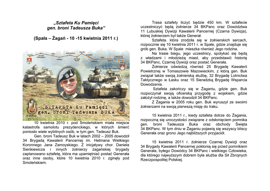 „Sztafeta Ku Pamięci gen. broni Tadeusza Buka” (Spała – Żagań - 10 -15 kwietnia 2011 r.) 10 kwietnia 2010 r. pod Smoleńskiem miała miejsce katastrofa samolotu prezydenckiego, w których śmierć poniosło wiele wybitnych osób, w tym gen. Tadeusz Buk. Gen. broni Tadeusz Buk w latach 2002 – 2005 dowodził 34 Brygadą Kawalerii Pancernej im. Hetmana Wielkiego Koronnego Jana Zamoyskiego. Z inicjatywy chor. Daniela Sienkiewicza i innych żołnierzy żagańskiej brygady zaplanowano sztafetę, która ma upamiętniać postać Generała oraz inne osoby, które 10 kwietnia 2010 r. zginęły pod Smoleńskiem. Trasa sztafety liczyć będzie 450 km. W sztafecie uczestniczyć będą żołnierze 34 BKPanc oraz Dowództwa 11 Lubuskiej Dywizji Kawalerii Pancernej (Czarna Dywizja), której żołnierzem był także Generał. Sztafeta. która zrodziła się w żołnierskich sercach, rozpocznie się 10 kwietnia 2011 r. w Spale, gdzie znajduje się grób gen. Buka. W Spale mieszka również Jego rodzina. Na trasie biegu, jego uczestnicy, spotykać się będą z władzami i młodzieżą miast, aby przedstawić historię 34 BKPanc, Czarnej Dywizji oraz postać Generała. Żołnierze odwiedzą również 25 Brygadę Kawalerii Powietrznej w Tomaszowie Mazowieckim, z którą gen. Buk związał także swoją żołnierską służbę, 32 Brygadę Lotnictwa Taktycznego w Łasku oraz 15 Sieradzką Brygadę Wsparcia Dowodzenia. Sztafeta zakończy się w Żaganiu, gdzie gen. Buk rozpoczynał swoją oficerską przygodę z wojskiem, gdzie założył rodzinę, a także dowodził 34 BKPanc. Z Żagania w 2005 roku gen. Buk wyruszył ze swoimi żołnierzami na swoją pierwszą misję do Iraku. 15 kwietnia 2011 r., kiedy sztafeta dotrze do Żagania, rozpoczną się uroczystości związane z odsłonięciem pomnika gen. broni Tadeusza Buka oraz obchody Święta 34 BKPanc. W tym dniu w Żaganiu pojawią się wszyscy bliscy Generała oraz grono Jego najbliższych przyjaciół. 15 kwietnia 2011 r. żołnierze Czarnej Dywizji oraz 34 Brygady Kawalerii Pancernej pokłonią się przed pomnikiem Generała, byłego Dowódcy 34 BKPanc i wielkiego Człowieka, dla którego najwyższym dobrem była służba dla Sił Zbrojnych Rzeczpospolitej Polskiej. Gen. broni Tadeusz Buk (1960-2010) Gen. Buk urodził się 15 grudnia 1960 r. Generał był absolwentem Wyższej Szkoły Oficerskiej Wojsk Pancernej w Poznaniu, którą ukończył w 1984 r. W tym samym roku rozpoczął służbę w 29 pułku czołgów w Żaganiu, gdzie dowodził plutonem, kompanią i batalionem czołgów. Generał pełnił służbę na różnych stanowiskach dowódczo-sztabowych w 6 Brygadzie Desantowo – Szturmowej i 25 Dywizji Kawalerii Powietrznej, przemianowanej na 25 Brygadę Kawalerii Powietrznej. W grudniu 2002 r. objął dowodzenie 34 Brygadą Kawalerii Pancernej, wchodzącej w skład Czarnej Dywizji. 15 sierpnia 2004 r. został mianowany do stopnia generała brygady, będąc pierwszym dowódcą 34 BKPanc w stopniu generalskim. Od stycznia do lipca 2005 r. był zastępcą dowódcy Wielonarodowej Dywizji Centrum – Południe w Iraku, w ramach IV zmiany Polskiego Kontyngentu Wojskowego. Po misji w Iraku, w 2005 r. objął stanowisko zastępcy dyrektora Centrum Szkolenia Sił Połączonych NATO. W 2007 r. został zastępcą dowódcy Dowództwa Koalicyjnego w Afganistanie. W 2007 roku objął także dowodzenie 1 Warszawską Dywizją Zmechanizowaną. W lipcu 2007 r. został mianowany do stopnia generała dywizji i wyznaczony na dowódcę IX zmiany Polskiego Kontyngentu Wojskowego w Iraku. 15 września 2009 r. Prezydent RP, Lech Kaczyński, wyznaczył generała Buka na stanowisko dowódcy Wojsk Lądowych. 10 kwietnia 2010 r. gen. Tadeusz Buk zginął śmiercią tragiczną w katastrofie samolotu prezydenckiego pod Smoleńskiem, w drodze na obchody 70. rocznicy Zbrodni Katyńskiej. Pośmiertnie został mianowany do stopnia generała broni. Generał Buk wita się z żołnierzami 34 Brygady Kawalerii Pancernej, Żagań,17.08. 2004 r. Gen. broni Tadeusz Buk był wybitnym żołnierzem, posiadającym ogromny autorytet wśród swoich podwładnych. Jego śmierć osierociła Jego rodzinę, przyjaciół, żołnierzy Wojsk Lądowych oraz pancerniaków Czarnej Dywizji.